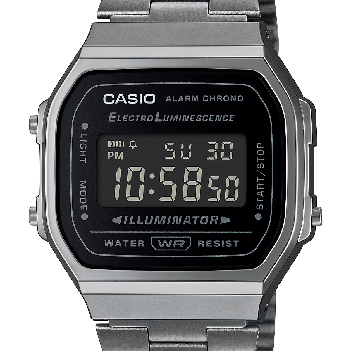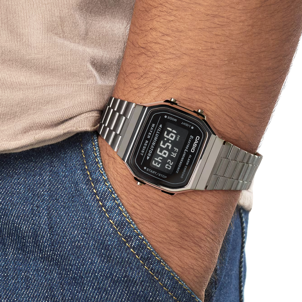 Die CASIO A168WEGG-1 kommt mit einem grauen, matt gebürstetem Edelstahlarmband, silbergrauem Gehäuse und schwarzem Display. Ikonisches Retro Design auf einem digitalen CASIO Klassiker. Ein eleganter Look und pure Vintage-Raffinesse.