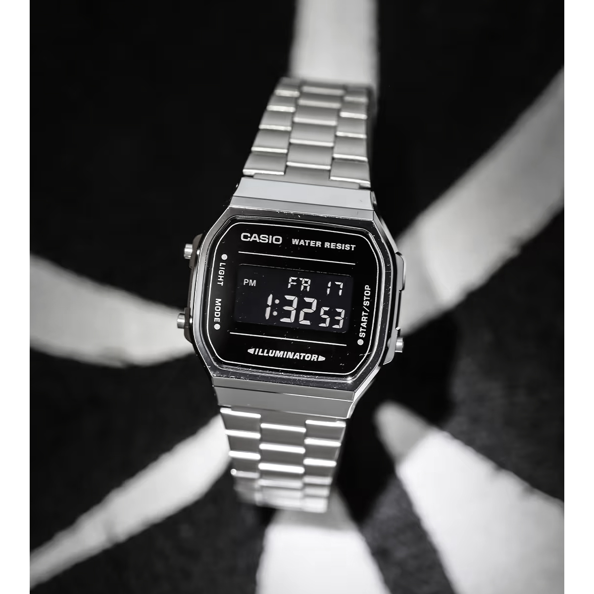 Die CASIO A168WEM-1 kommt mit einem Edelstahlarmband, silbernem Gehäuse und schwarzem Display. Ikonisches Retro Design auf einem digitalen CASIO Klassiker. Ein eleganter Look und pure Vintage-Raffinesse.