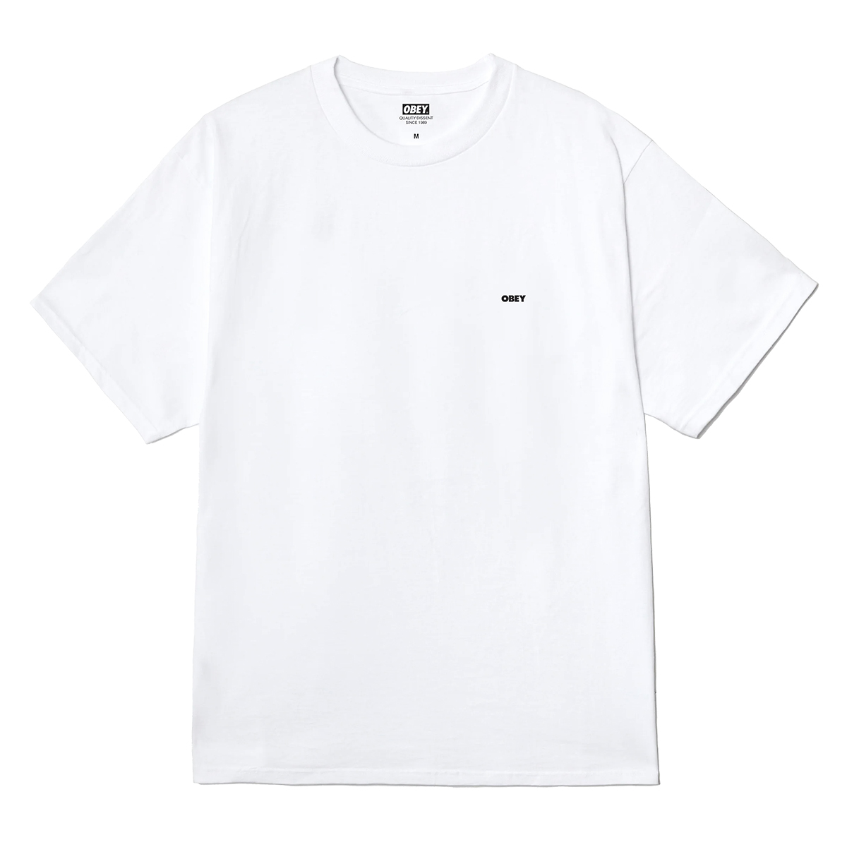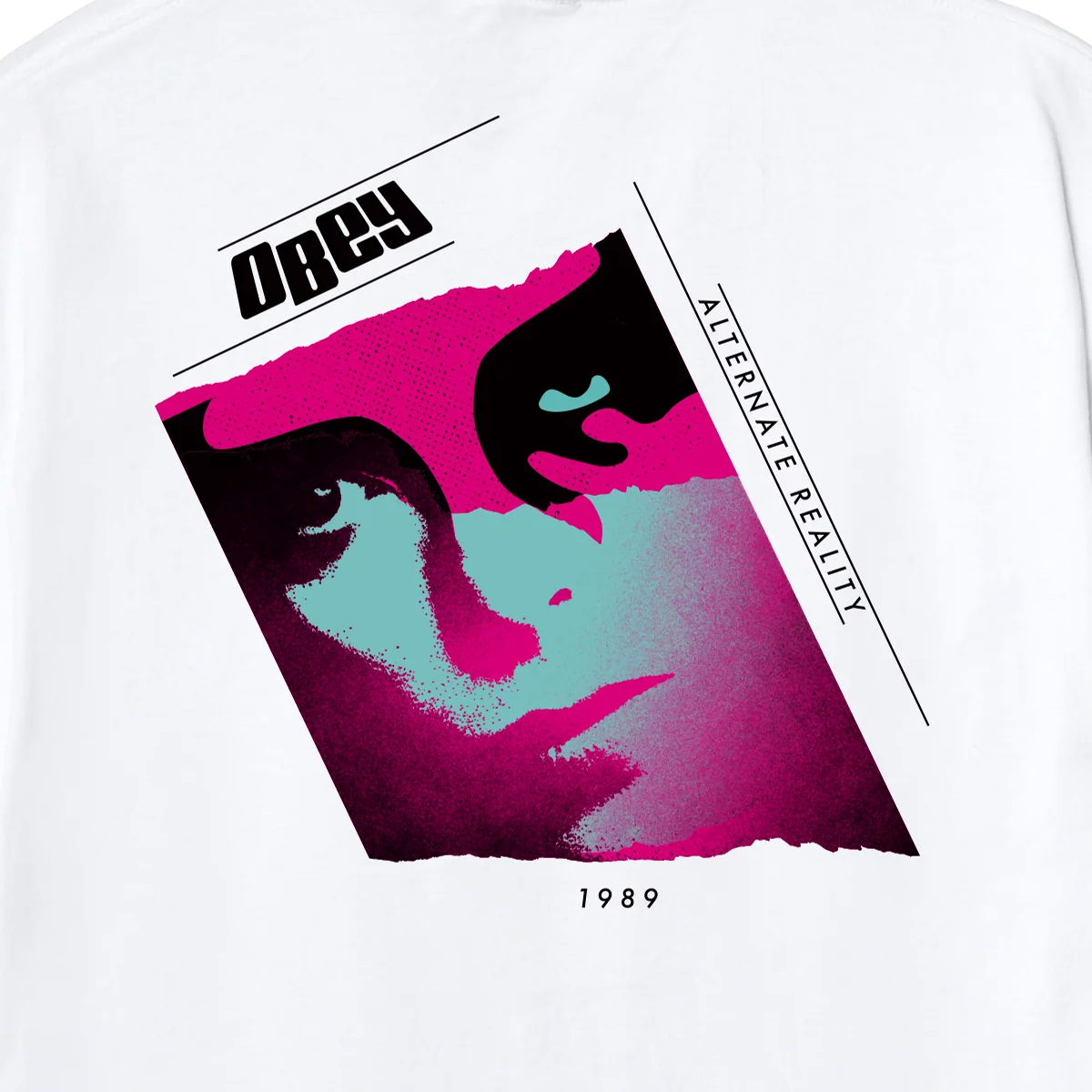 Weißes OBEY Alternate Reality T-Shirt aus 100% Cotton (170g/m Single Jersey) mit gedrucktem Artwork auf der linken Brust und dem Rücken.