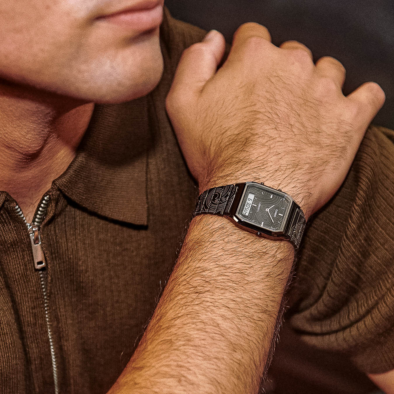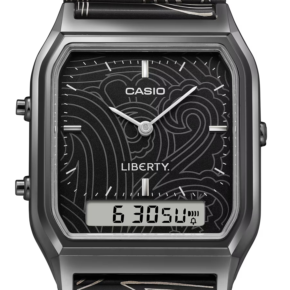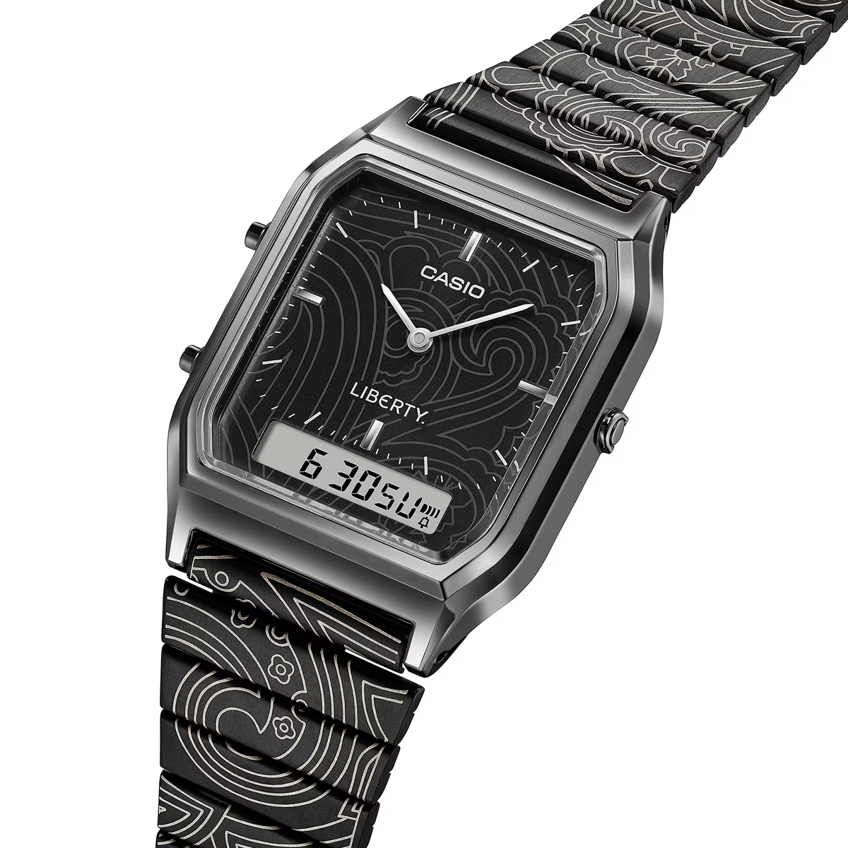 Für diese Limited Edition bekommt die beliebte AQ-230 mit ihrem markanten Zifferblatt und der Analog-Digital-Anzeige ein neues Gewand: ein Muster, inspiriert von Libertys berühmtem Paisley Design. Die klaren Linien der Uhr stehen im spannenden Gegensatz zu den geschwungenen Formen des Paisleydesigns auf Band und Zifferblatt, welches per Lasergravur veredelt wurde.