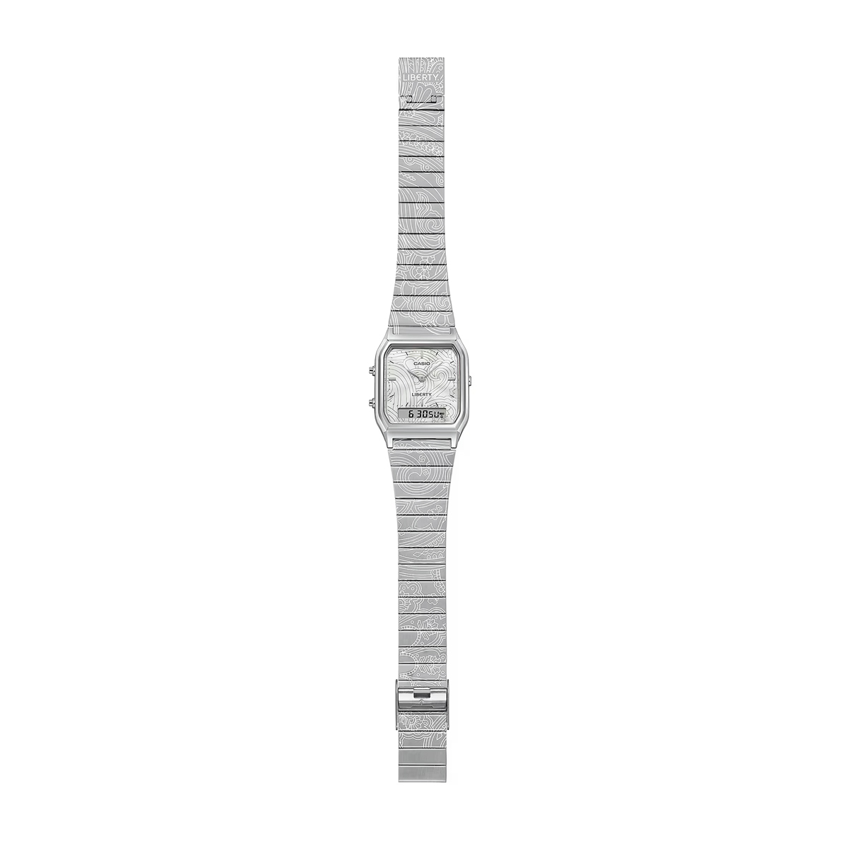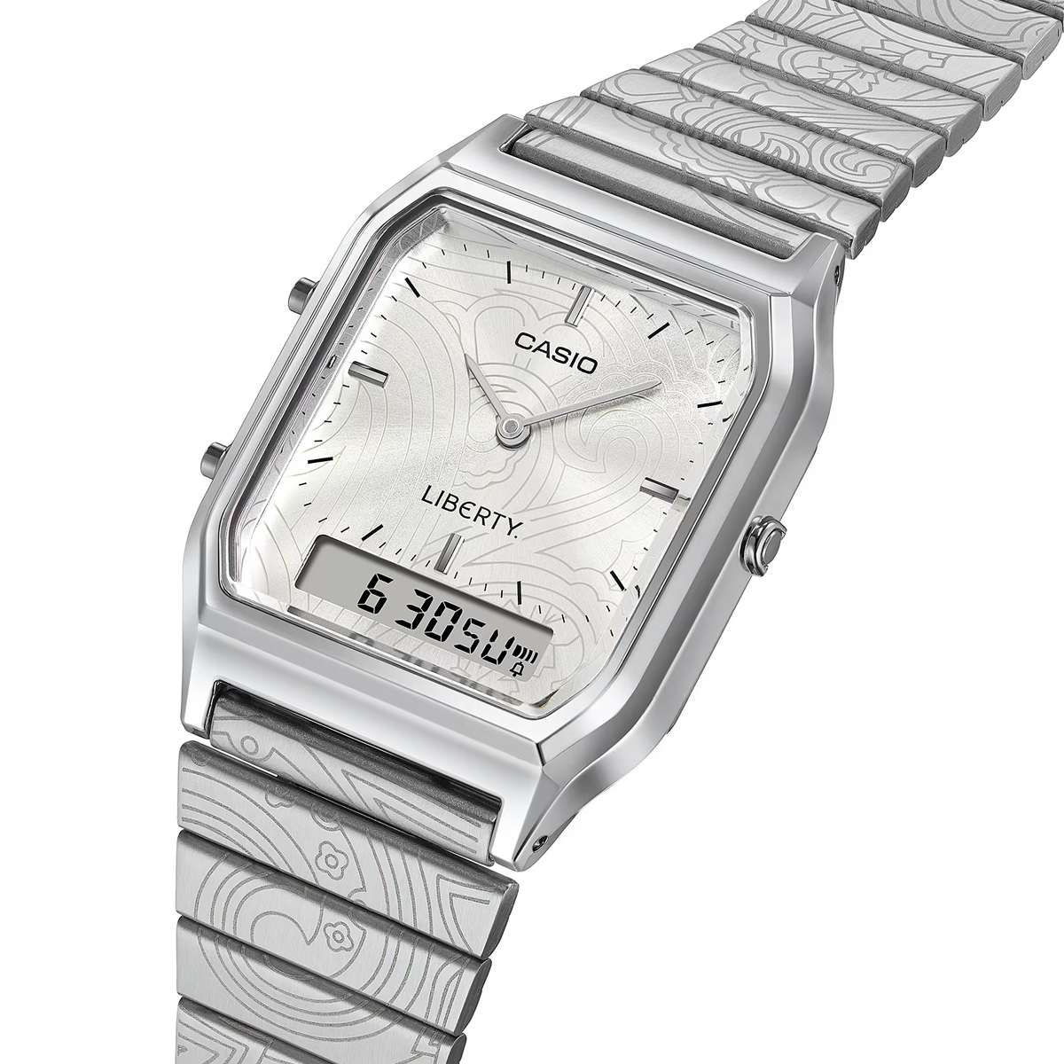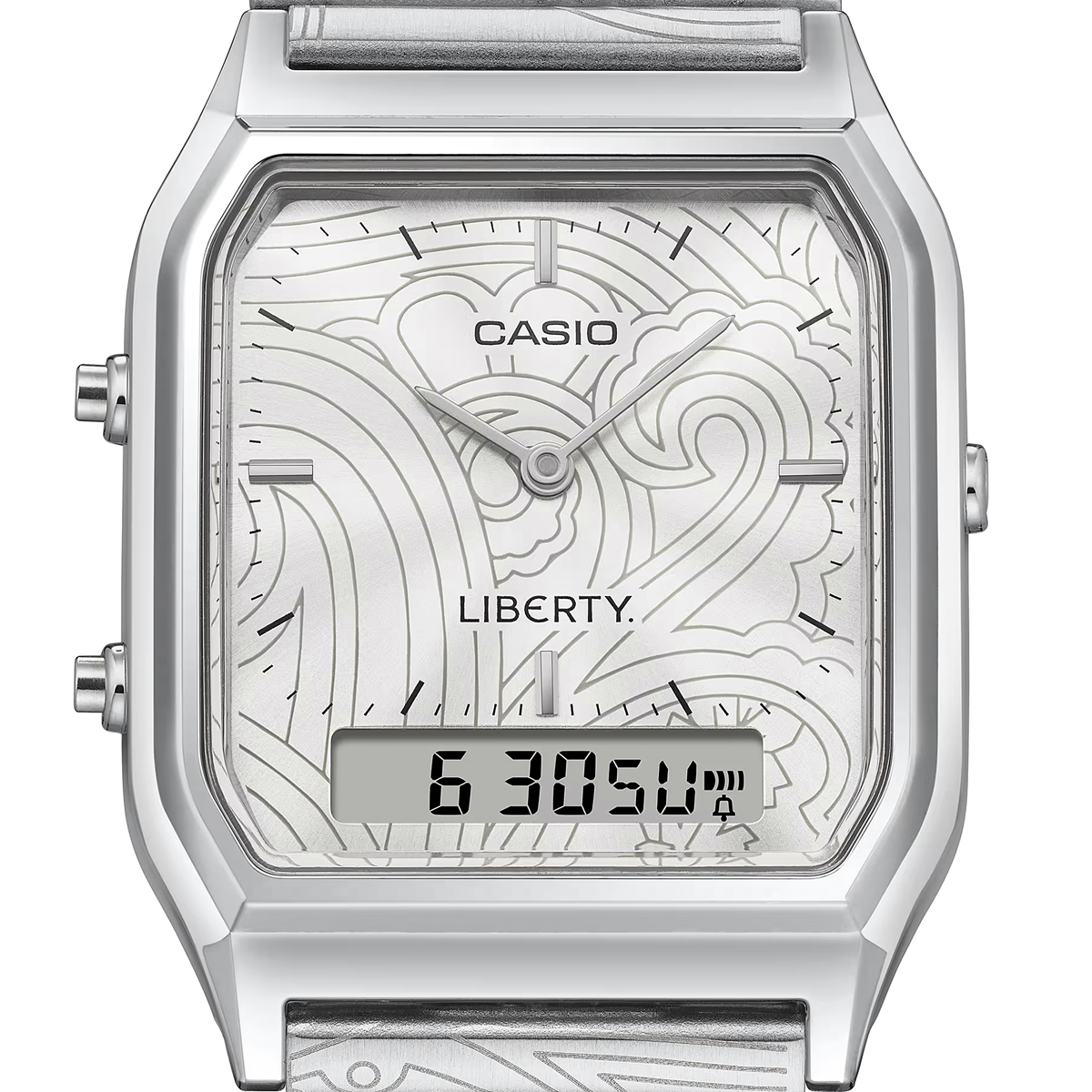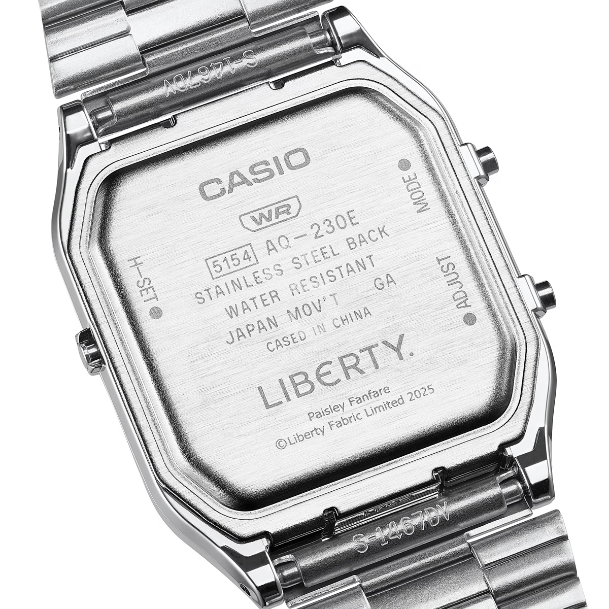 Für diese Limited Edition bekommt die beliebte AQ-230 mit ihrem markanten Zifferblatt und der Analog-Digital-Anzeige ein neues Gewand: ein Muster, inspiriert von Libertys berühmtem Paisley Design. Die klaren Linien der Uhr stehen im spannenden Gegensatz zu den geschwungenen Formen des Paisleydesigns auf Band und Zifferblatt, welches per Lasergravur veredelt wurde.