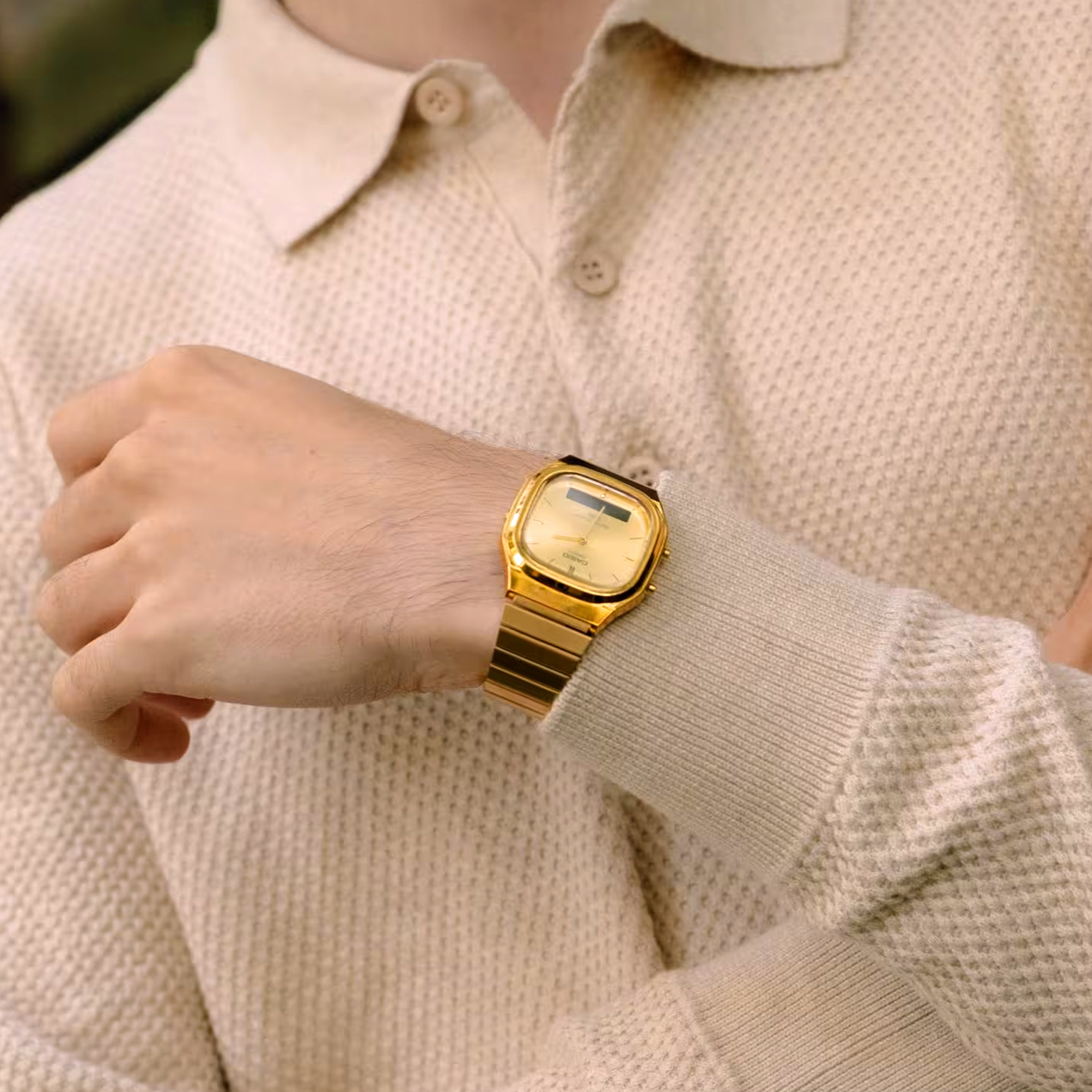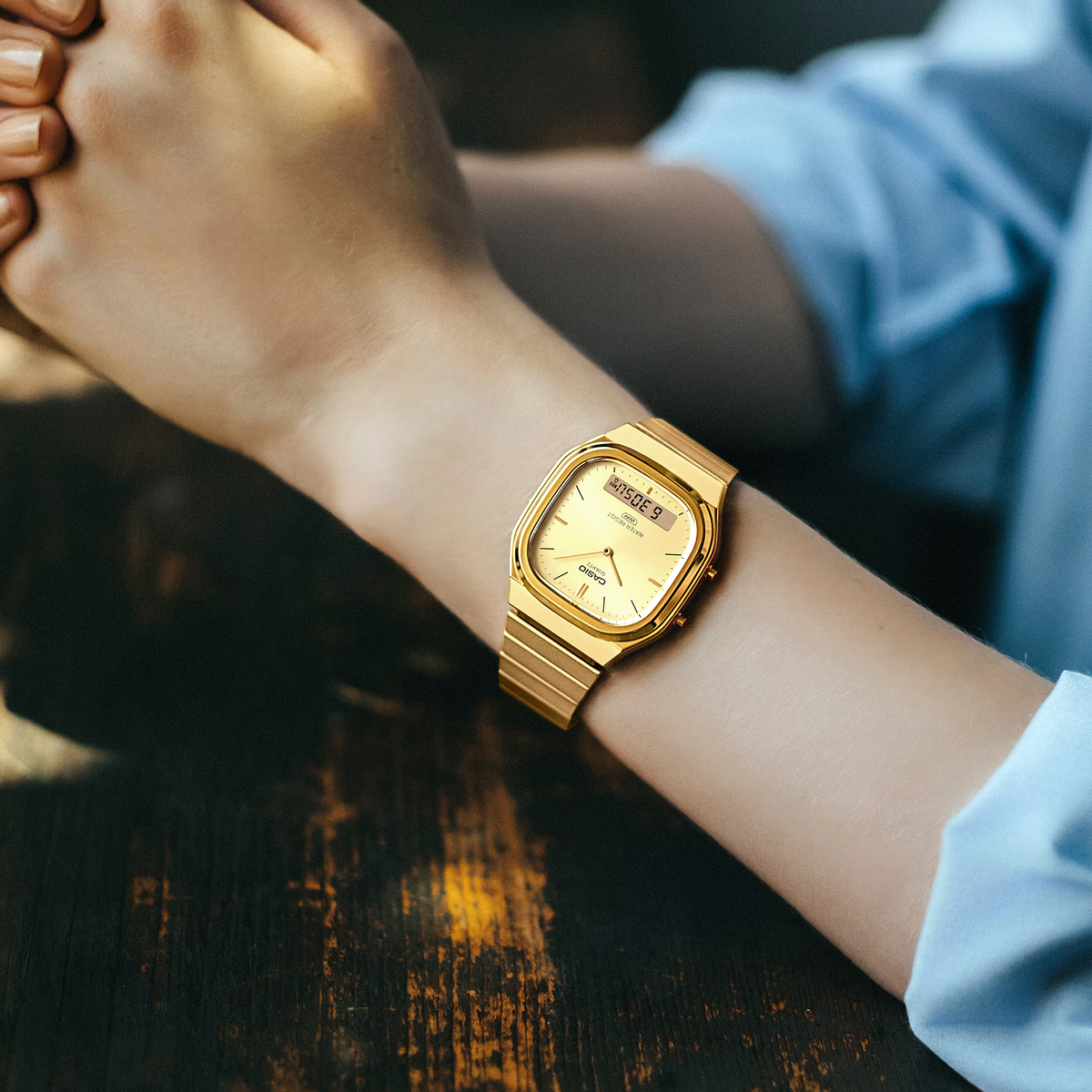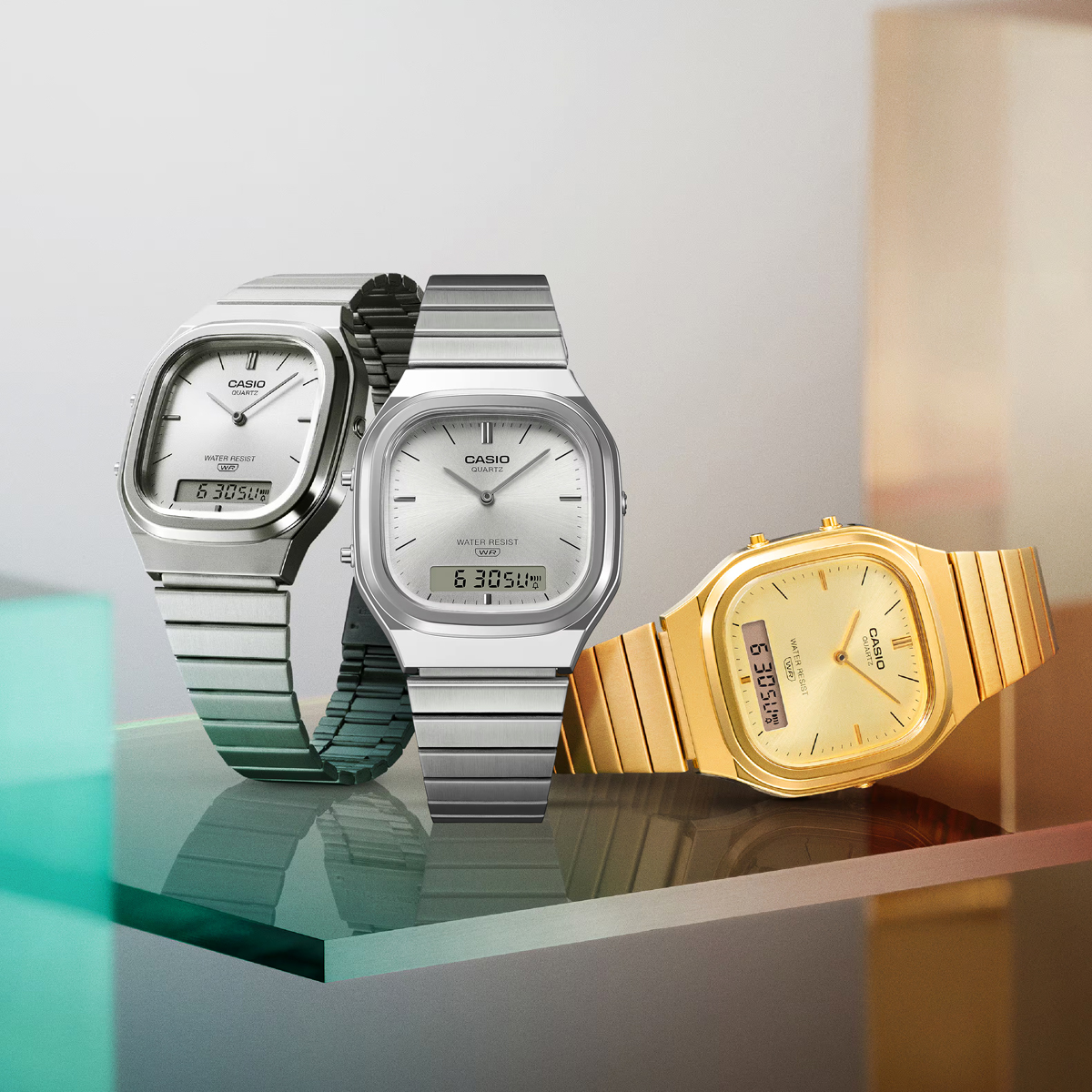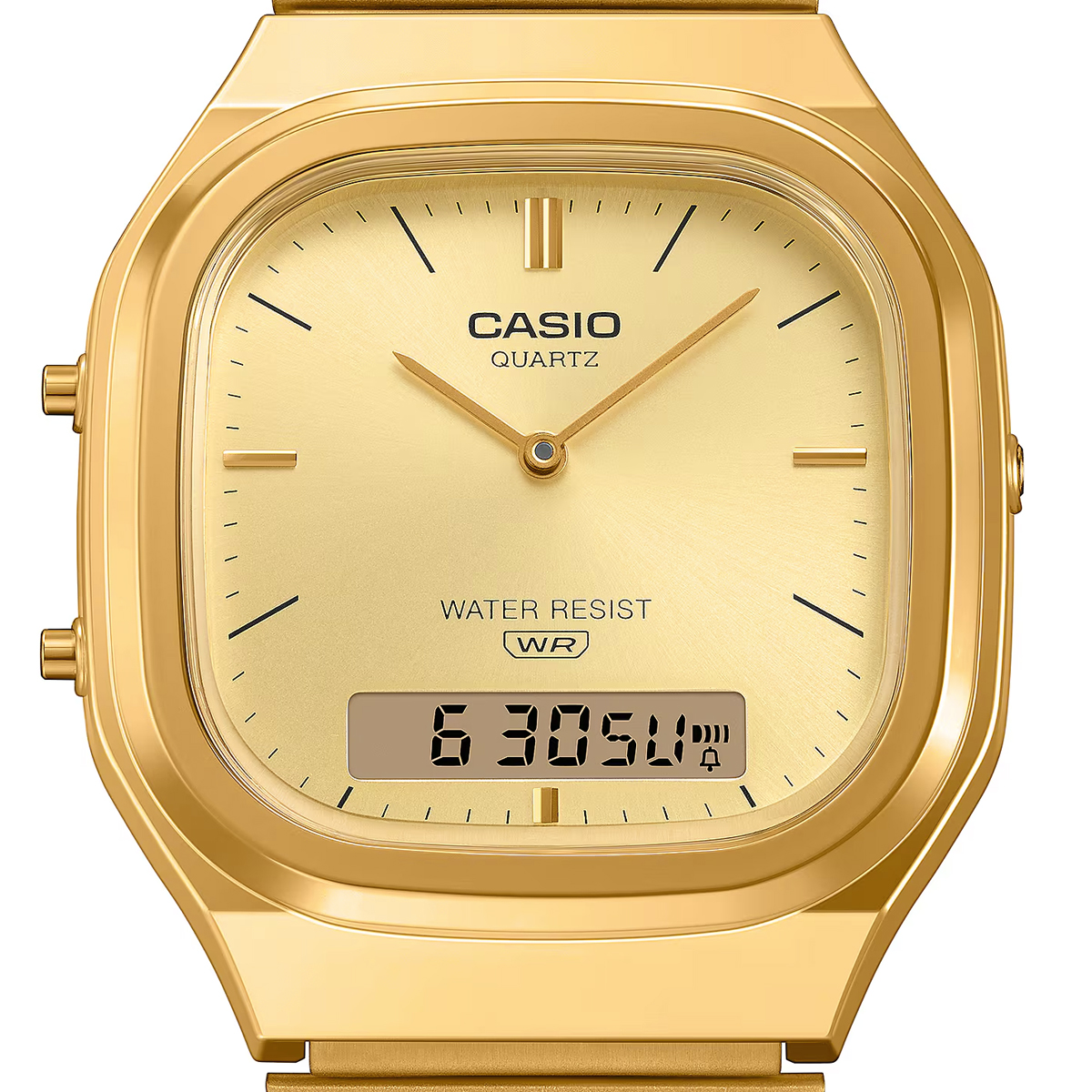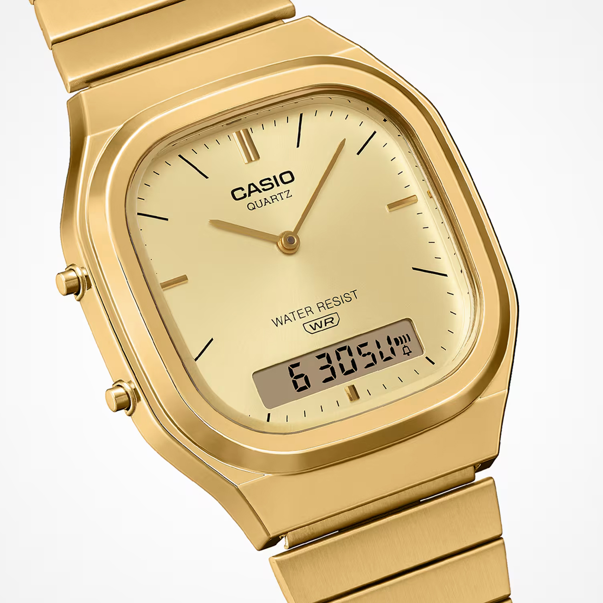 Die analog-digitale AQ-240 kombiniert klassische Formen mit einem frischen Look. Das leicht eckige Zifferblatt wirkt durch das sanft gerundete Gehäuse ausgewogen und elegant.