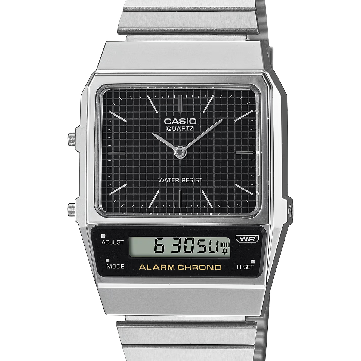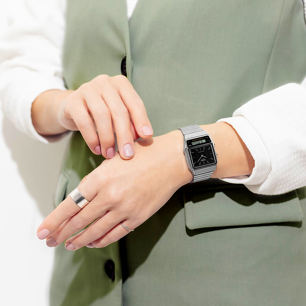 Die AQ-800E im Retro-Vintage-Stil ist eine modernen Interpretation des AQ-450-Designs aus den 1980er-Jahren. Ein separates Zifferblatt und die LCD-Anzeige sorgen für analoge Schönheit und digitale Leistung. Die LCD-Anzeige ist leicht geneigt und folgt den Linien der Ösen, während das analoge Zifferblatt einfache Strichmarkierungen aufweist. Das mit einem Gittermuster verzierte Zifferblatt verleiht der Uhr den letzten Schliff und steht für echtes Retro-Feeling. Die schlichte und stilvolle Kombination aus abgeschrägtem Gehäuse und den geraden Gliedern des Metallarmbandes ist von der Idee struktureller Schönheit inspiriert.