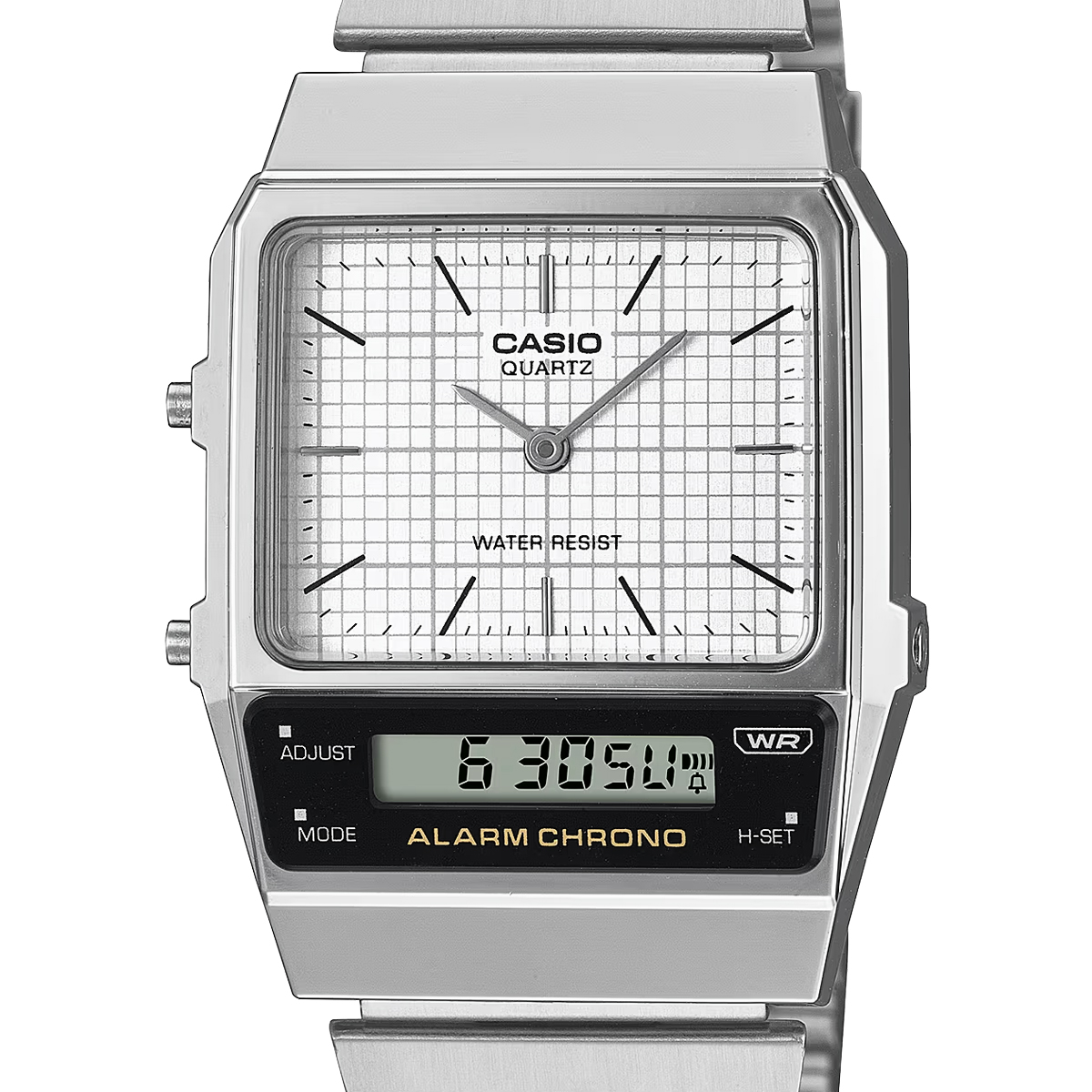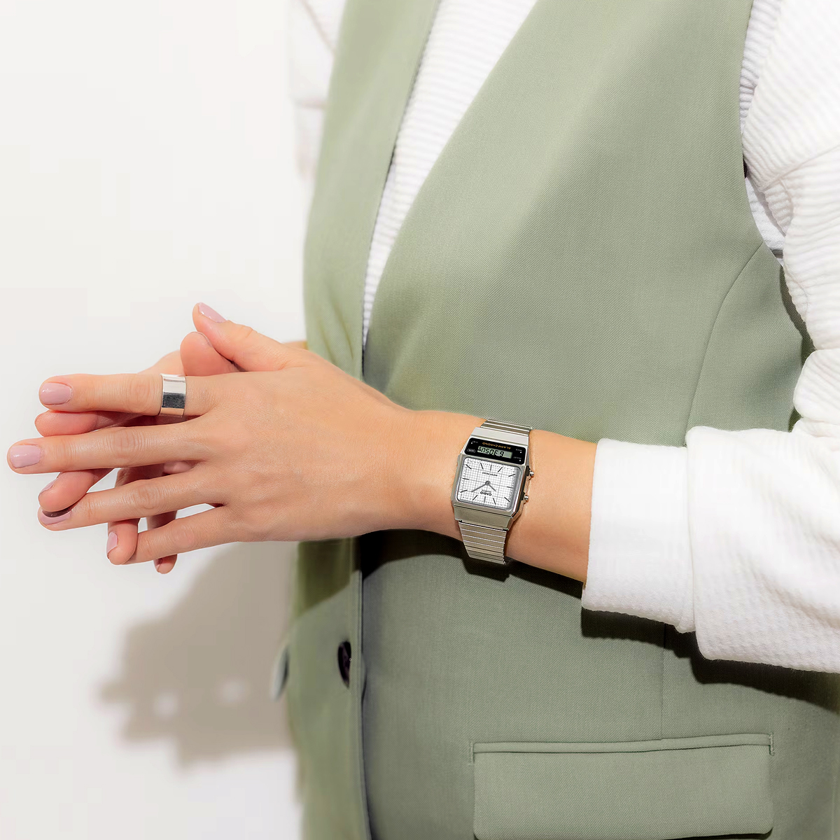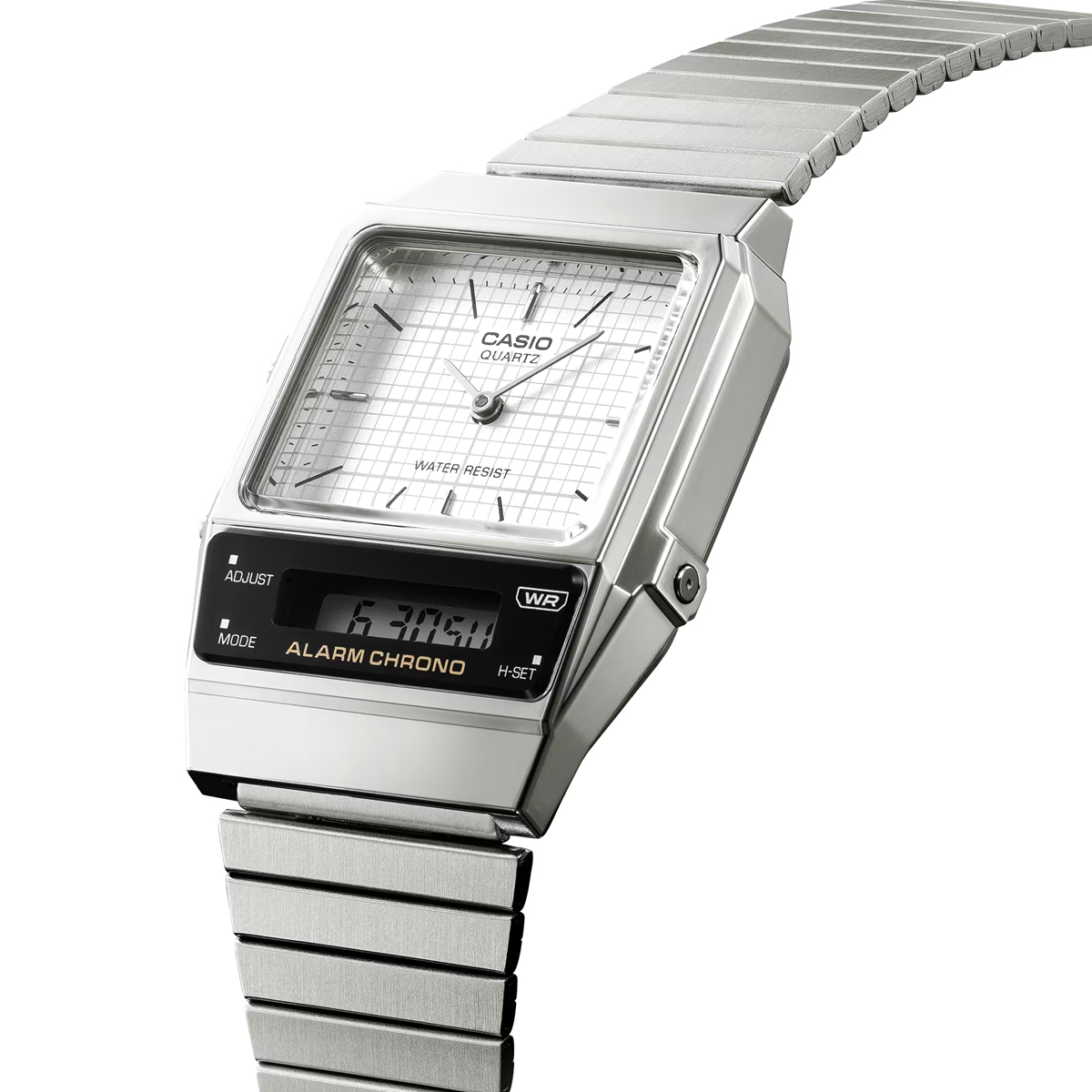 Die AQ-800E im Retro-Vintage-Stil ist eine modernen Interpretation des AQ-450-Designs aus den 1980er-Jahren. Ein separates Zifferblatt und die LCD-Anzeige sorgen für analoge Schönheit und digitale Leistung. Die LCD-Anzeige ist leicht geneigt und folgt den Linien der Ösen, während das analoge Zifferblatt einfache Strichmarkierungen aufweist. Das mit einem Gittermuster verzierte Zifferblatt verleiht der Uhr den letzten Schliff und steht für echtes Retro-Feeling. Die schlichte und stilvolle Kombination aus abgeschrägtem Gehäuse und den geraden Gliedern des Metallarmbandes ist von der Idee struktureller Schönheit inspiriert.