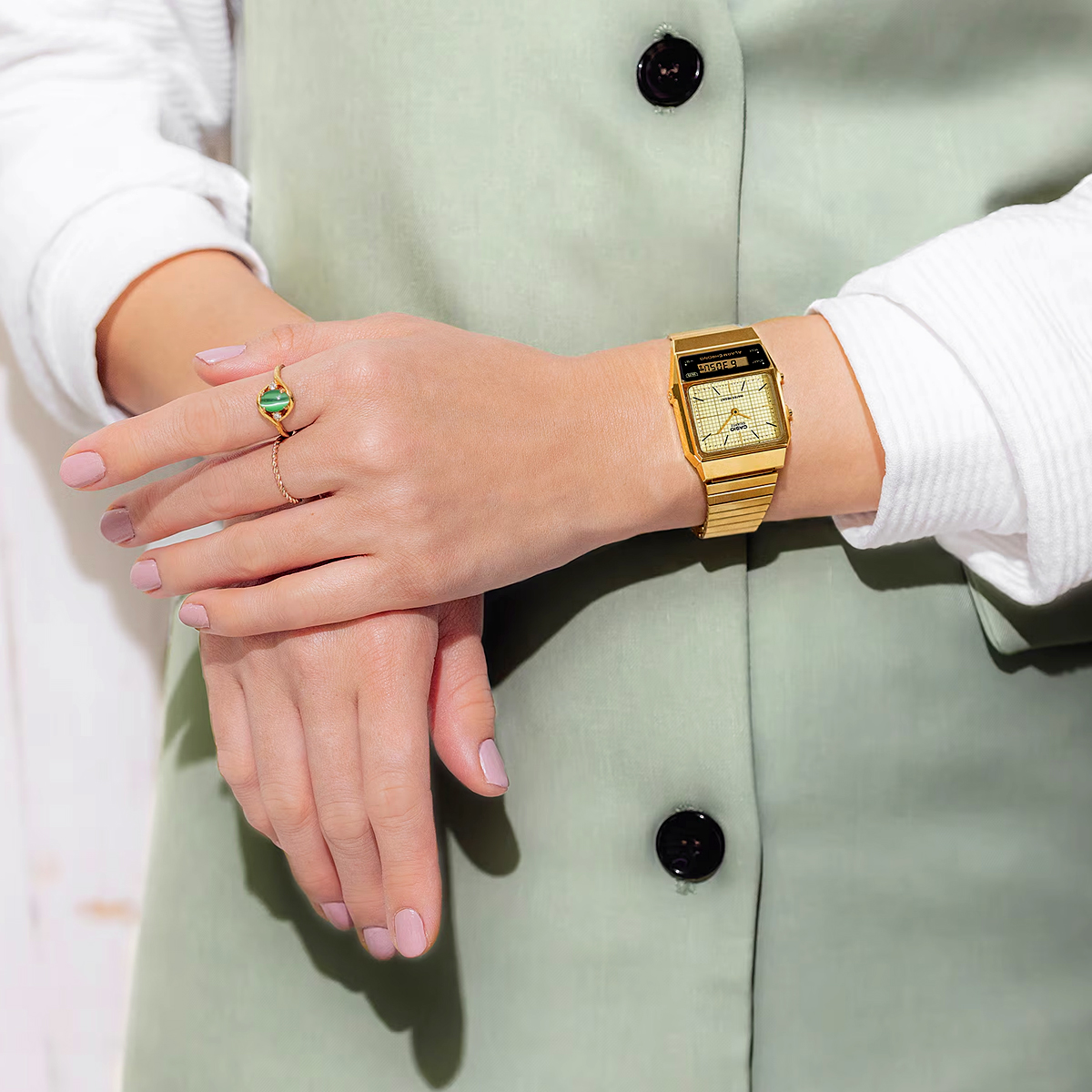 Die AQ-800E im Retro-Vintage-Stil ist eine modernen Interpretation des AQ-450-Designs aus den 1980er-Jahren. Ein separates Zifferblatt und die LCD-Anzeige sorgen für analoge Schönheit und digitale Leistung. Die LCD-Anzeige ist leicht geneigt und folgt den Linien der Ösen, während das analoge Zifferblatt einfache Strichmarkierungen aufweist. Das mit einem Gittermuster verzierte Zifferblatt verleiht der Uhr den letzten Schliff und steht für echtes Retro-Feeling. Die schlichte und stilvolle Kombination aus abgeschrägtem Gehäuse und den geraden Gliedern des Metallarmbandes ist von der Idee struktureller Schönheit inspiriert.