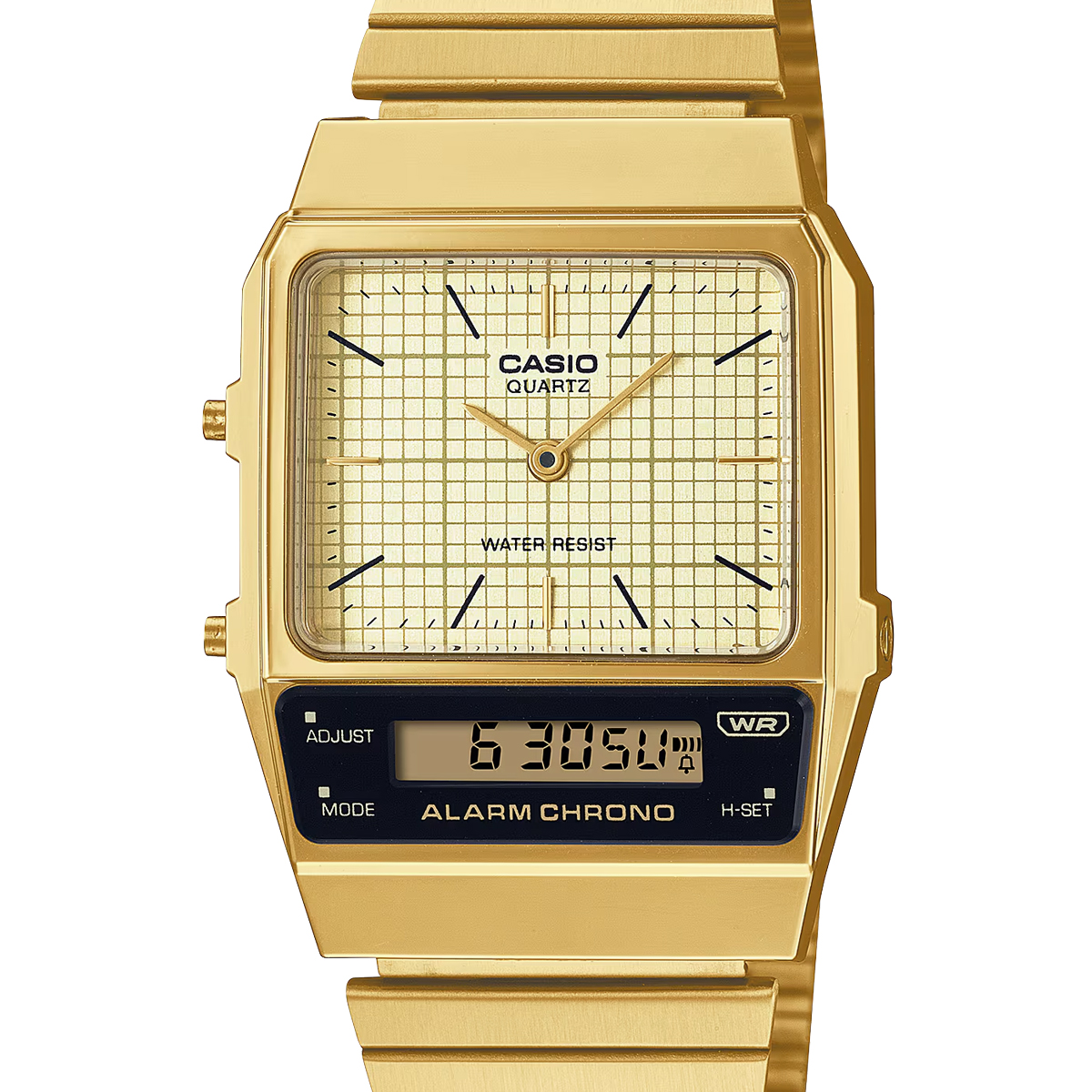 Die AQ-800E ist aber mehr als nur ein modisches Statement. Sie bietet praktische Funktionen wie Dualzeit, Stoppuhr und Alarm und ist zudem wasserabweisend.
