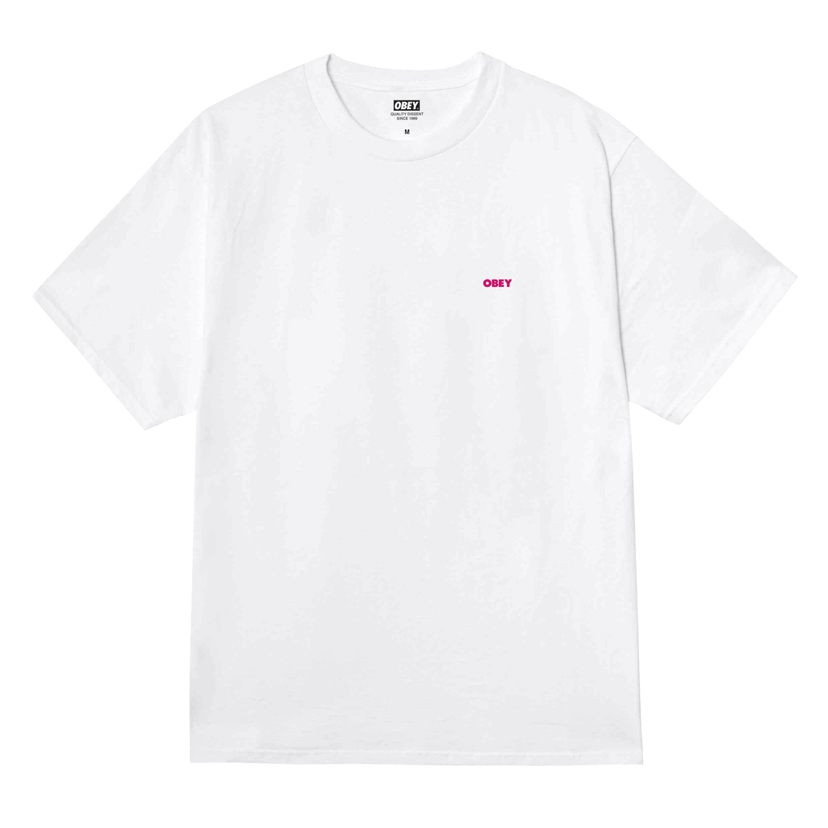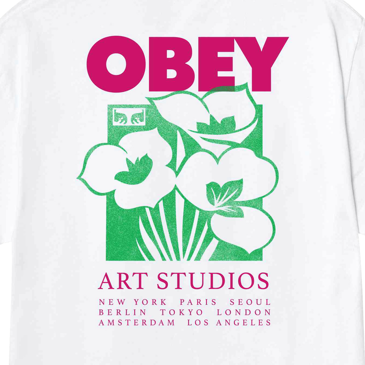Weißes OBEY Art Studio Flowers T-Shirt aus 100% Cotton (170g/m Single Jersey) mit gedrucktem Artwork auf der linken Brust und dem Rücken.