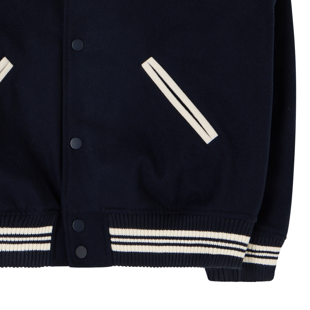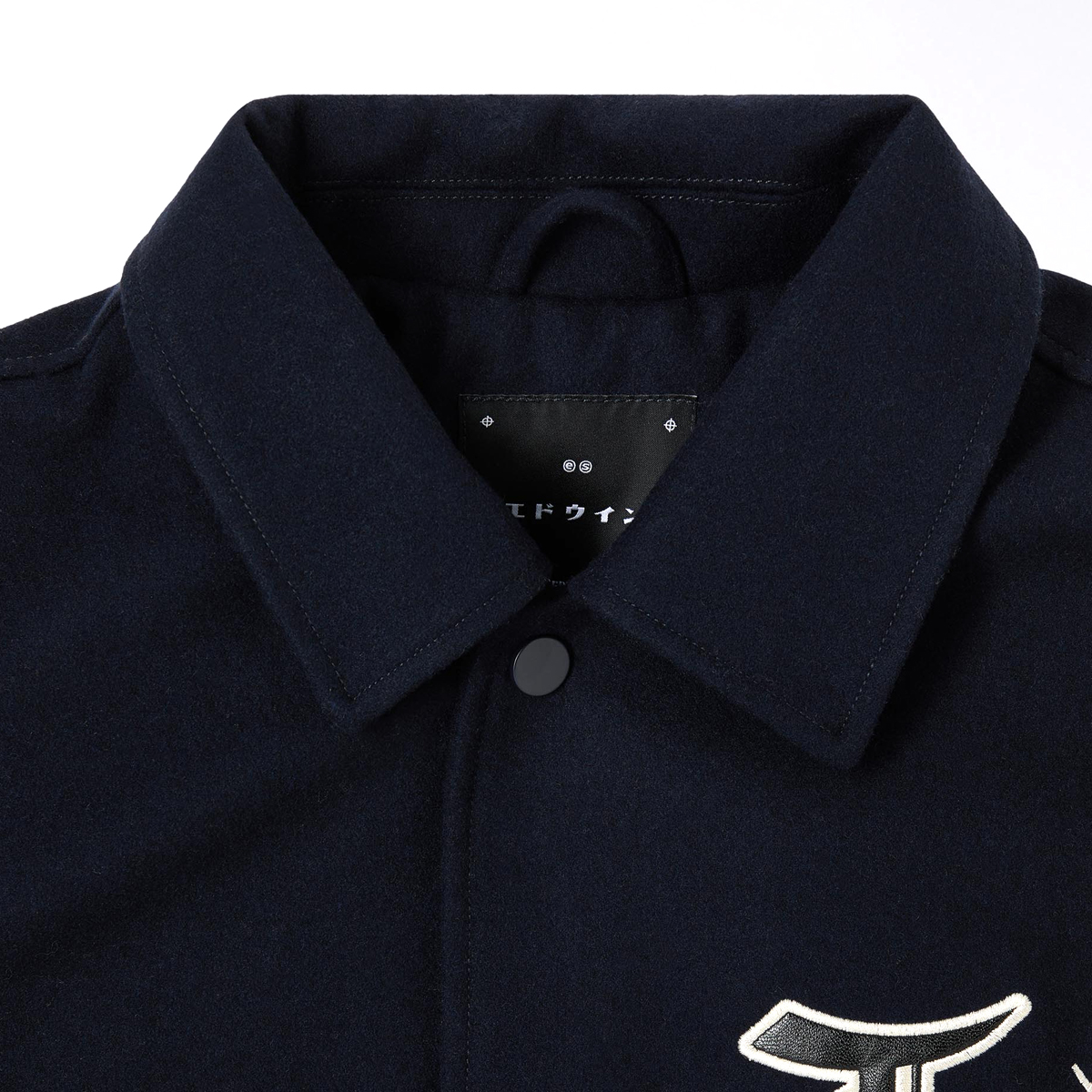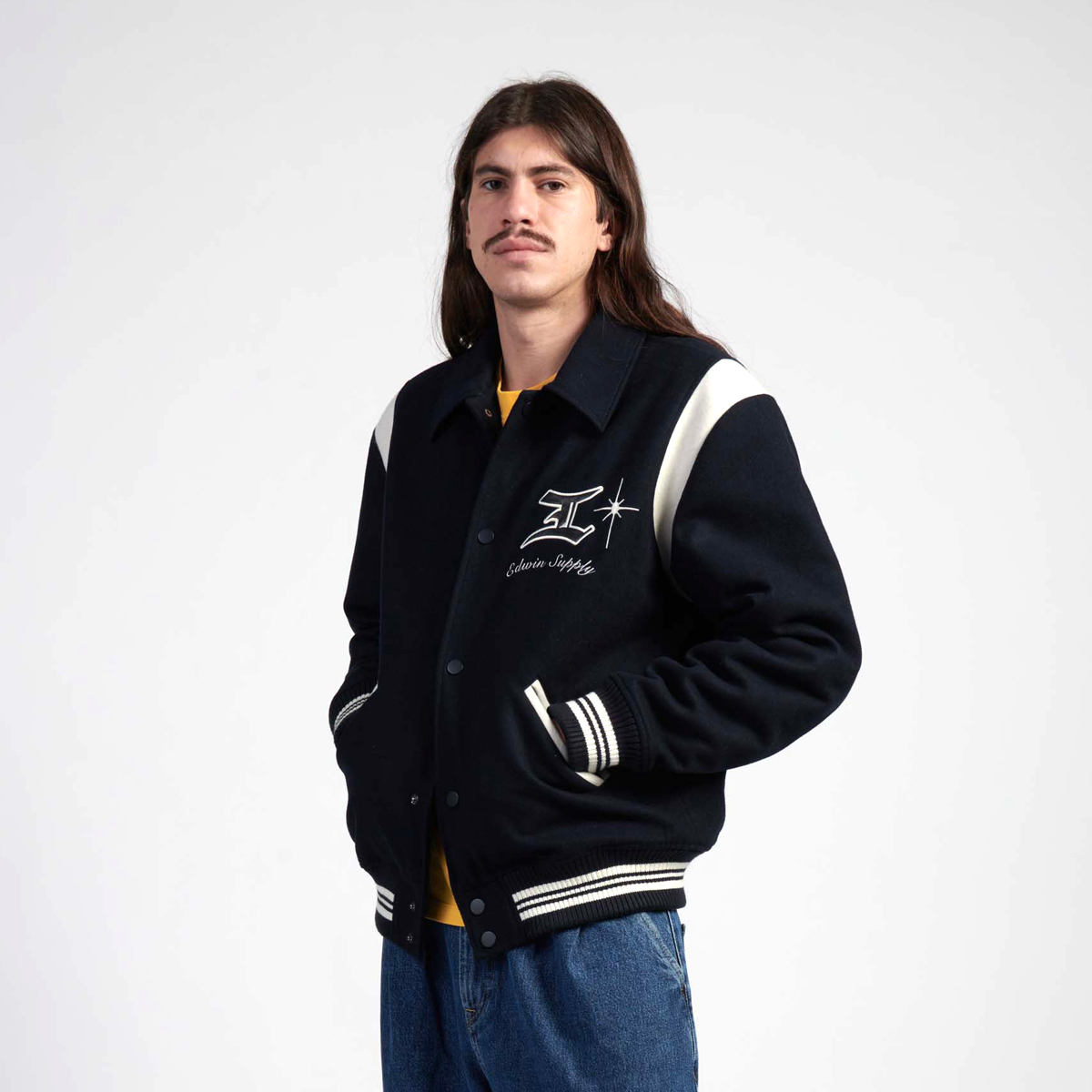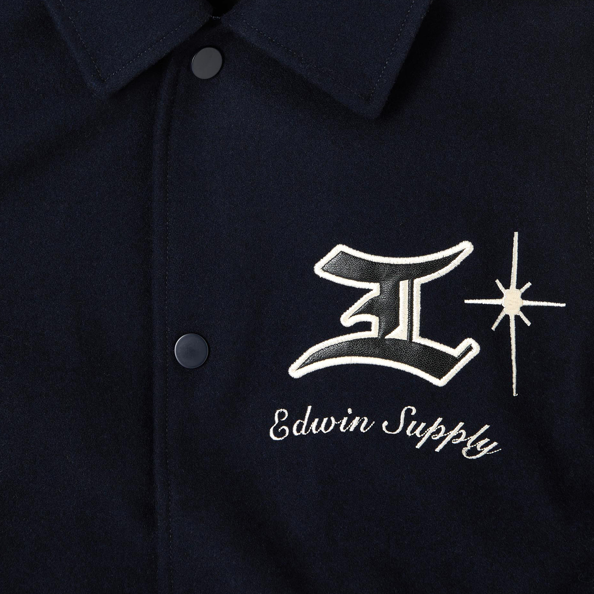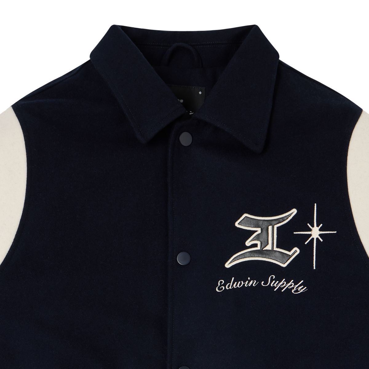 Das EDWIN Campus Jacket ist ein leicht oversized geschnittenes und gefüttertes College Jacket mit 2 seitlichen Taschen und einem EDWIN SUPPLY Artwork auf der Front und einem großen EDWIN Schriftzug auf dem Rücken. Es besteht aus 650g/m² Compact Wool Cloth und hat eine durchgehende Druckknopfleiste. Das gesteppte Innenfutter ist aus 100% Polyester mit einer Polyester-Fütterung.