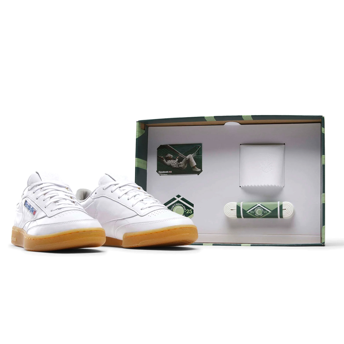 Premium OG Style in Jubiläumspracht! Jedes Detail des Reebok Club C 85 Vintage aus dem 40th Anniversary Pack ist erstklassig. Das Obermaterial aus weichem Vollnarbenleder wirkt luxuriös und hochwertig. Die individuelle Prägungen an der Ferse und die charakteristischen Logos machen diese Version einzigartig. Dazu kommt ein special Packaging mit Goldprägung und einigen kleinen Accessoires.