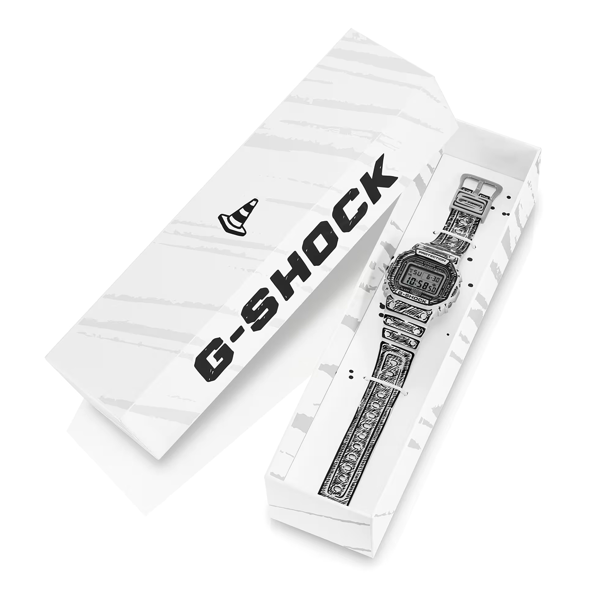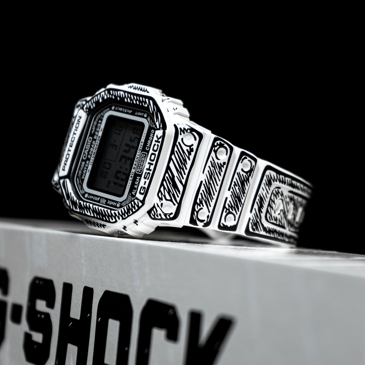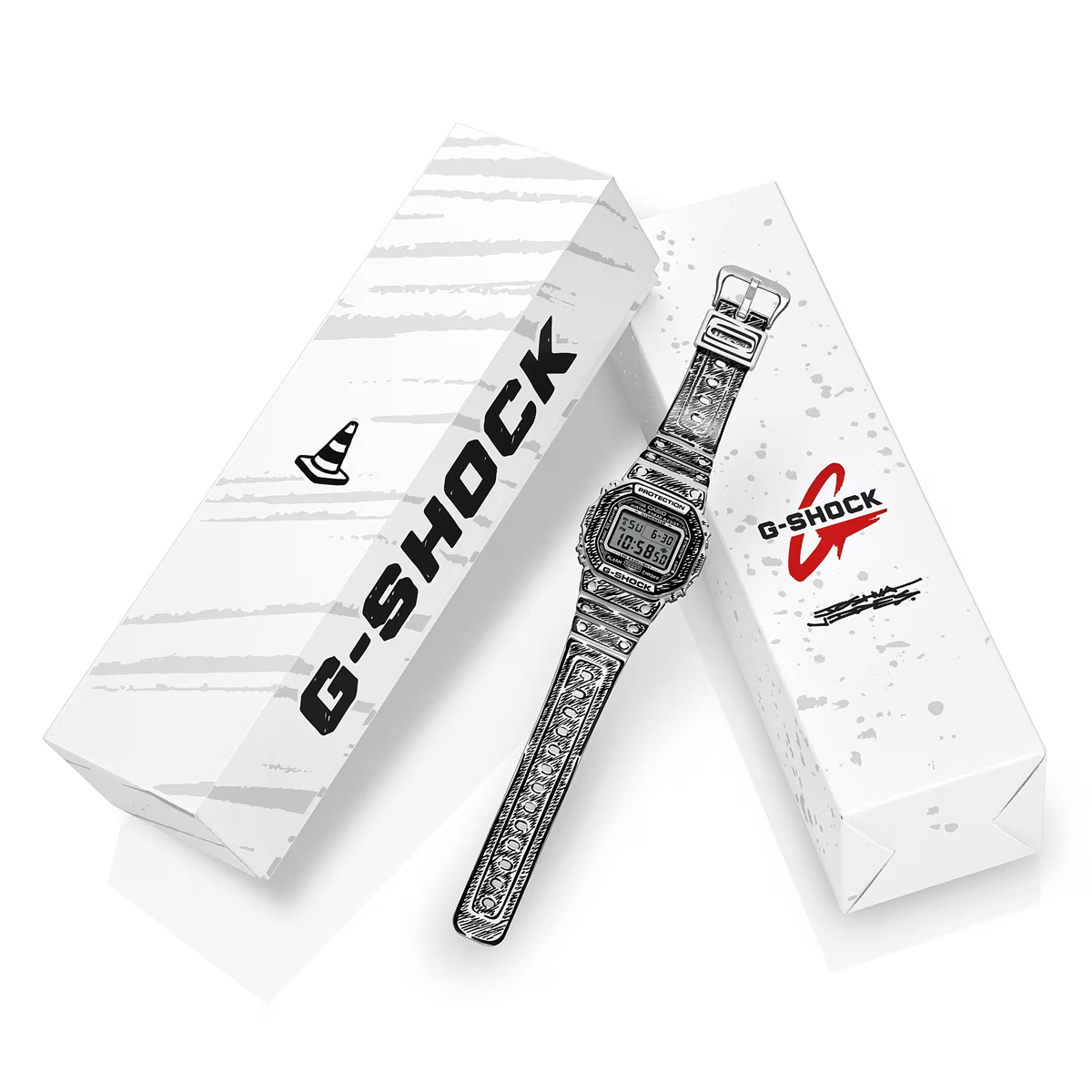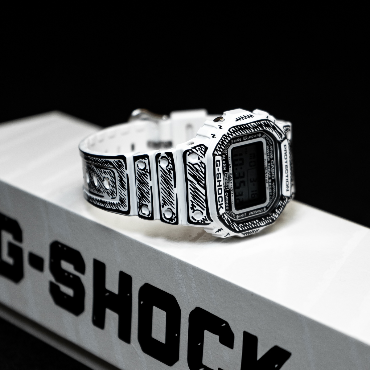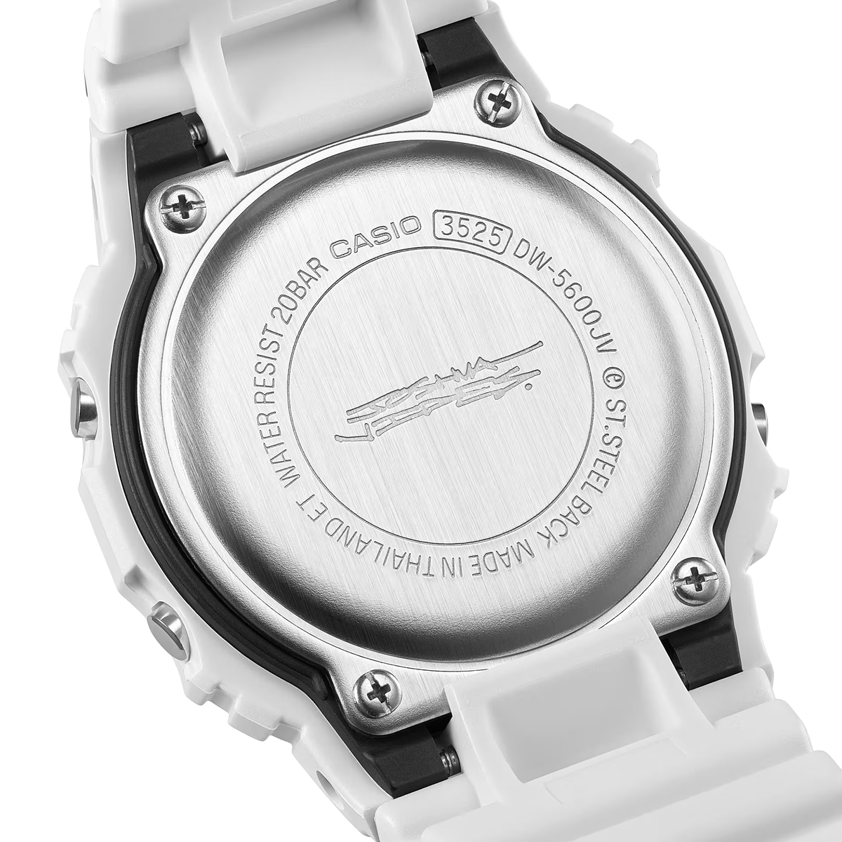 Die weiße DW-5600 besticht durch schwarze Grafiken und ein glänzendes Finish, welches einen starken Kontrast und eine markante Präsenz erzeugt. So kommen Joshuas handgezeichnete Zifferblattgrafiken besonders gut zur Geltung und bei aktivierter Hintergrundbeleuchtung erscheint sein charakteristisches „Cone“-Motiv. Dieses Sondermodell wird in einer exklusiven Verpackung präsentiert.