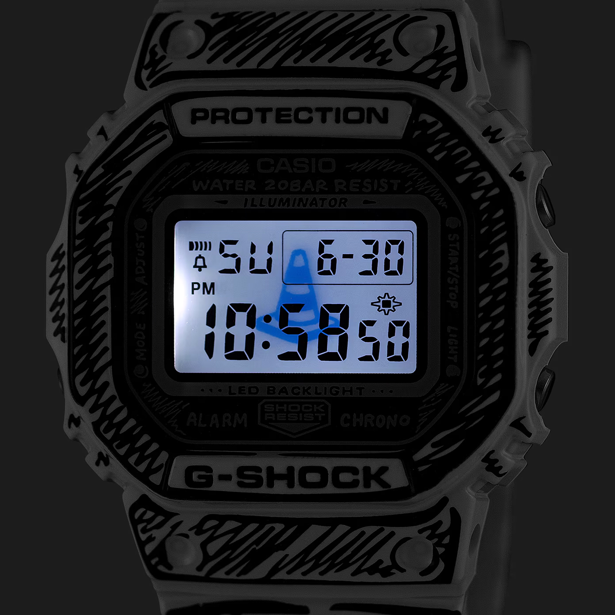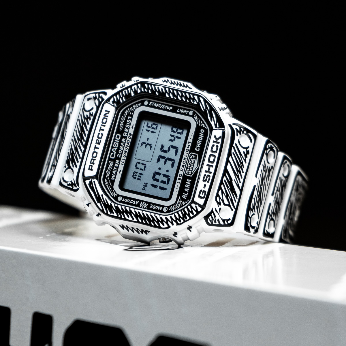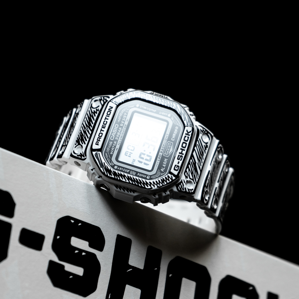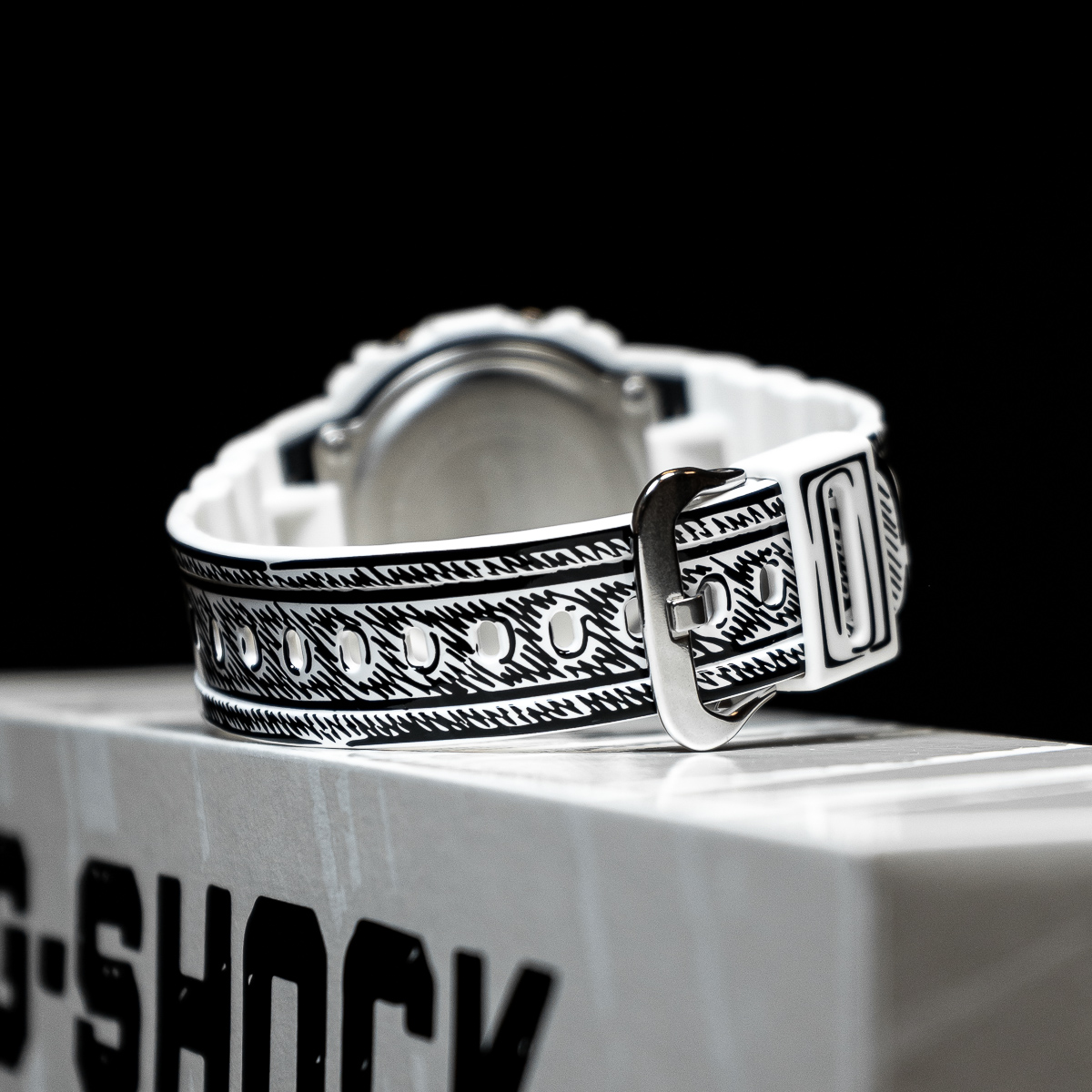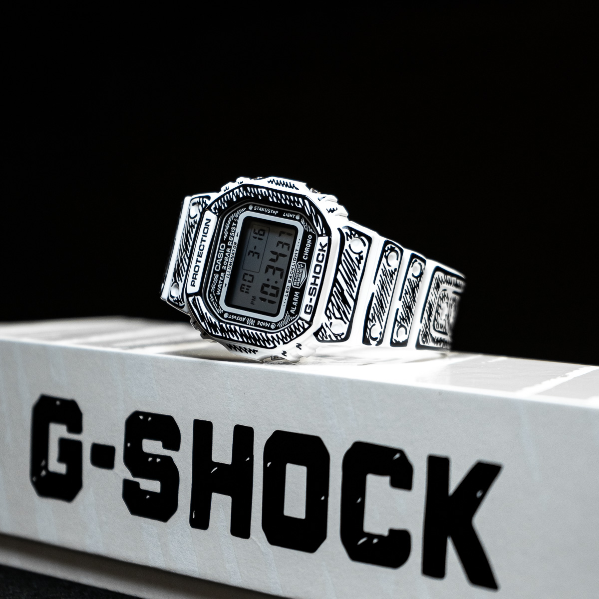 Die weiße DW-5600 besticht durch schwarze Grafiken und ein glänzendes Finish, welches einen starken Kontrast und eine markante Präsenz erzeugt. So kommen Joshuas handgezeichnete Zifferblattgrafiken besonders gut zur Geltung und bei aktivierter Hintergrundbeleuchtung erscheint sein charakteristisches „Cone“-Motiv. Dieses Sondermodell wird in einer exklusiven Verpackung präsentiert.