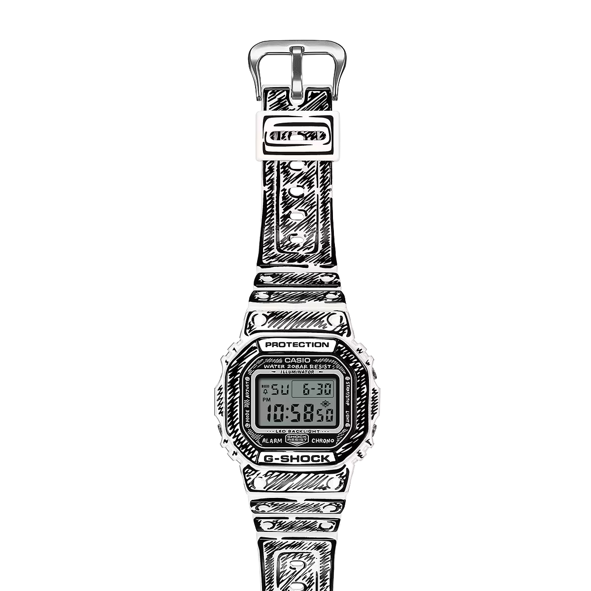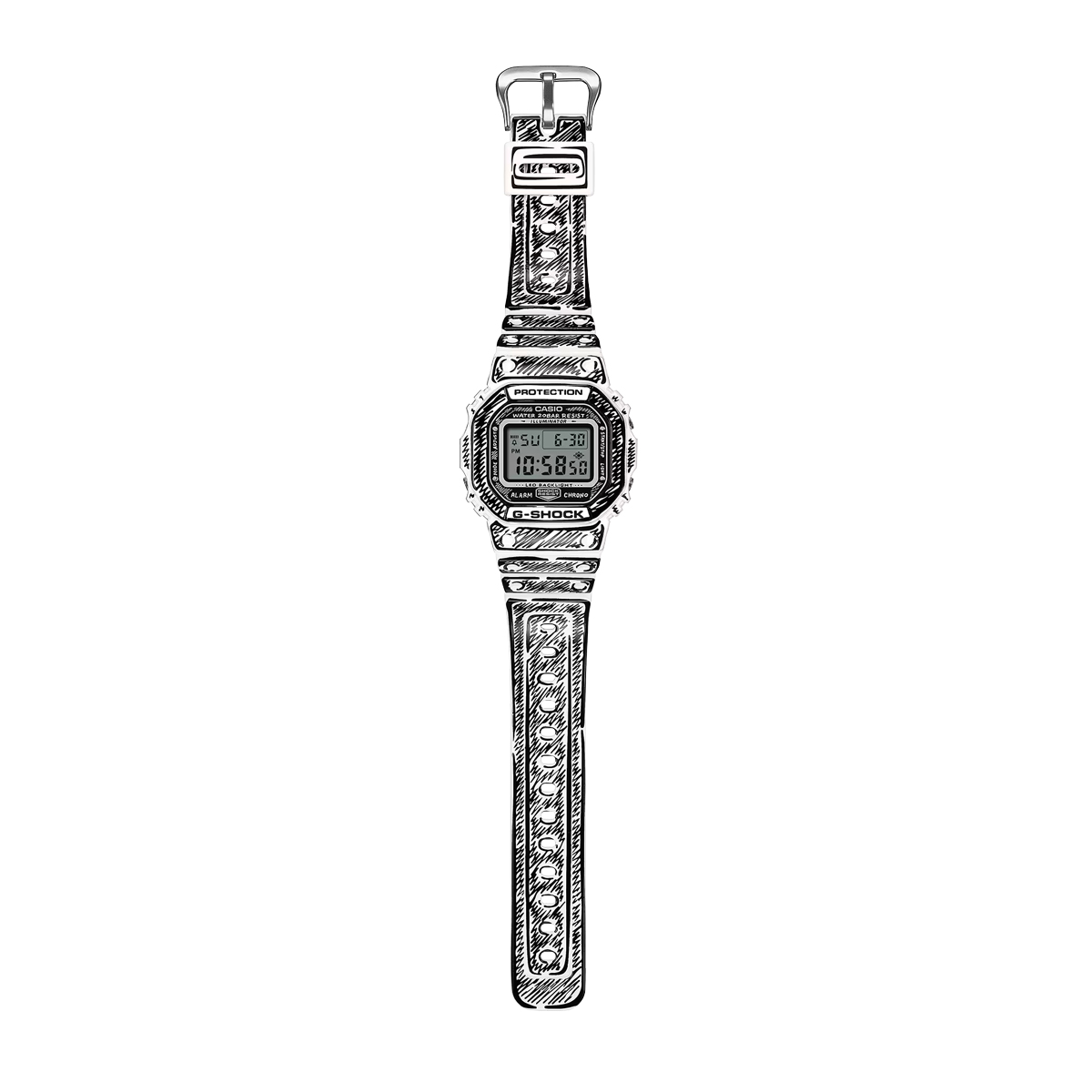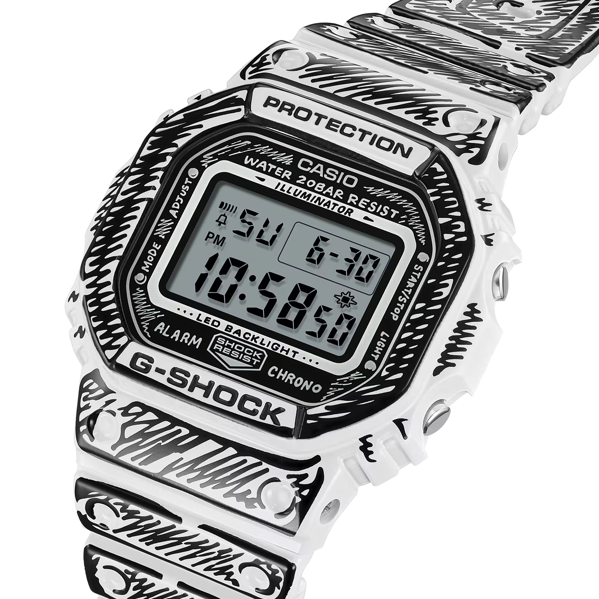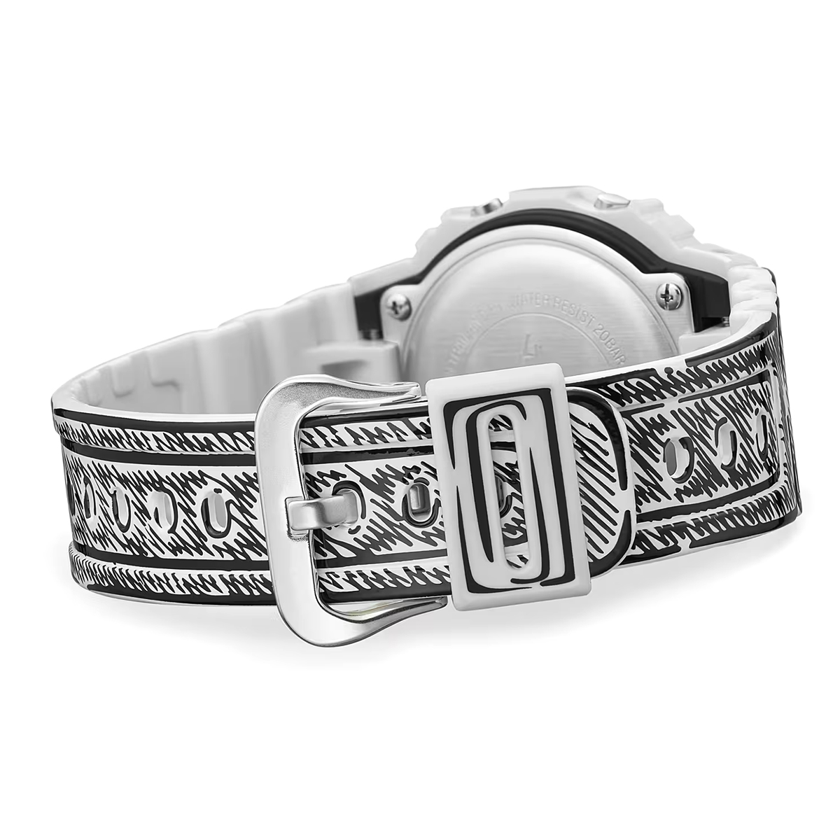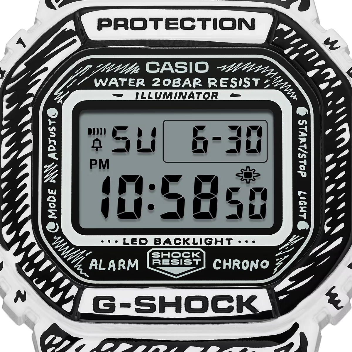 Die weiße DW-5600 besticht durch schwarze Grafiken und ein glänzendes Finish, welches einen starken Kontrast und eine markante Präsenz erzeugt. So kommen Joshuas handgezeichnete Zifferblattgrafiken besonders gut zur Geltung und bei aktivierter Hintergrundbeleuchtung erscheint sein charakteristisches „Cone“-Motiv. Dieses Sondermodell wird in einer exklusiven Verpackung präsentiert.