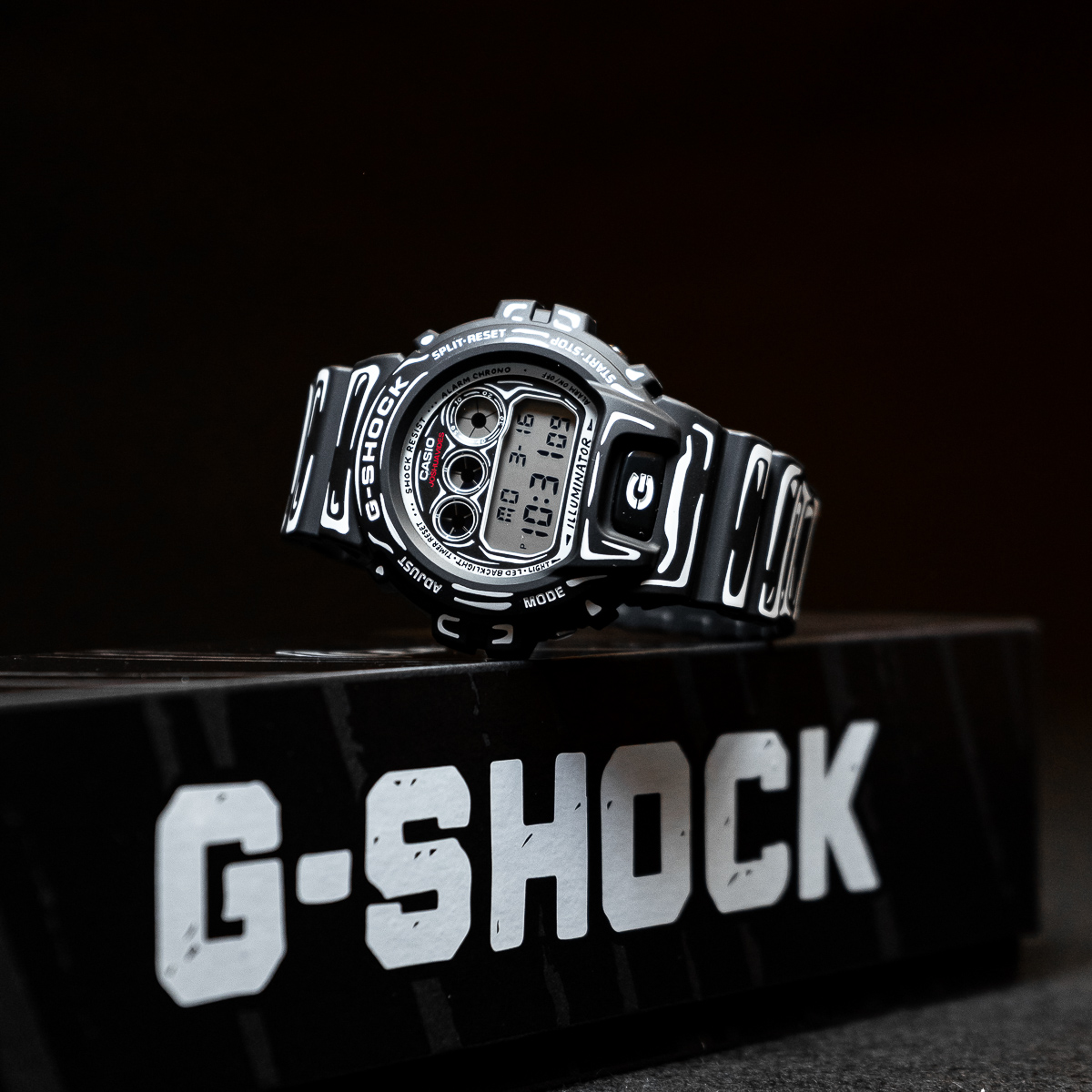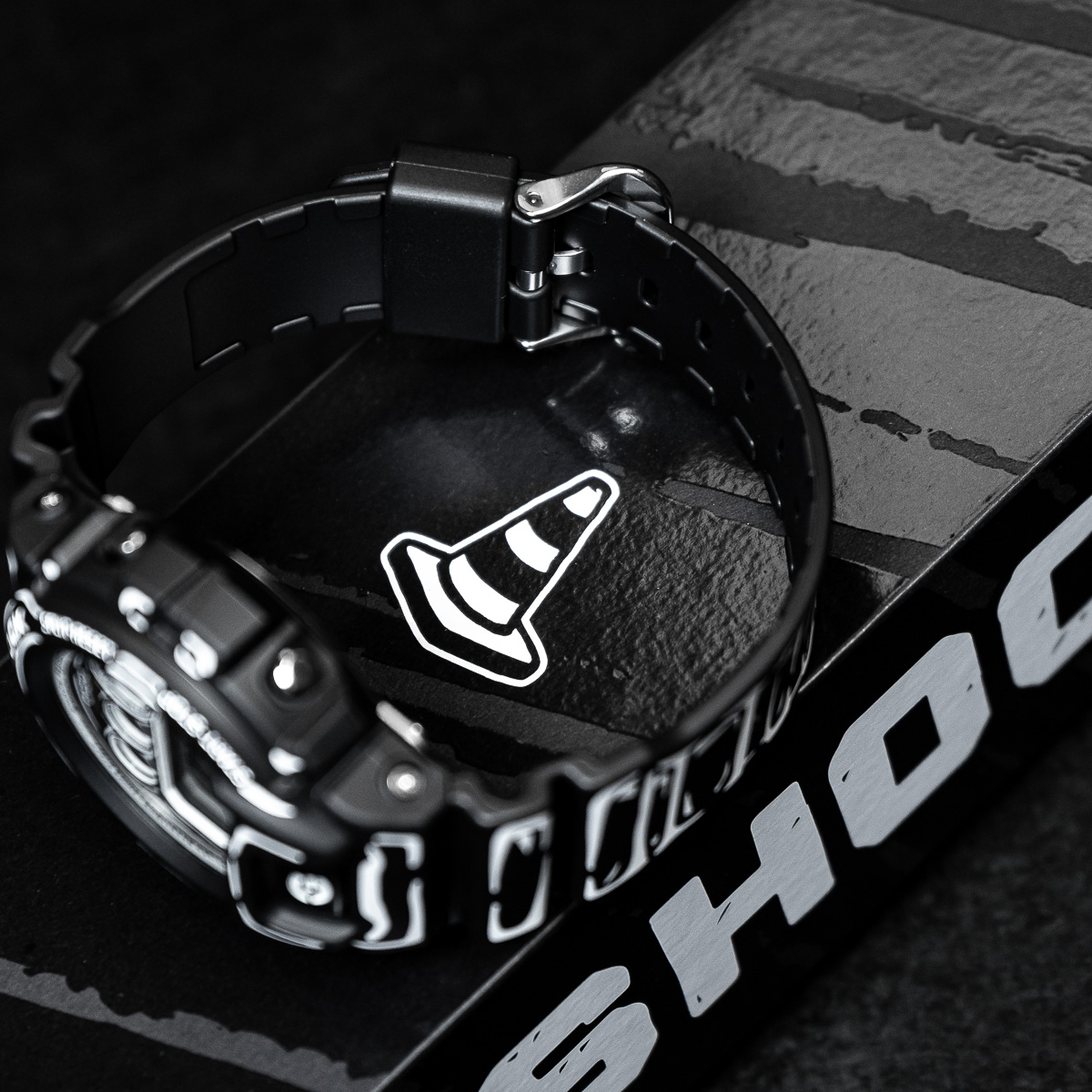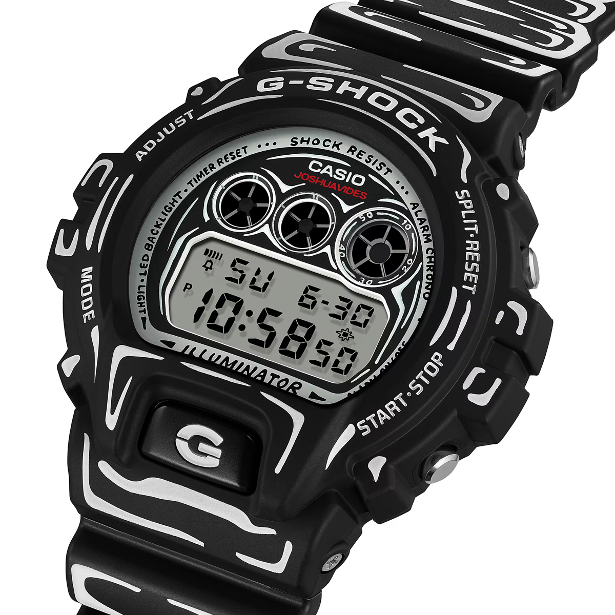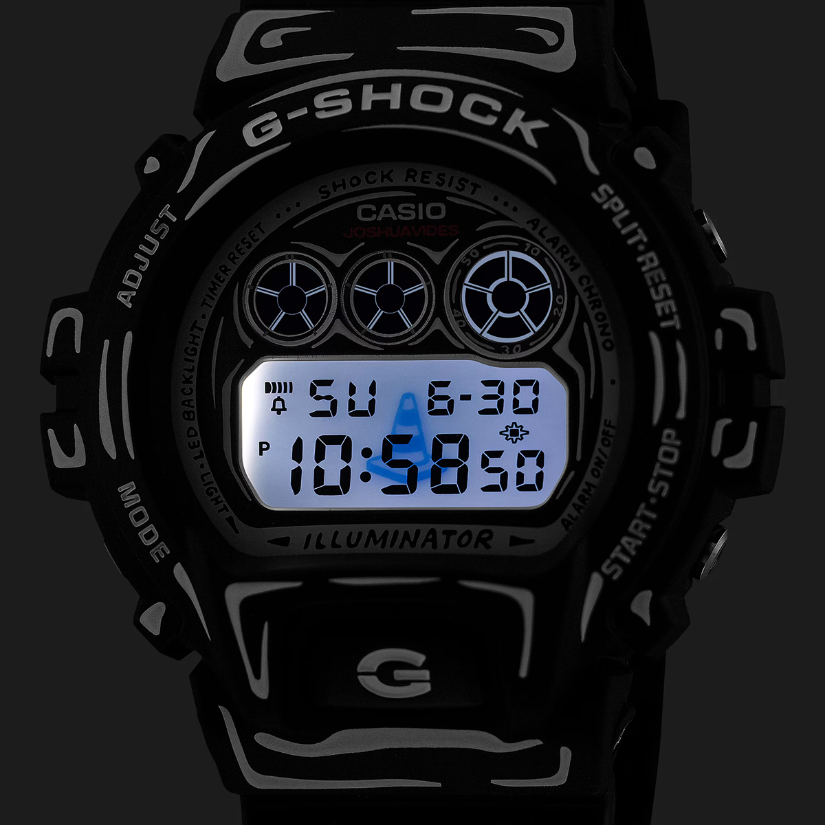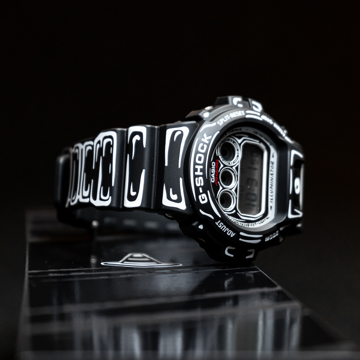 The black-based DW-6900 features white graphics and a matte finish for a sharp, understated look. It highlights Joshua’s hand-drawn dial artwork, and when the backlight is activated, his trademark “Cone” motif appears. It is the special edition model presented in custom packaging.