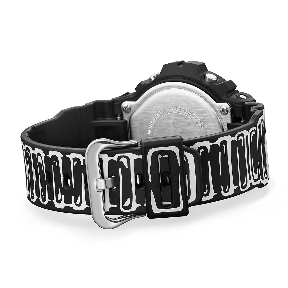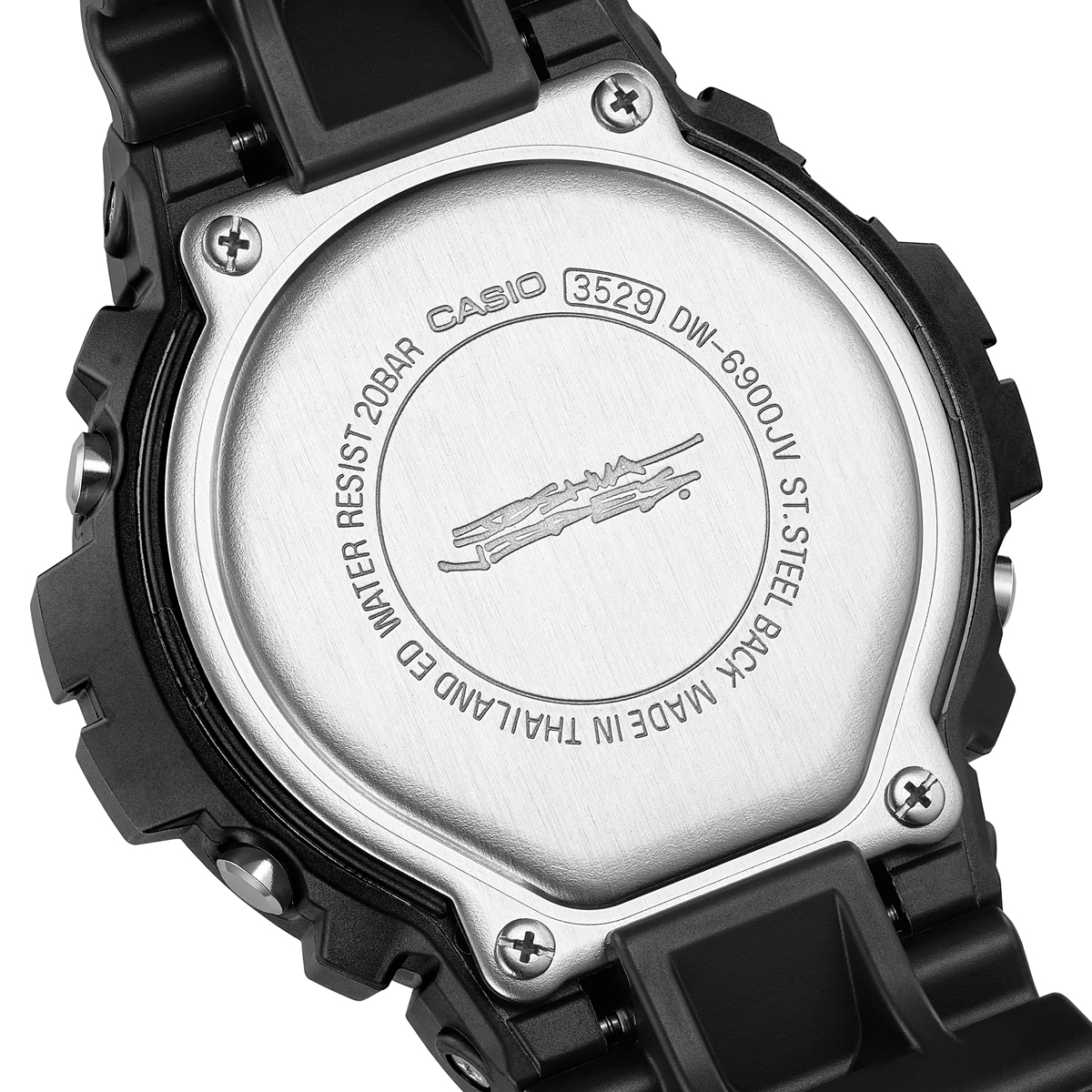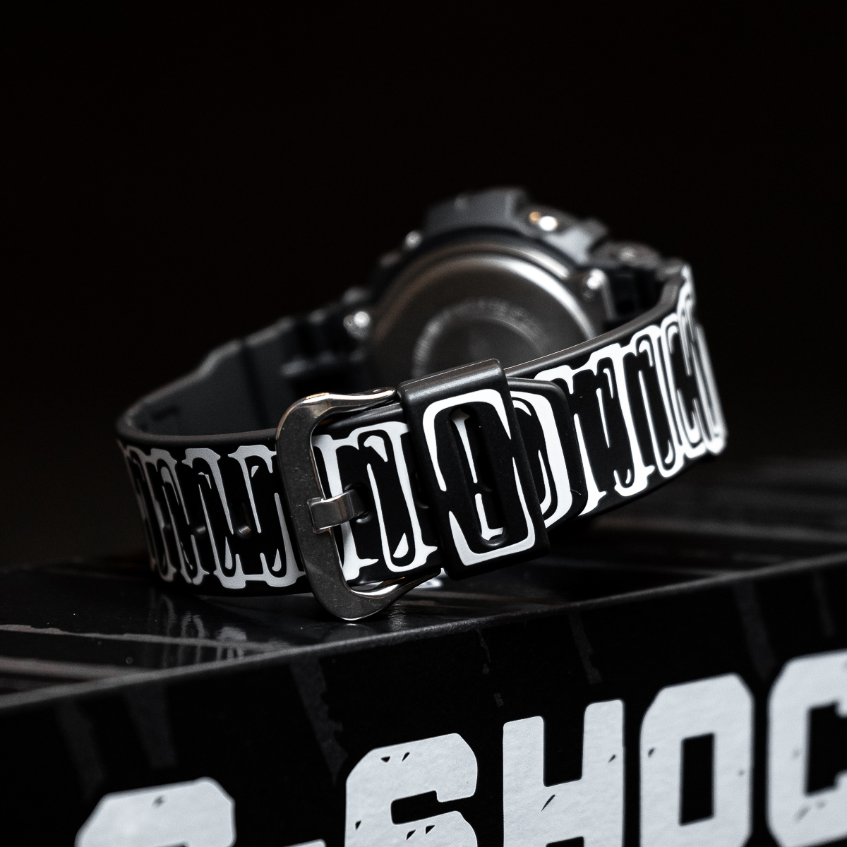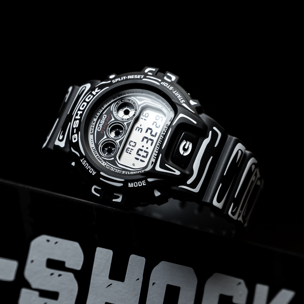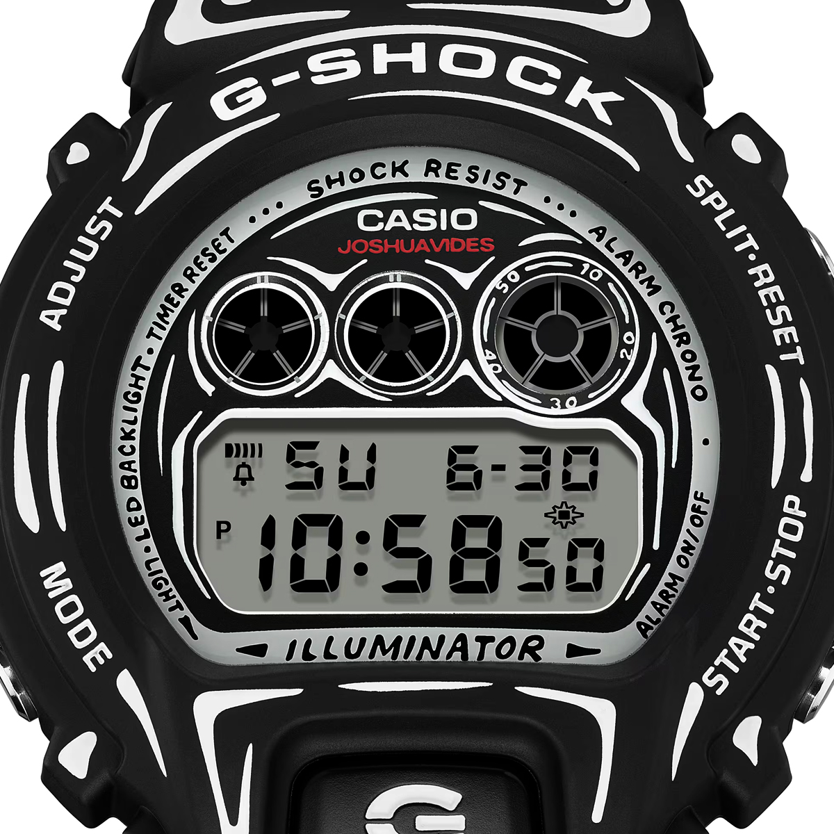 The black-based DW-6900 features white graphics and a matte finish for a sharp, understated look. It highlights Joshua’s hand-drawn dial artwork, and when the backlight is activated, his trademark “Cone” motif appears. It is the special edition model presented in custom packaging.