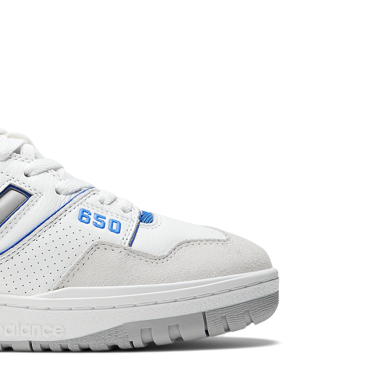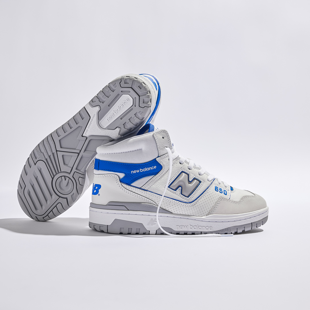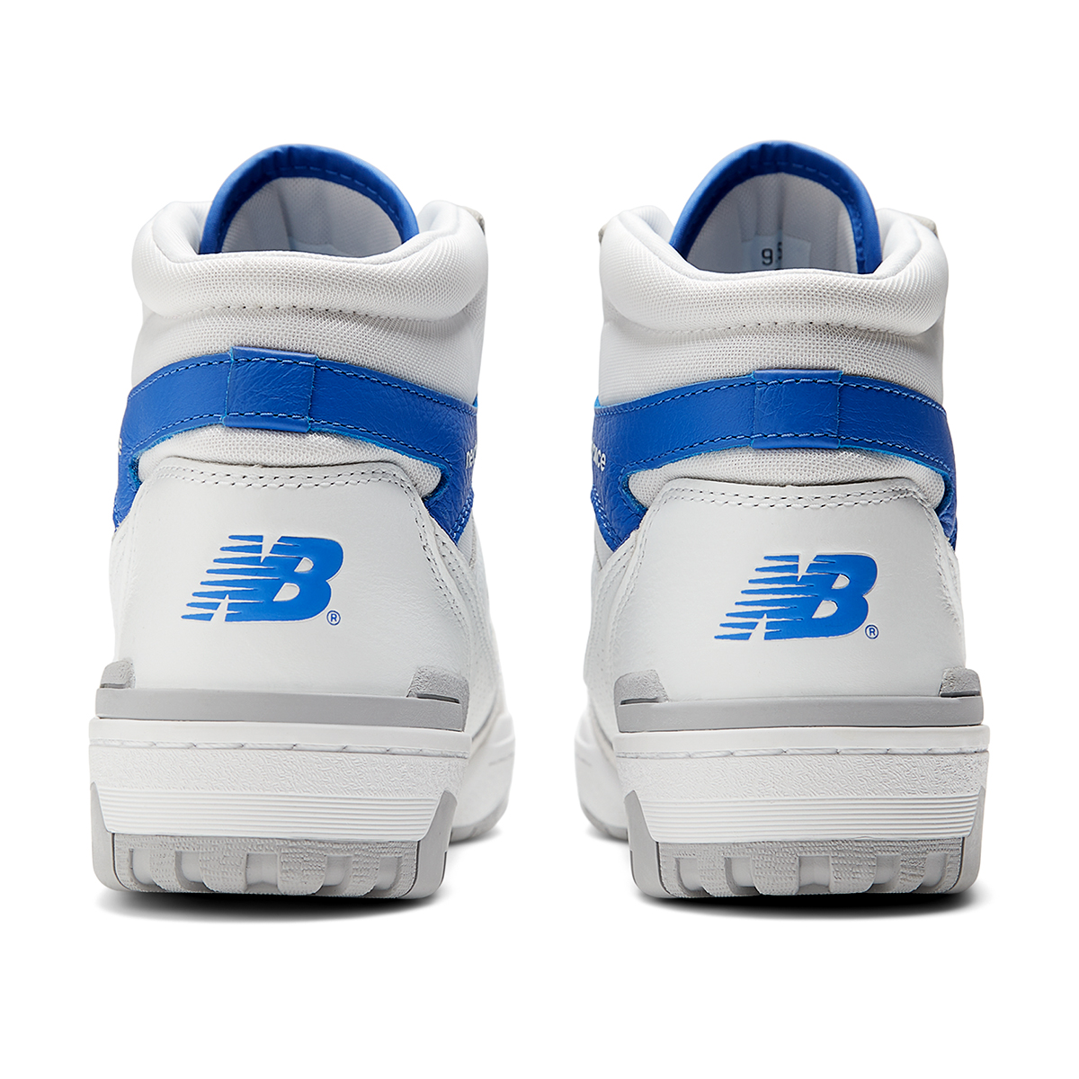 With the new 650 silhouette, New Balance introduces a hi-top counterpart to the wildly popular 550. While 1980s on-court design combined supportive features with epic proportions, the 650 offers a streamlined, ready to wear look. A classic, leather upper is bolstered with a puff and stitch collar, for a subtle reinterpretation of molded foam construction, while a raw edged leather eyerow applies the shoe’s elevated construction to every level of detail.