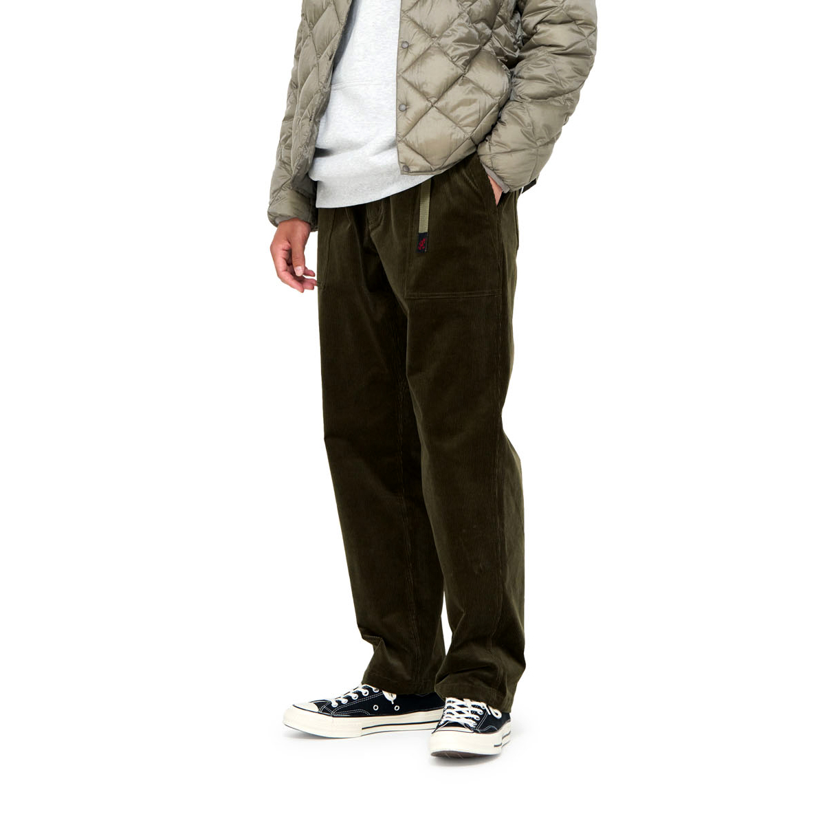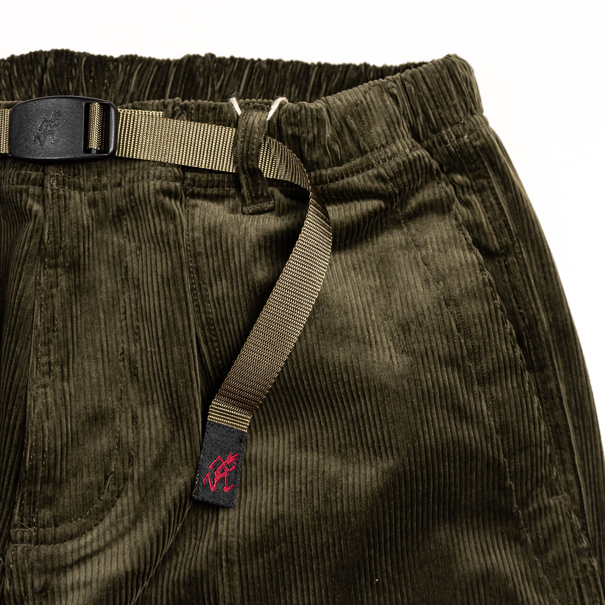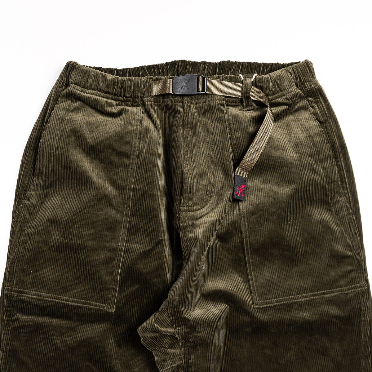 Gramicci's Curduroy Loose Tapered Ridge Pant features a gusset crotch and allows for 180 degree leg flexibility, and the webbing belt and relaxed-fit waist can be adjusted with one hand. Gramicci Pants that have been well-loved for many years are now available in stretch corduroy material that is perfect for fall and winter. They are made of classic corduroy with slightly large ridges, and the webbing belt is the same color as the body, giving them an elegant look.