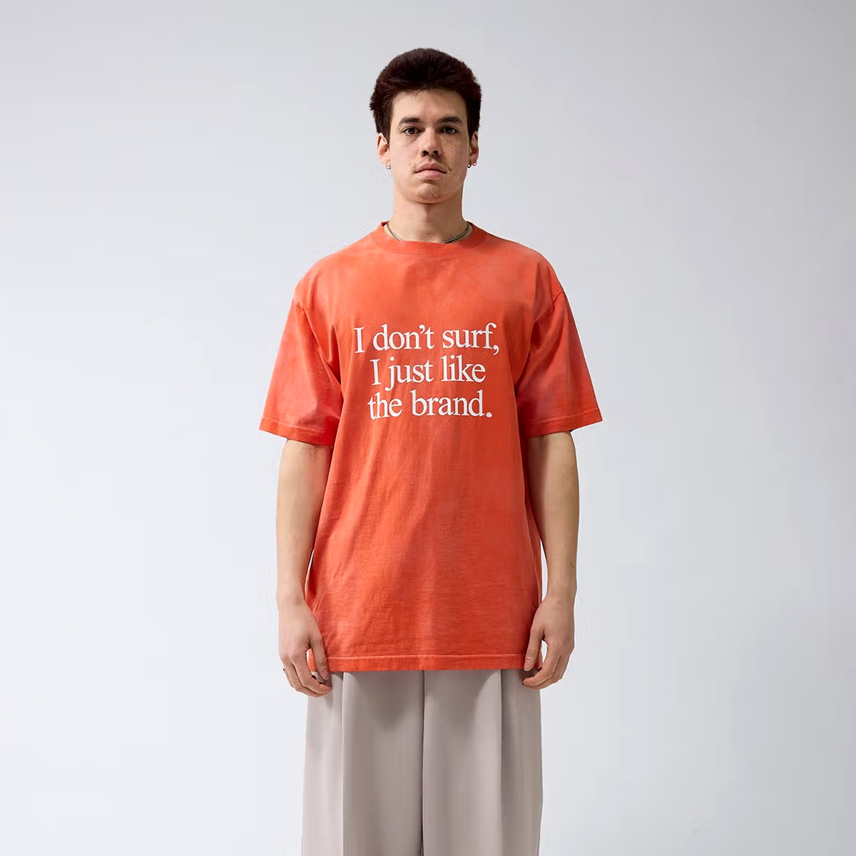 Crew neck t-shirt, cut to a relaxed unisex fit. Detailed with 'I don't surf, I just like the brand' artwork on the front. This tee is made out 220 GSM cotton.