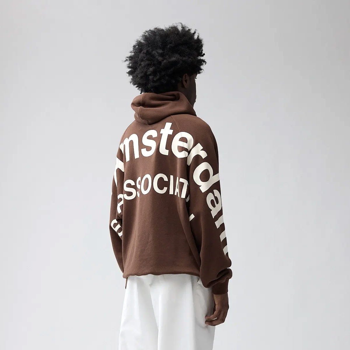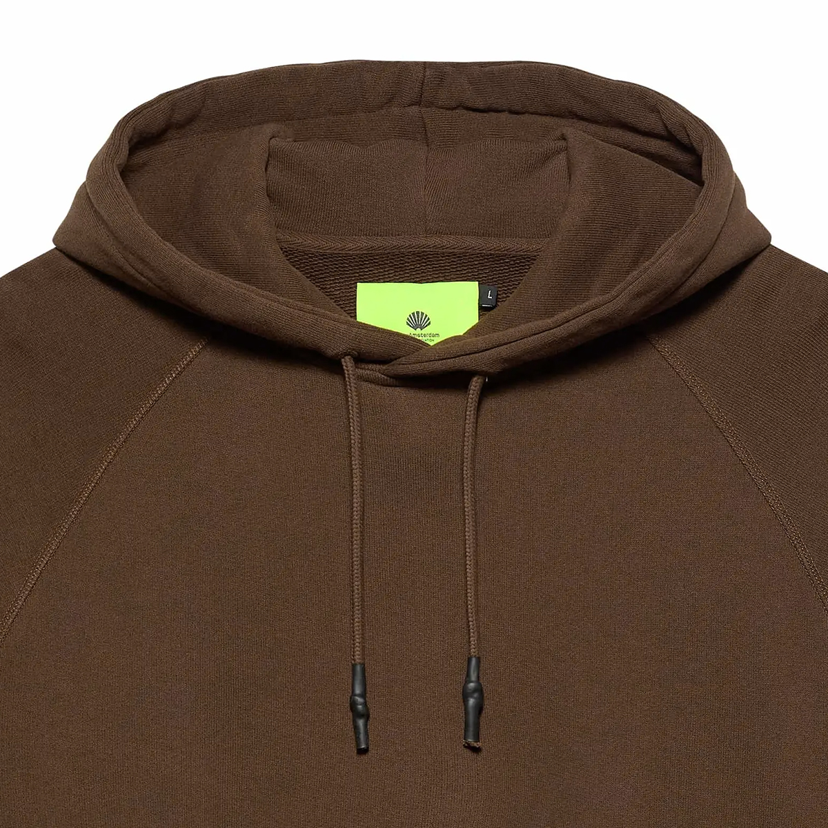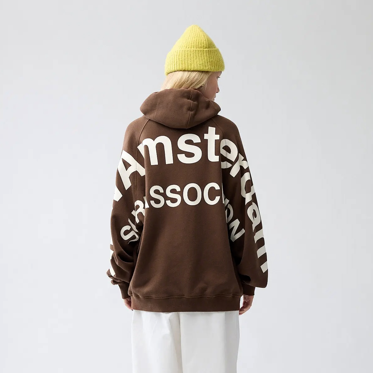Hooded raglan sleeve sweater, cut to a slightly oversized unisex fit. Detailed with the New Amsterdam name screenprinted on the back. This hoodie is made of a heavy weight 350GMS cotton with a garment dye finish.
