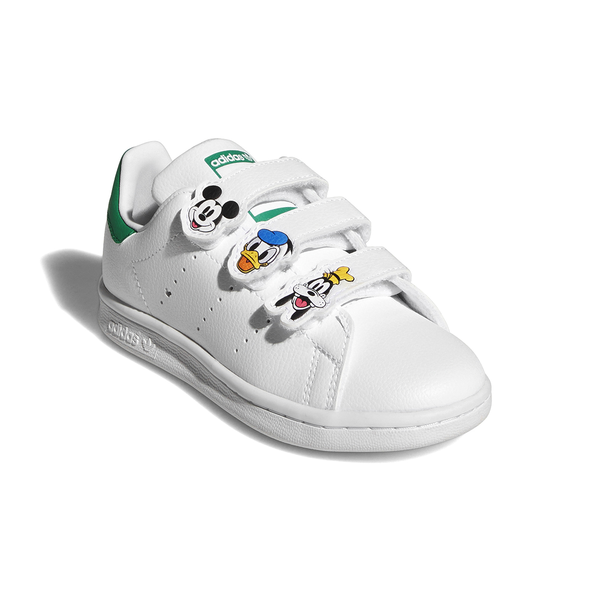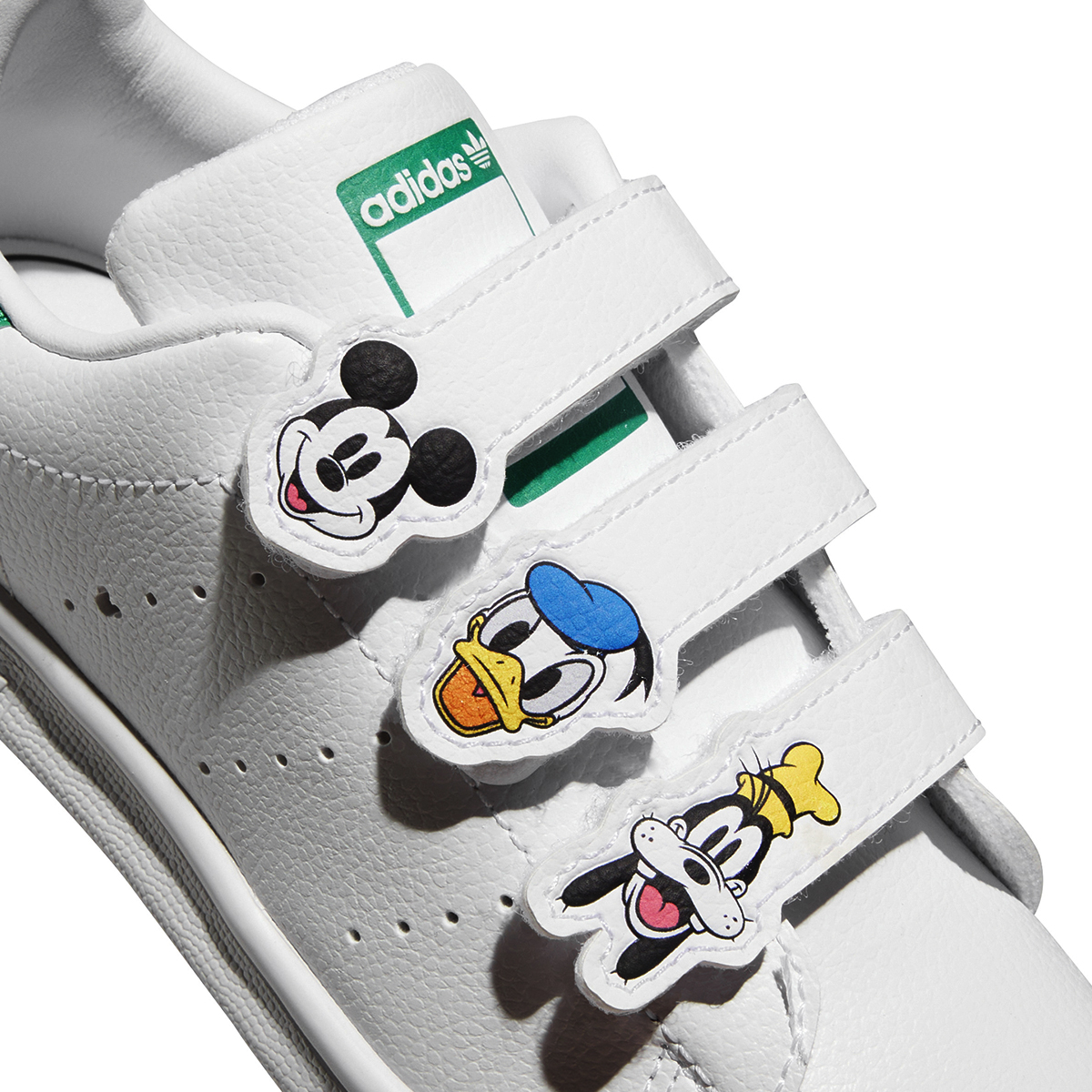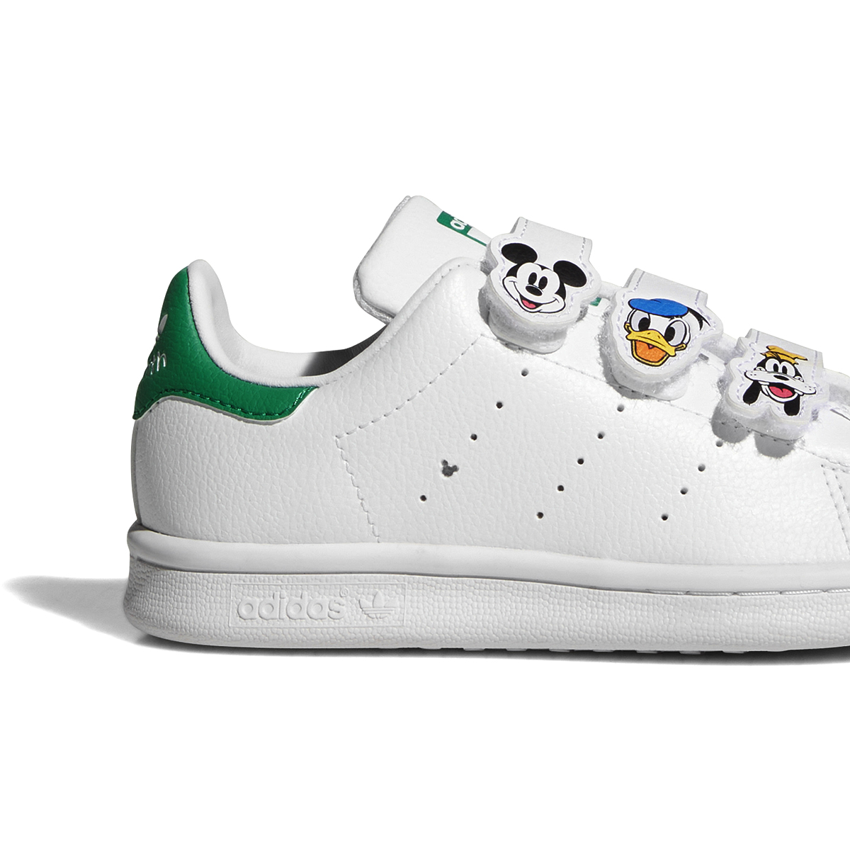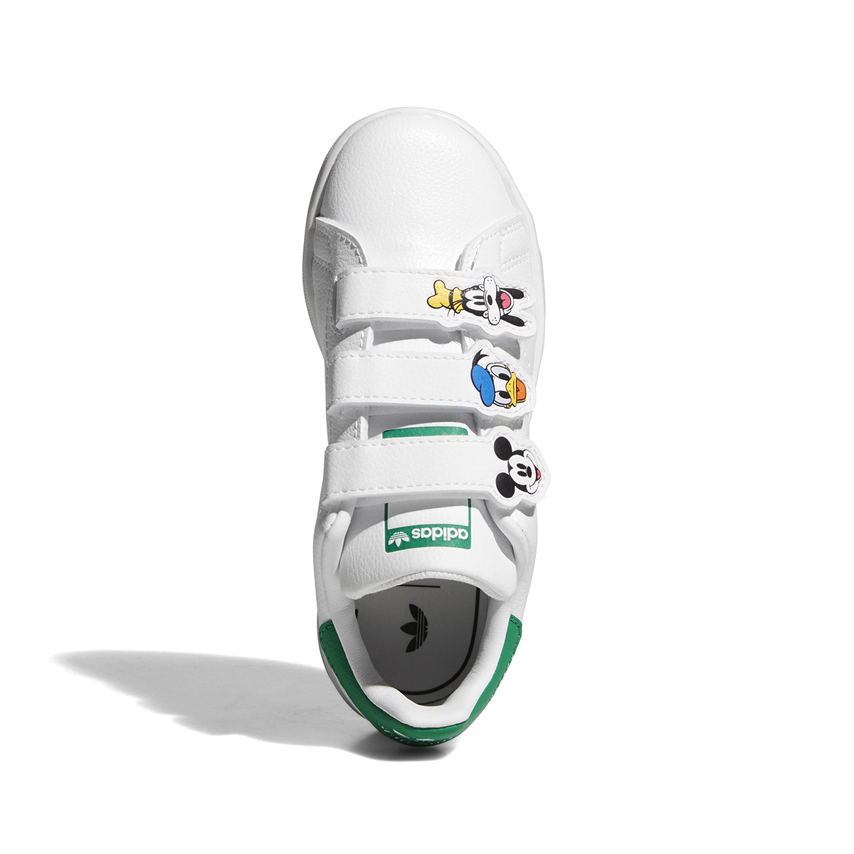 This version of the legendary Stan Smith tennis shoes from adidas Originals are sized for young fans. The hook-and-loop straps make them easy to pull on and off, while Disney's Mickey and Friends graphics bring the magic of their favourite characters. The synthetic leather upper is easy to keep clean, and the rubber outsole grips the ground.
