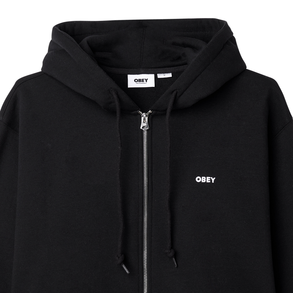 Schwarzes OBEY Established Works Zip-Hoodie in einem Heavyweight Cotton Mix (390g/m Brushed Back) mit gesticktem Logo auf der Brust.