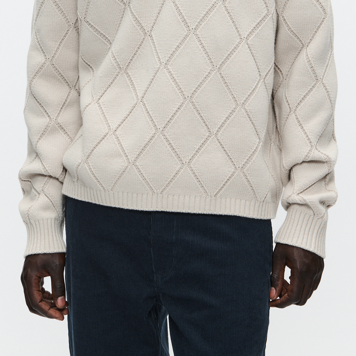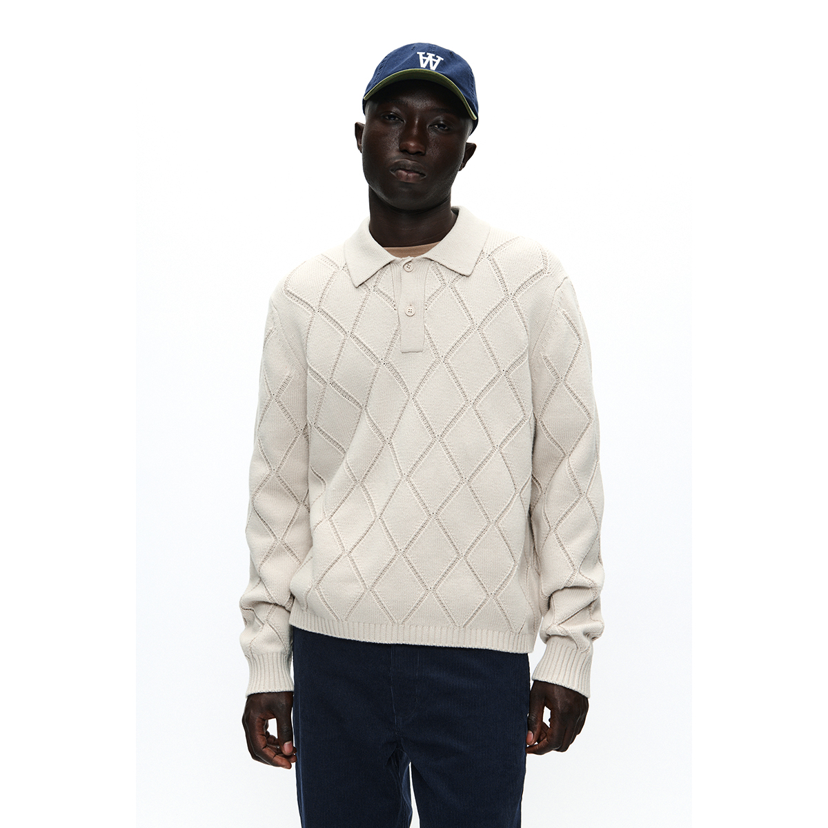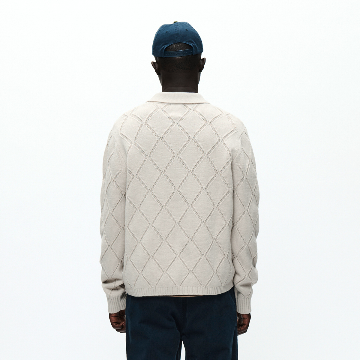 Strukturierter Strickpullover mit Rautenmuster, klassischem Kragen und Dreiknopfleiste. Gerippte Bündchen sorgen für eine perfekte Passform.