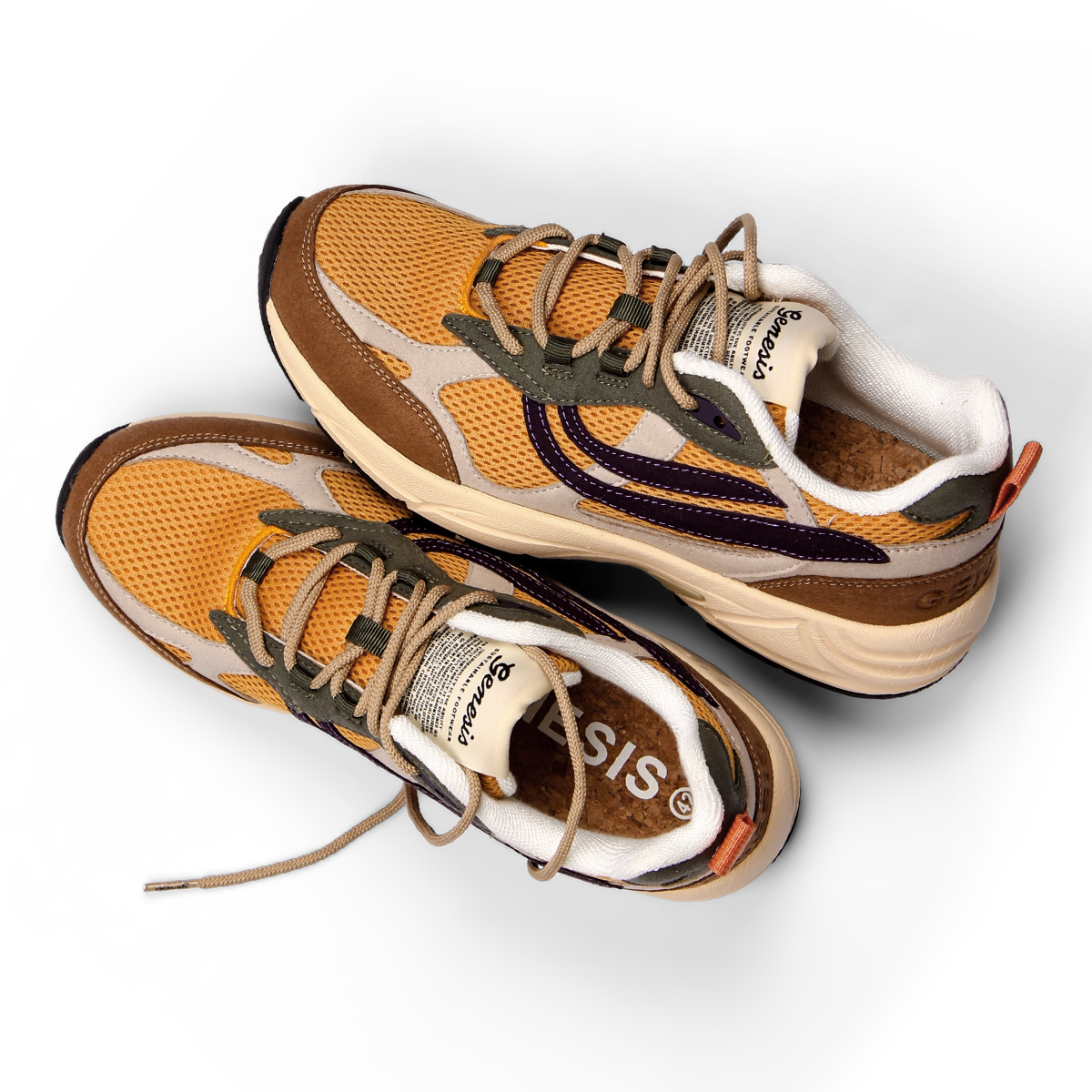 Das Obermaterial des GENESIS G-Eco '99 Winter Flowers besteht aus BIOWAVE™ Sugar Cane – veganes Veloursleder aus Zuckerrohr und recyceltem PET. Die bequeme Einlegesohle besteht aus einer Mischung aus recyceltem PU-Schaum und FSC-zertifiziertem Kork für außergewöhnlichen Komfort. Die Laufsohle besteht aus mindestens 40% Naturkautschuk aus nachhaltigem Anbau, ergänzt mit 10% recyceltem PET.