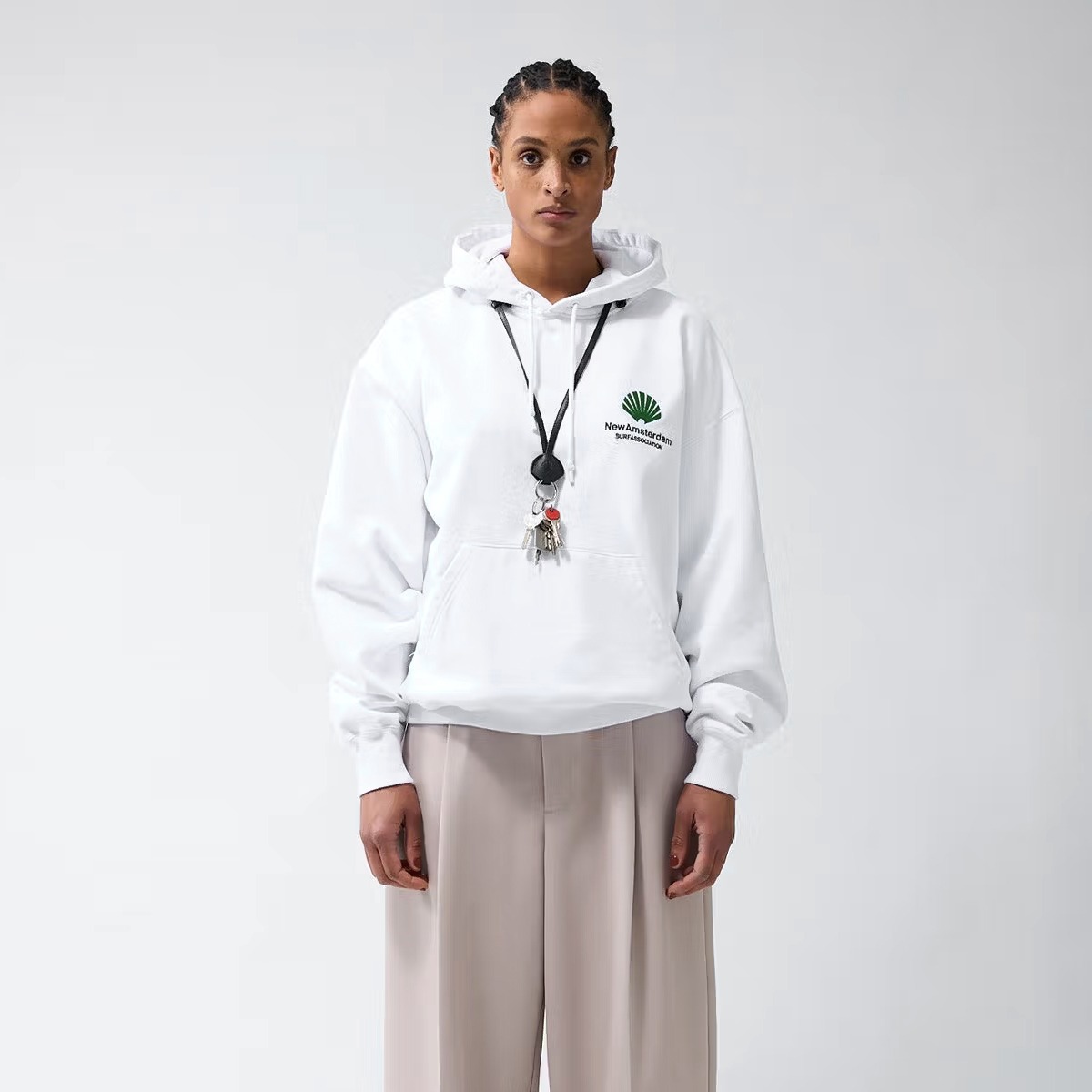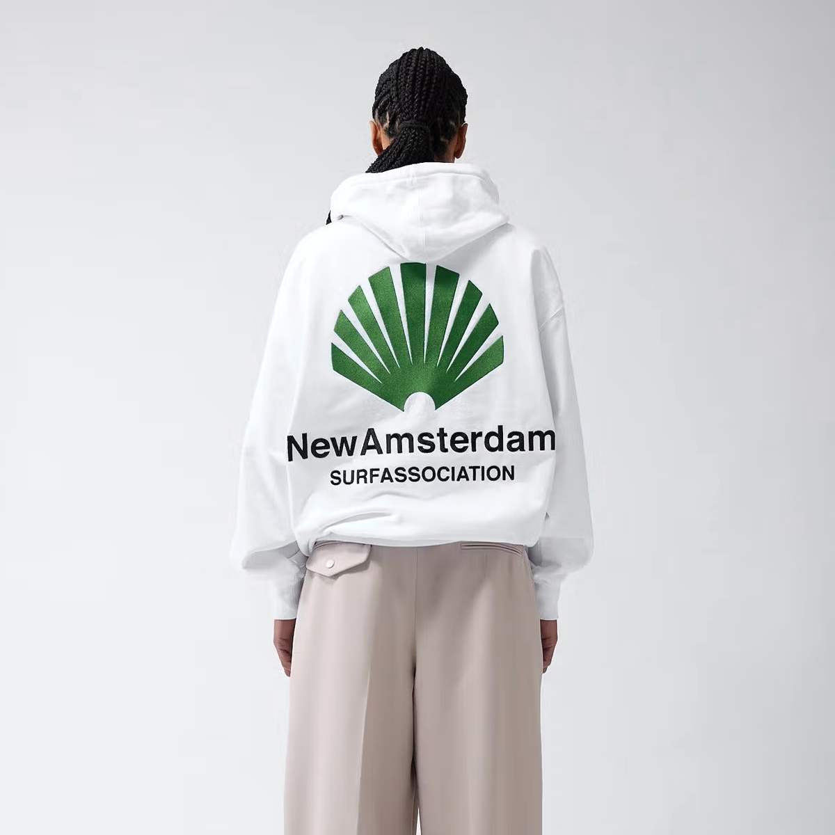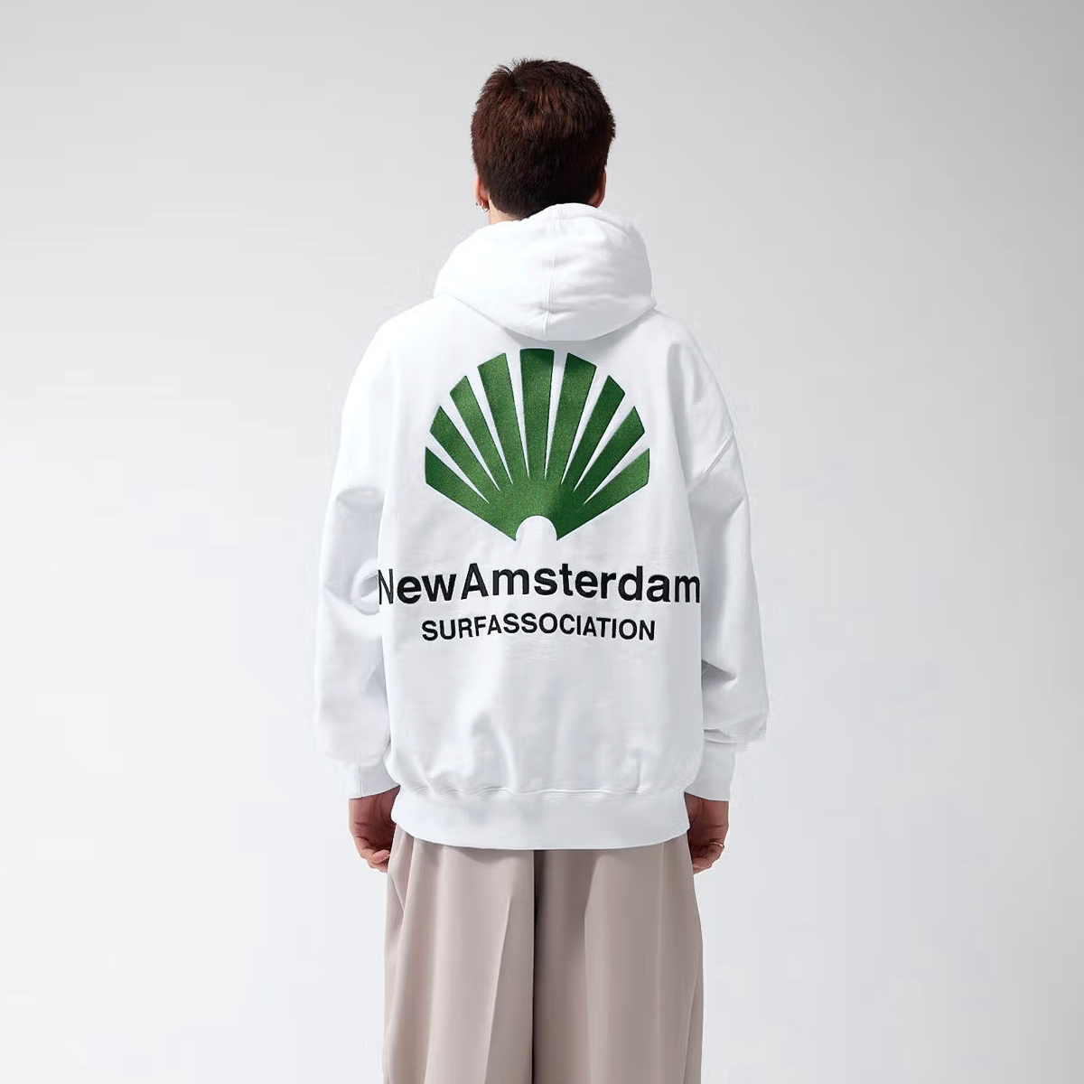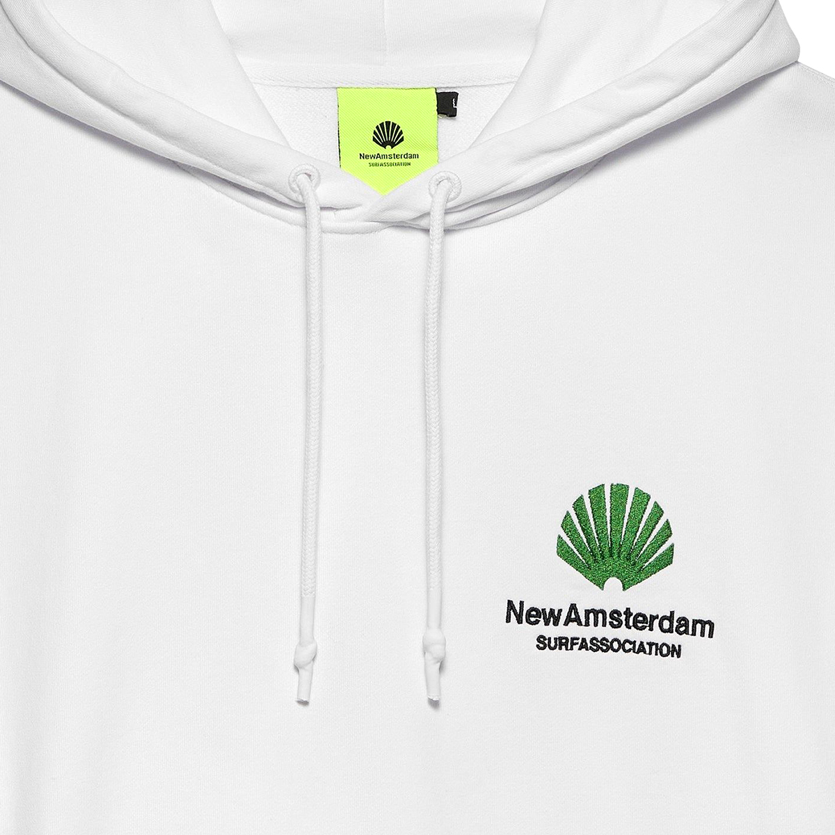 Das New Amsterdam Logo Hoodie kommt in einem Unisex Drop Shoulder Oversized-Fit aus 455g/m schwerem Heavyweight Cotton (100% Baumwolle ) mit kleinem, gestickten Logo auf der linken Brust und großer, gestickter Applikation auf dem Rücken.