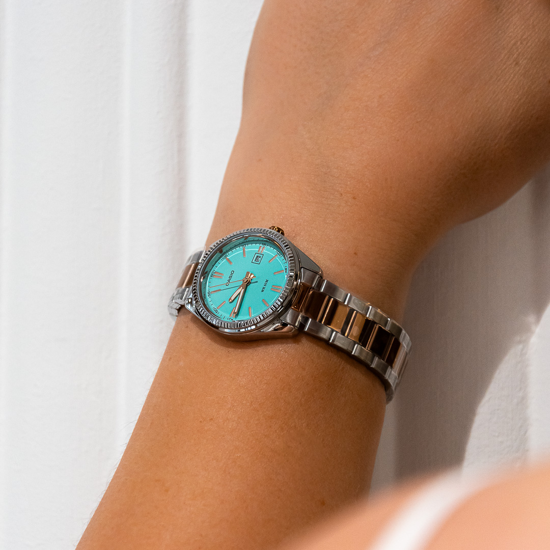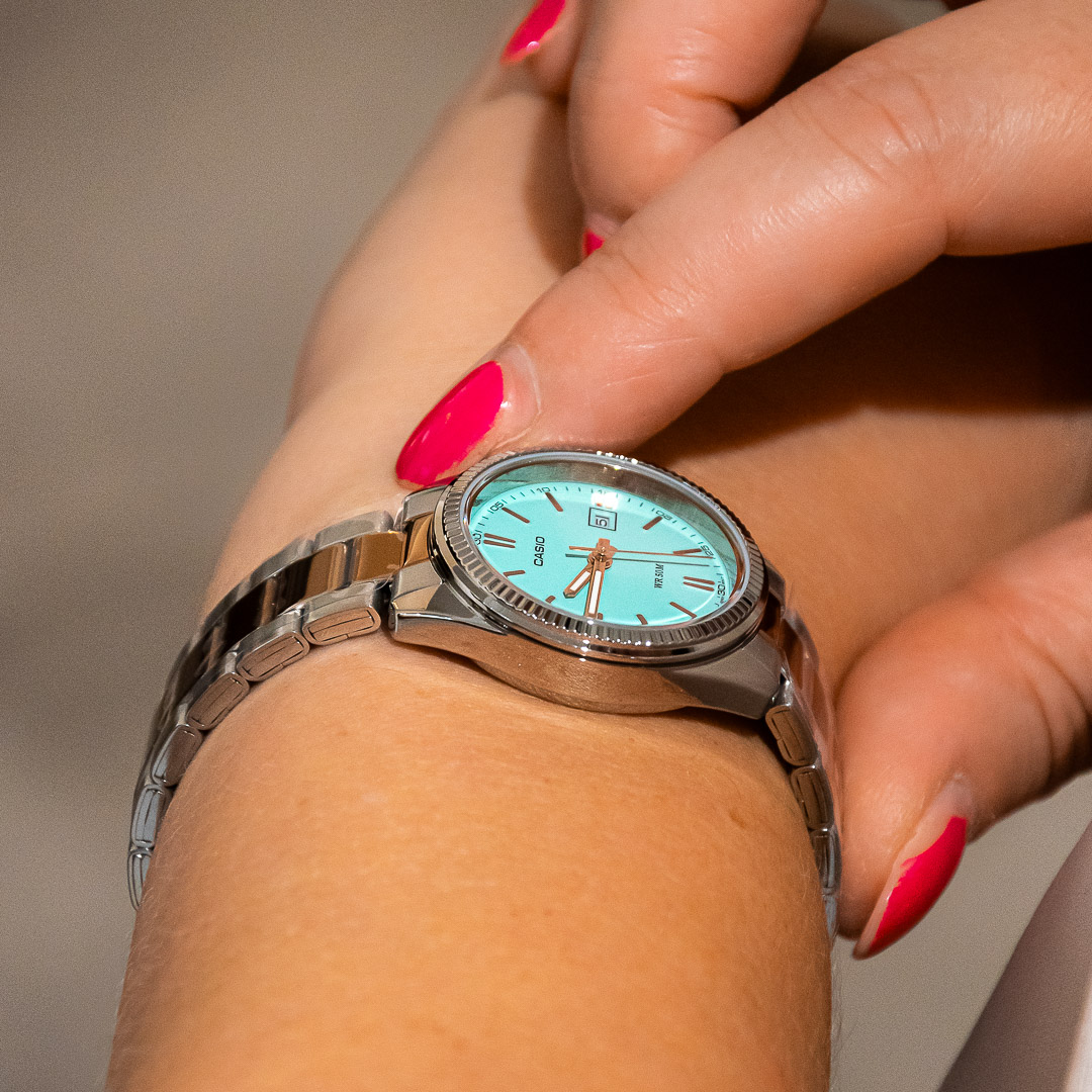 Die LTP-1302PRG ist die Slim-Version der MTP-1302PD "Turquoise" und bietet ein klassisches Design mit modischen Inspirationen und Rosègold Kontrasten. Der "Turquoise" Look macht diesen CASIO Klassiker einzigartig.