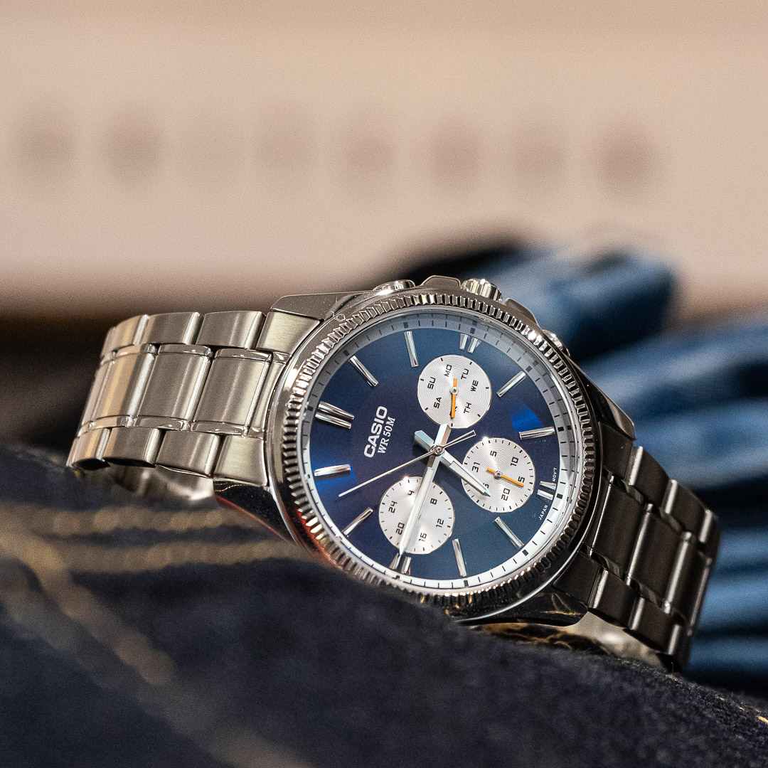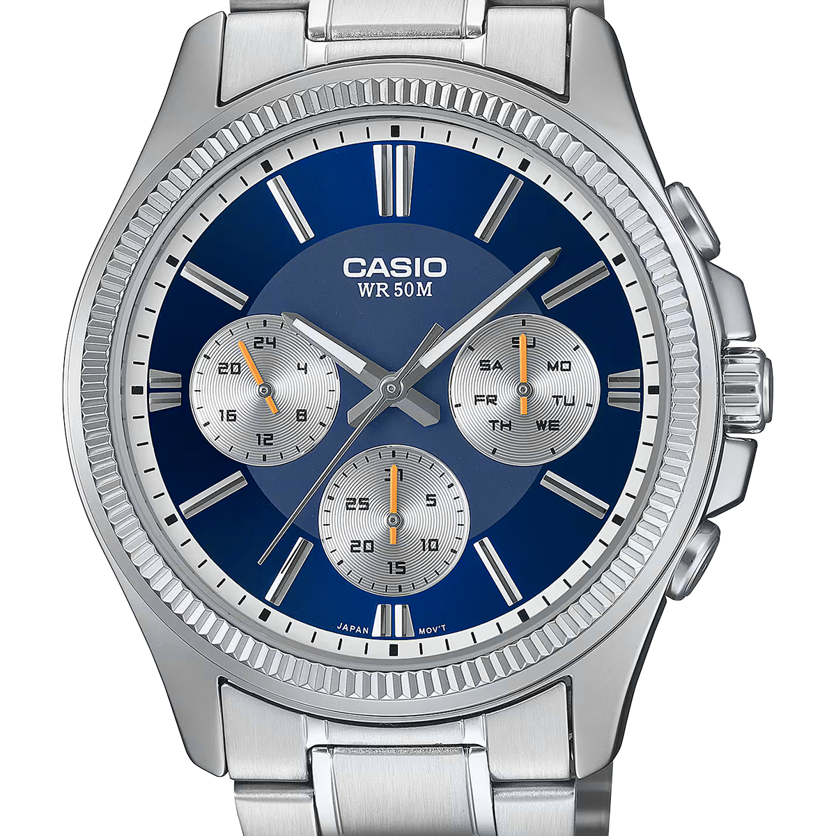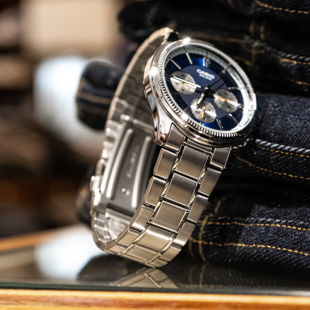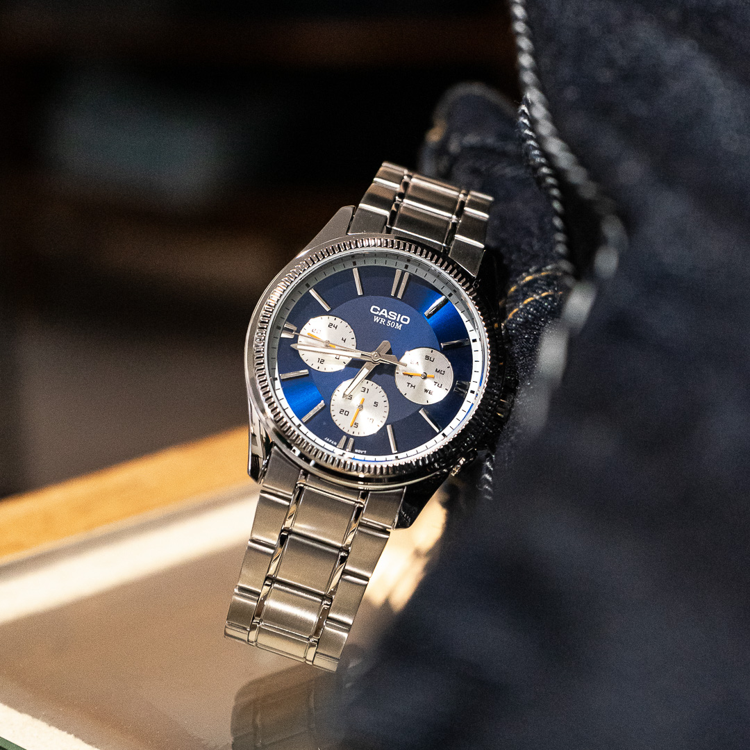Markant und elegant – die CASIO MTP-1375PD ist eine klassisch analoge Uhr aus Edelstahl mit einem Zifferblatt in kräftigen Farben.