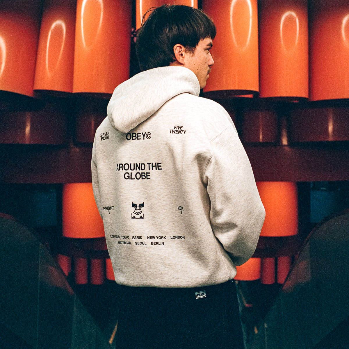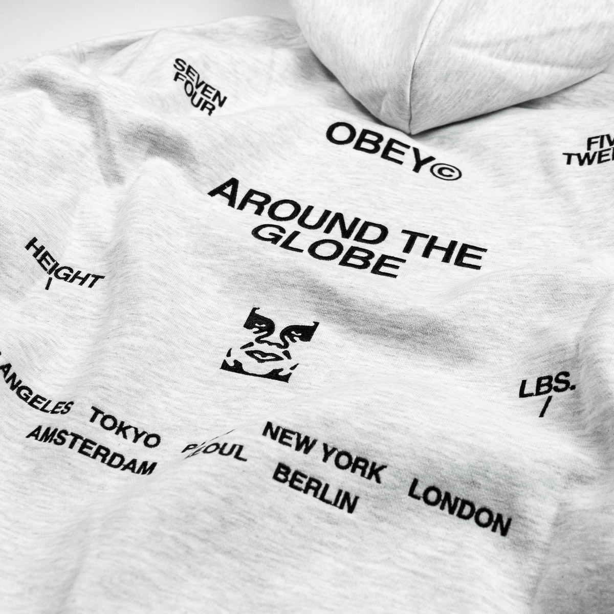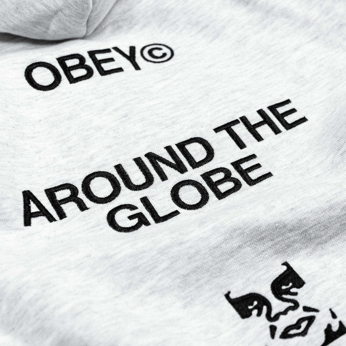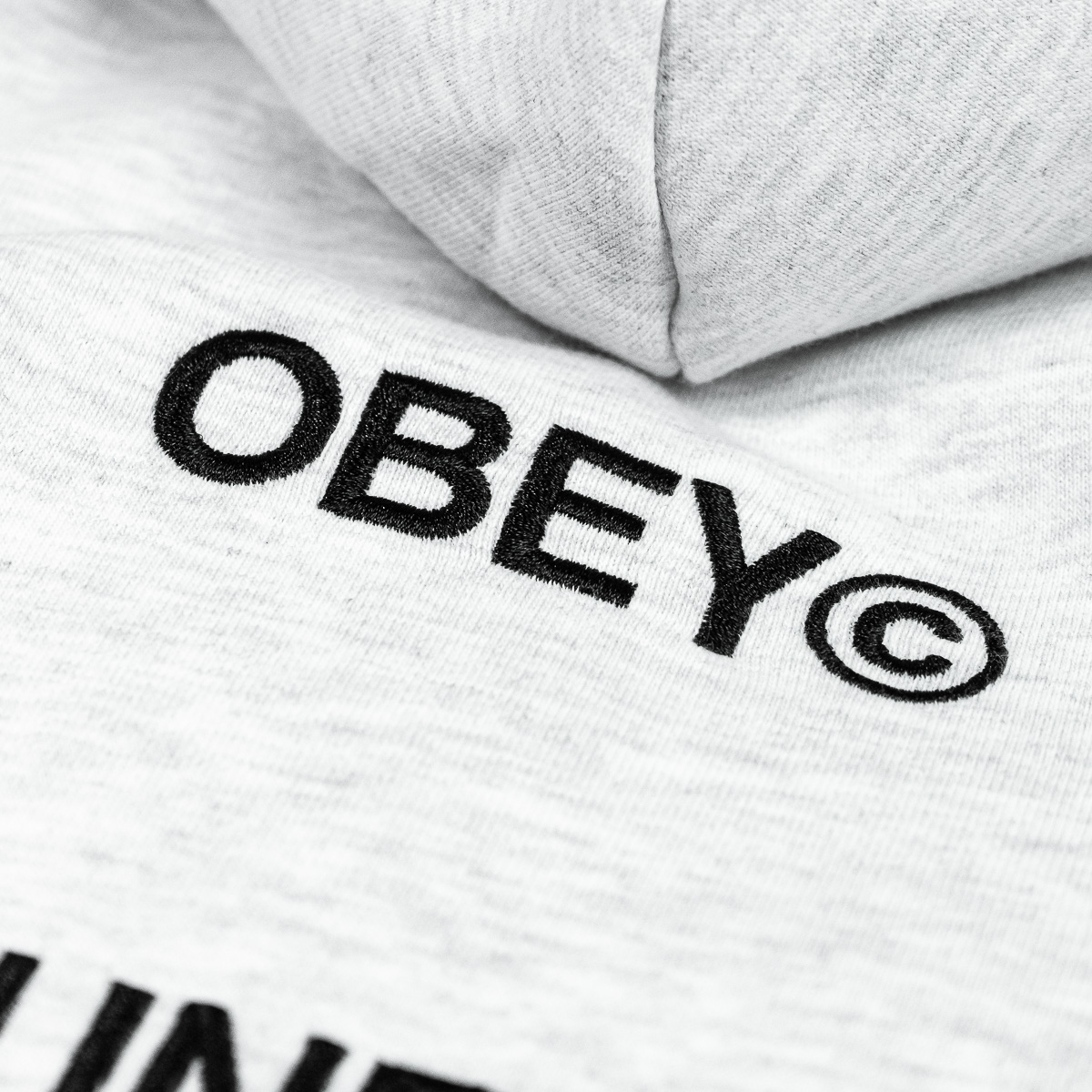 Graues OBEY Business Hoodie in einem Heavyweight Cotton Mix (390g/m Brushed Back) mit gestickter Grafik auf Brust und Rücken.