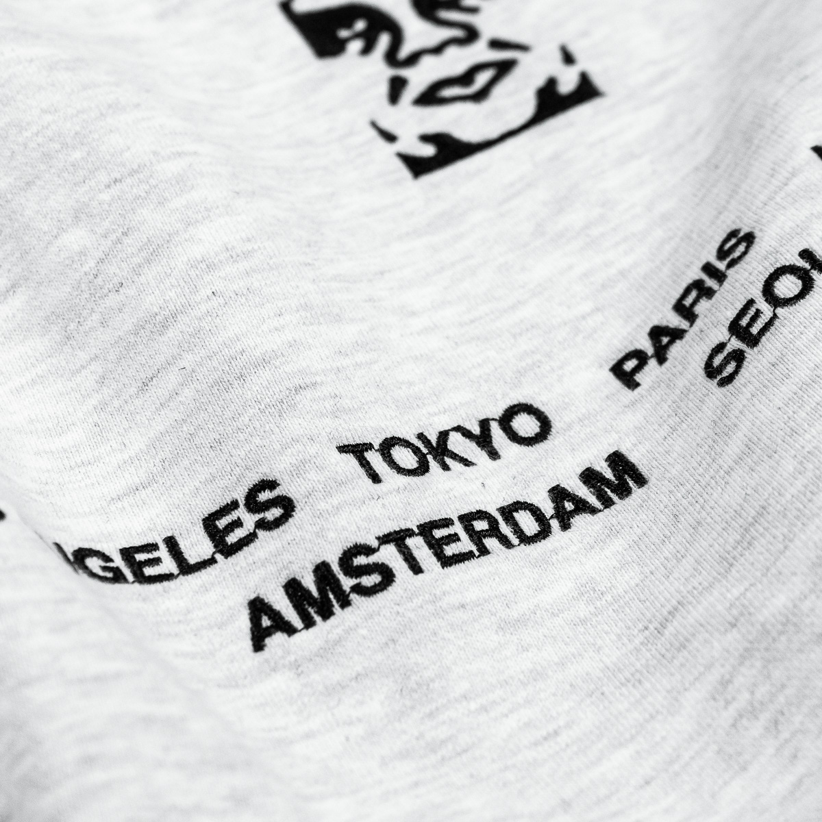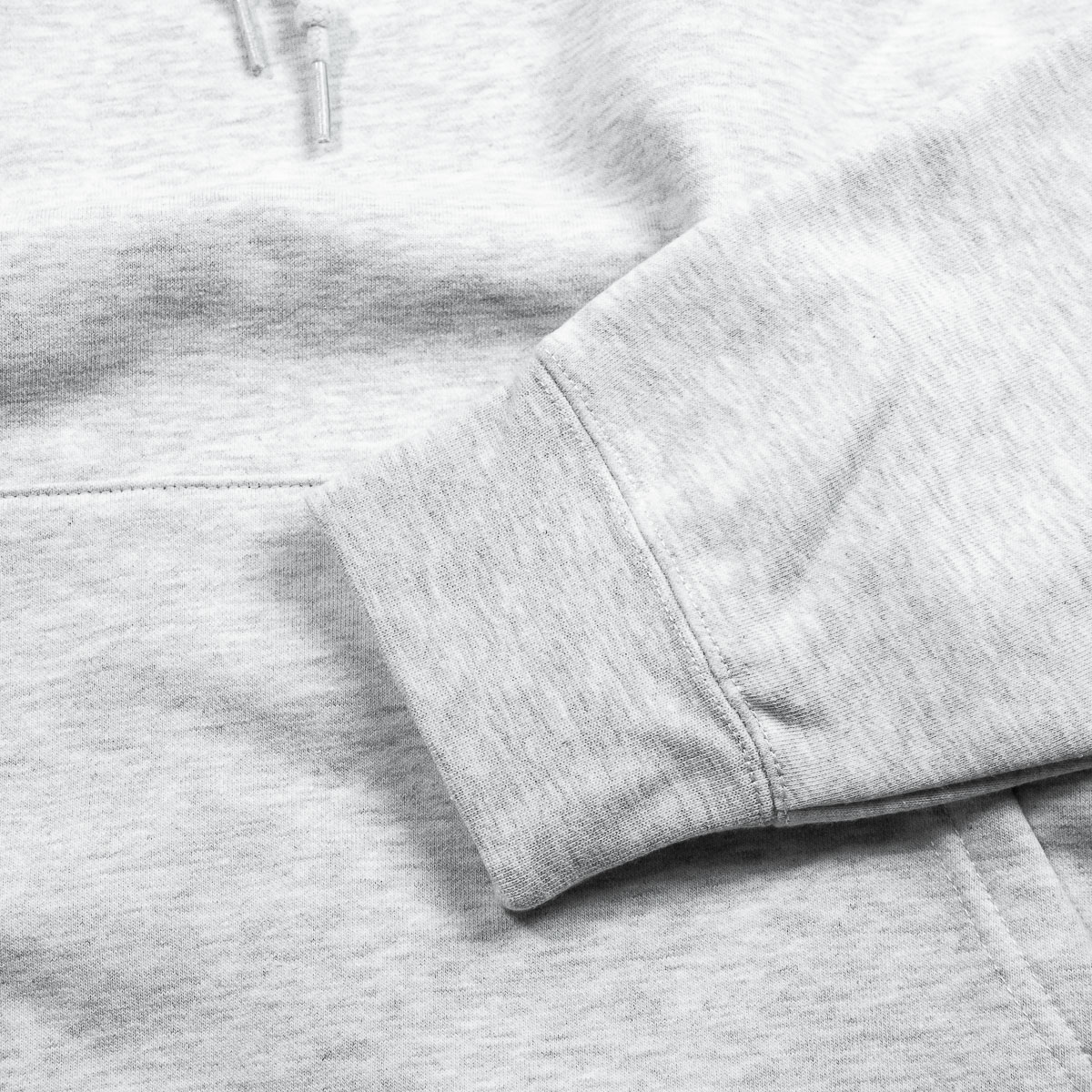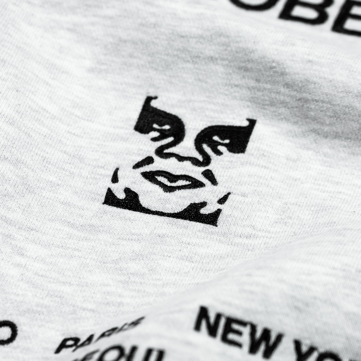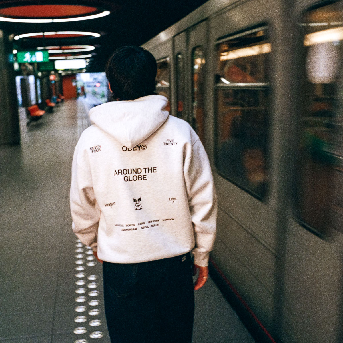 Graues OBEY Business Hoodie in einem Heavyweight Cotton Mix (390g/m Brushed Back) mit gestickter Grafik auf Brust und Rücken.
