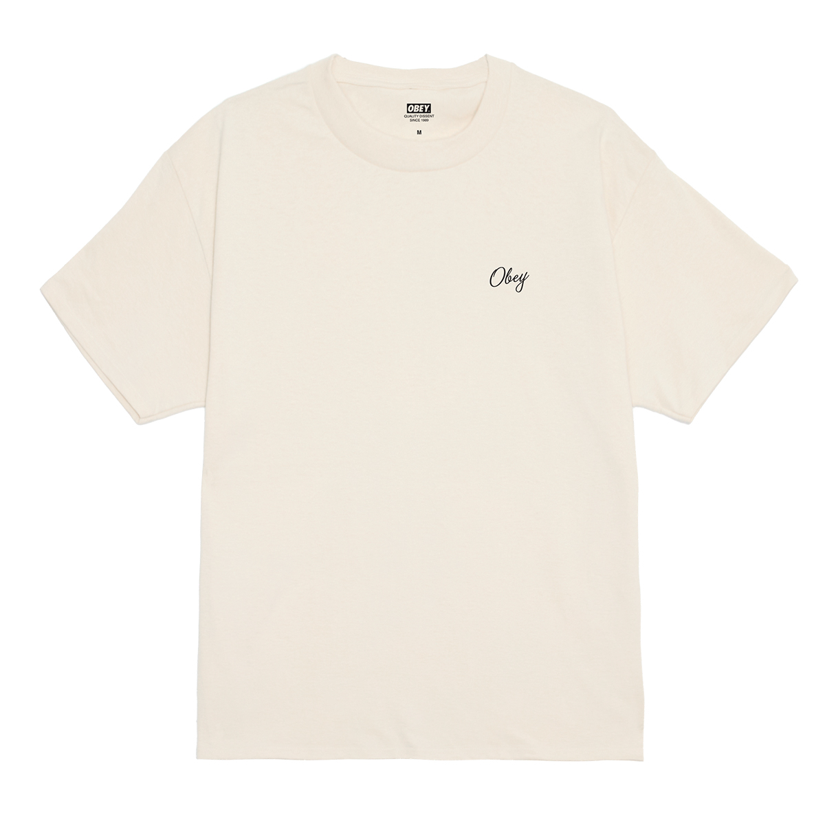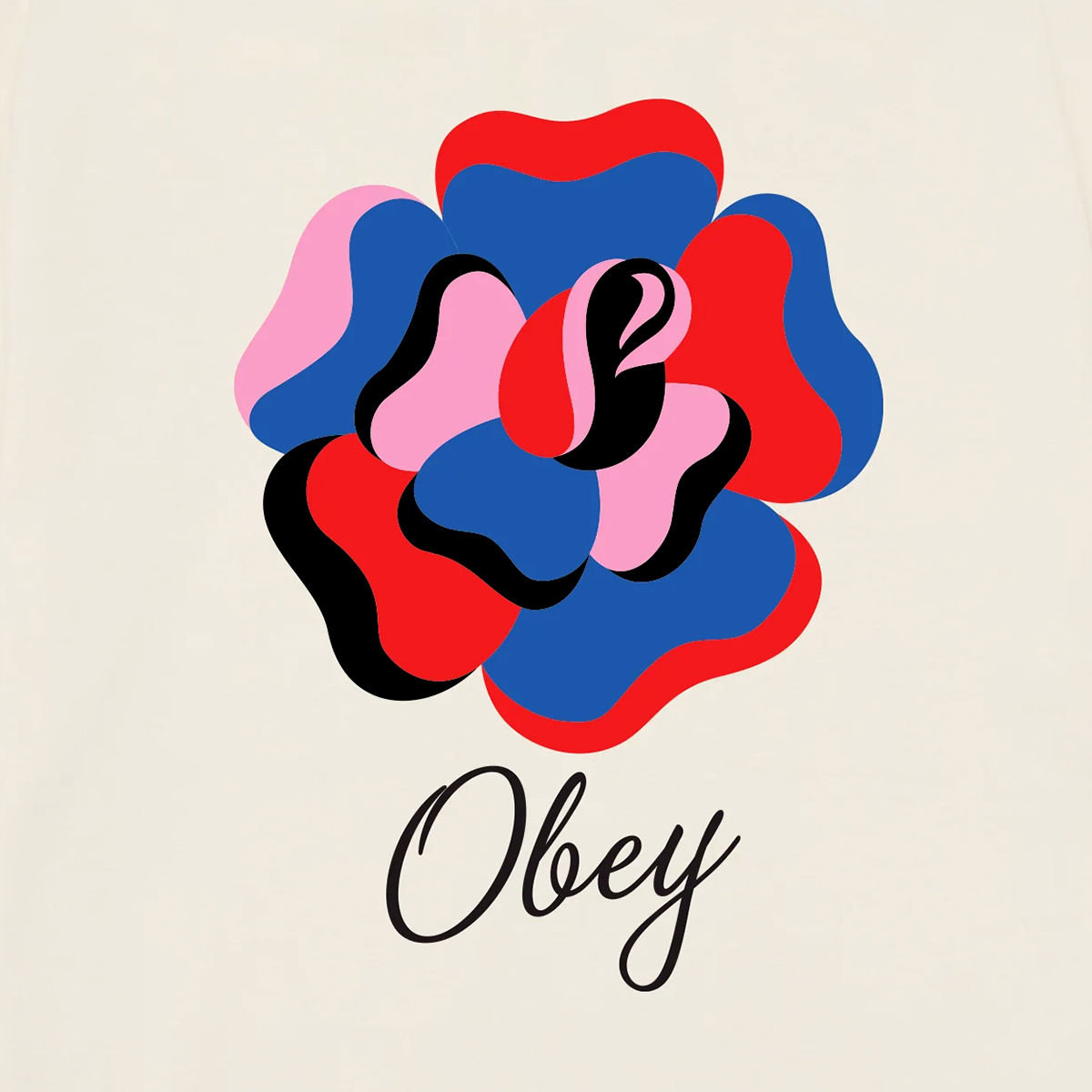 Crèmeweißes OBEY Paper Rose Classic T-Shirt aus 100% Cotton (170g/m Single Jersey) mit gedrucktem Artwork auf der linken Brust und dem Rücken.