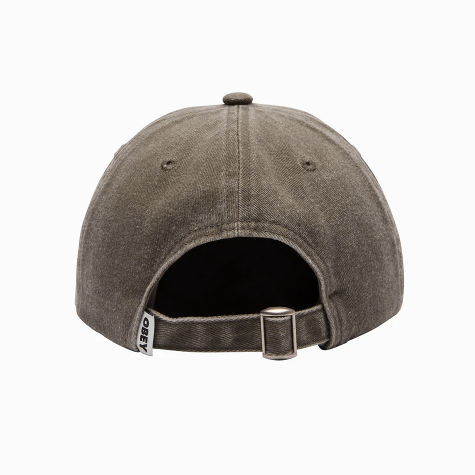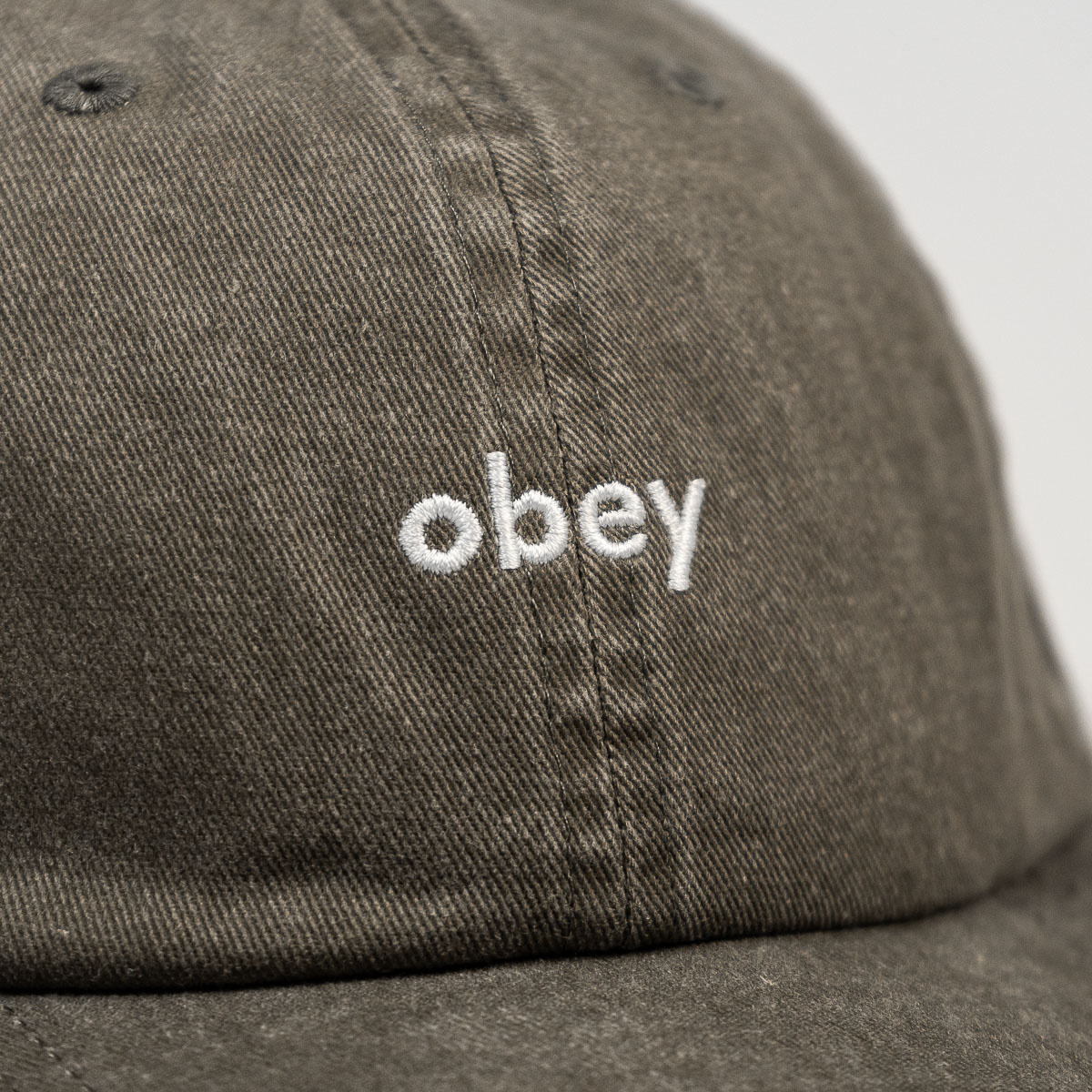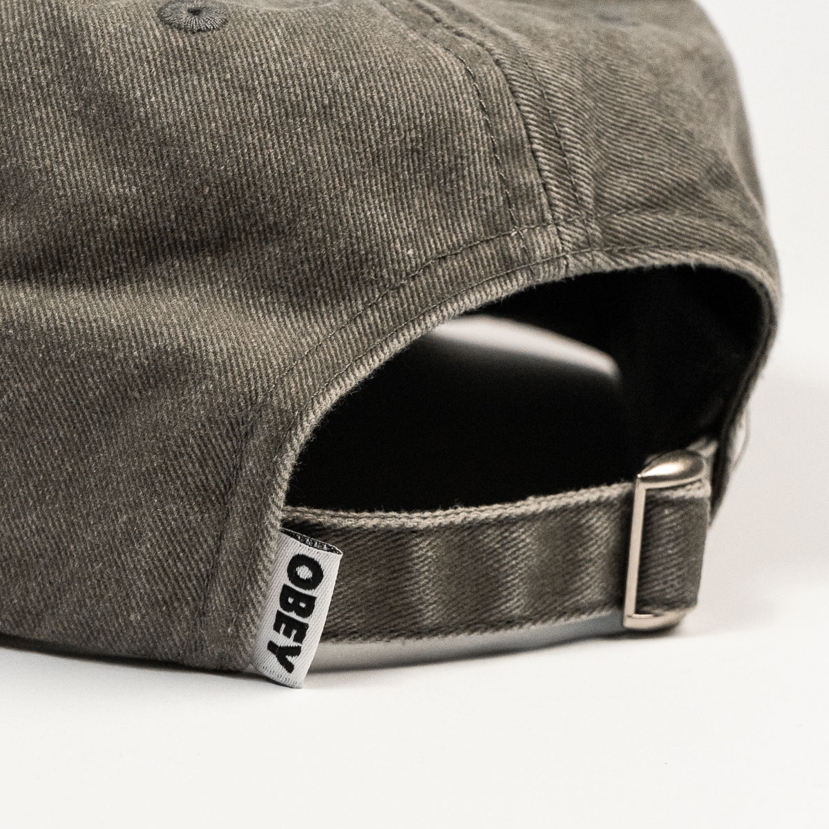 Pigmentgefärbte OBEY Lowercase 6 Panel Strapback Cap aus 100% Cotton mit gesticktem Logo auf der Front und kleinem Woven Label am Verschluss.