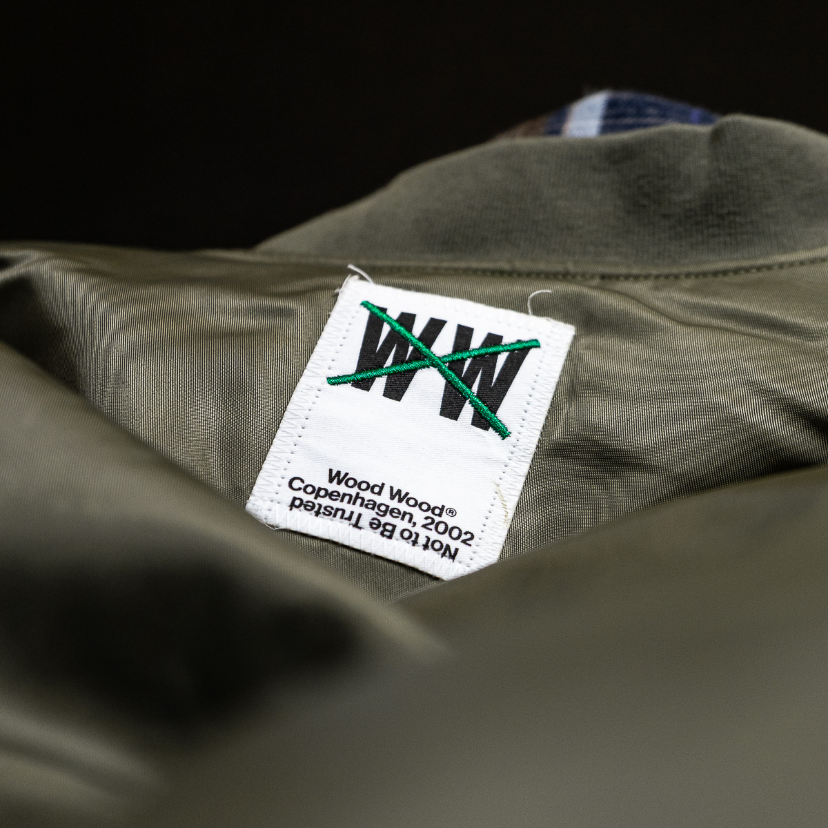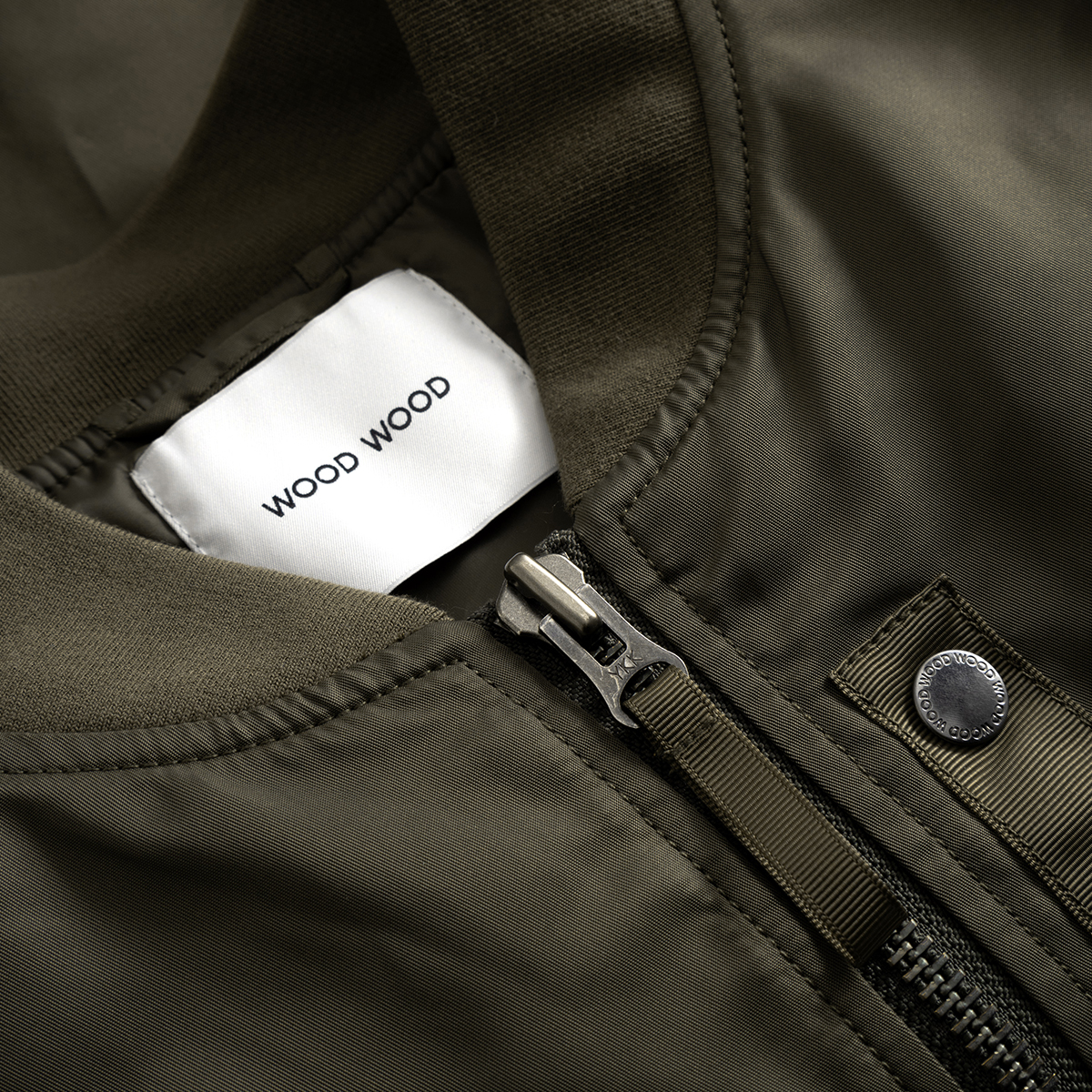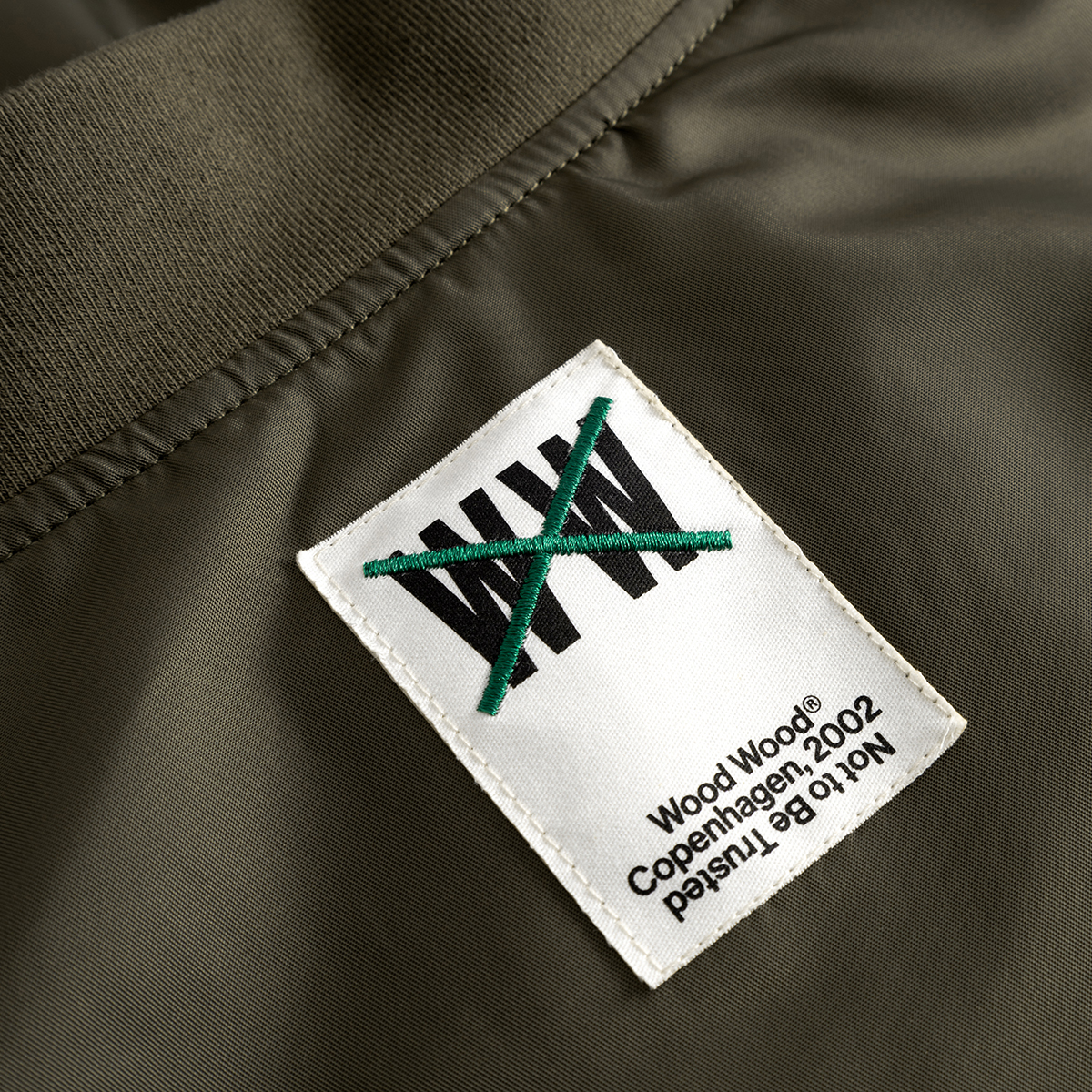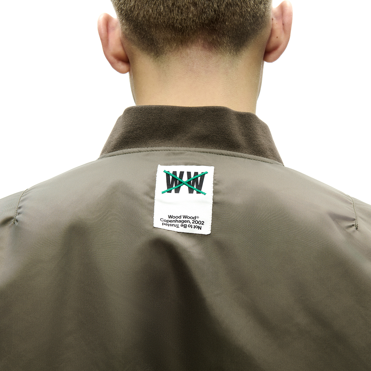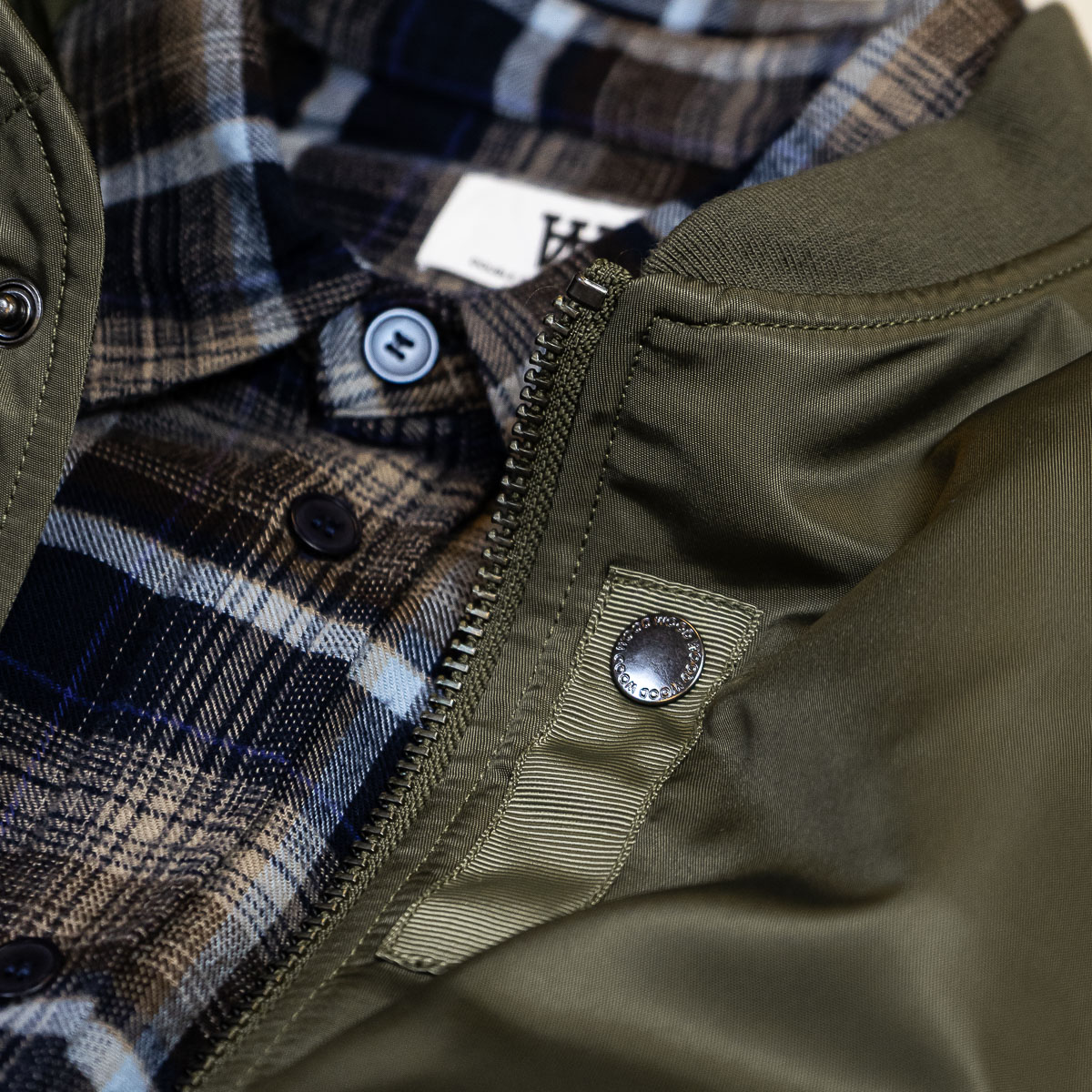 Klassische Bomber Jacke aus hochwertigem Nylongewebe verfügt über einen Zwei-Wege-Reißverschluss, gerippten Kragen, Saum und Bündchen sowie zwei Seitentaschen und eine Innentasche. Sie ist klassisch geschnitten, gefüttert und mit einem „Wood Wood“ Branding im Nacken versehen.