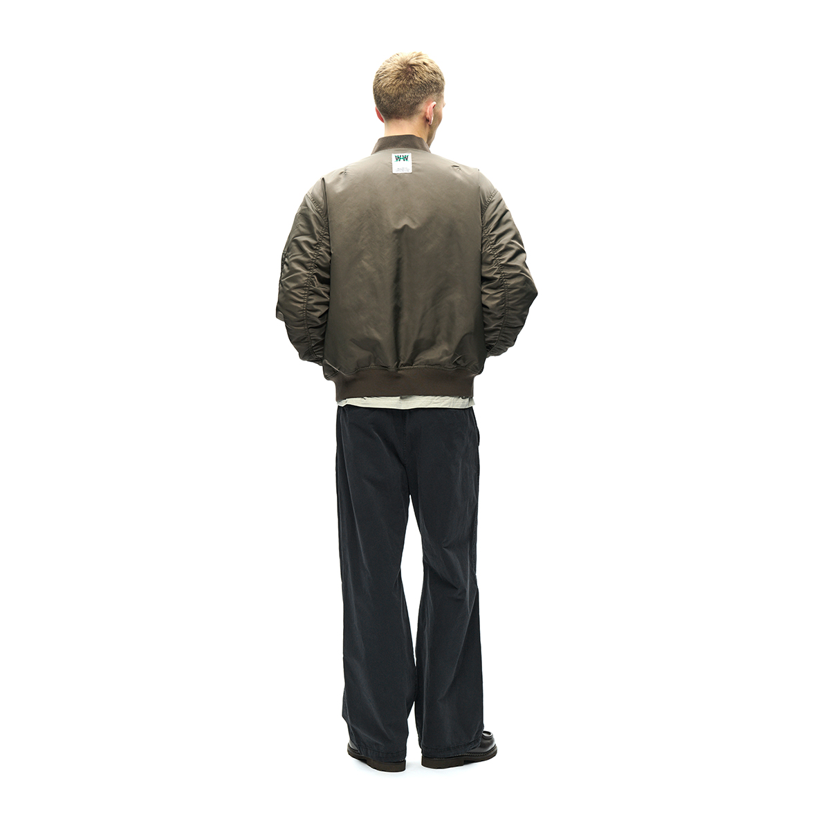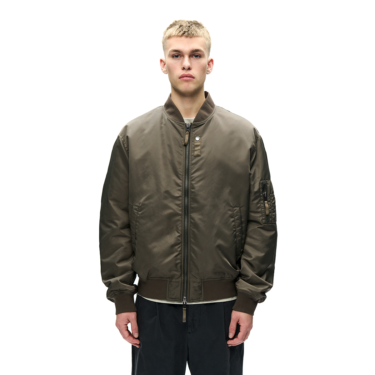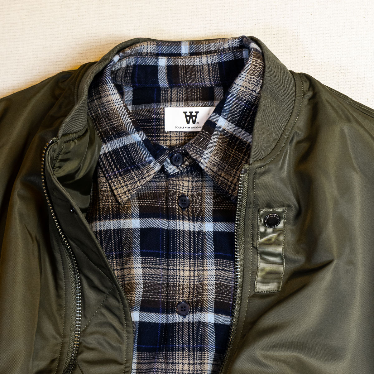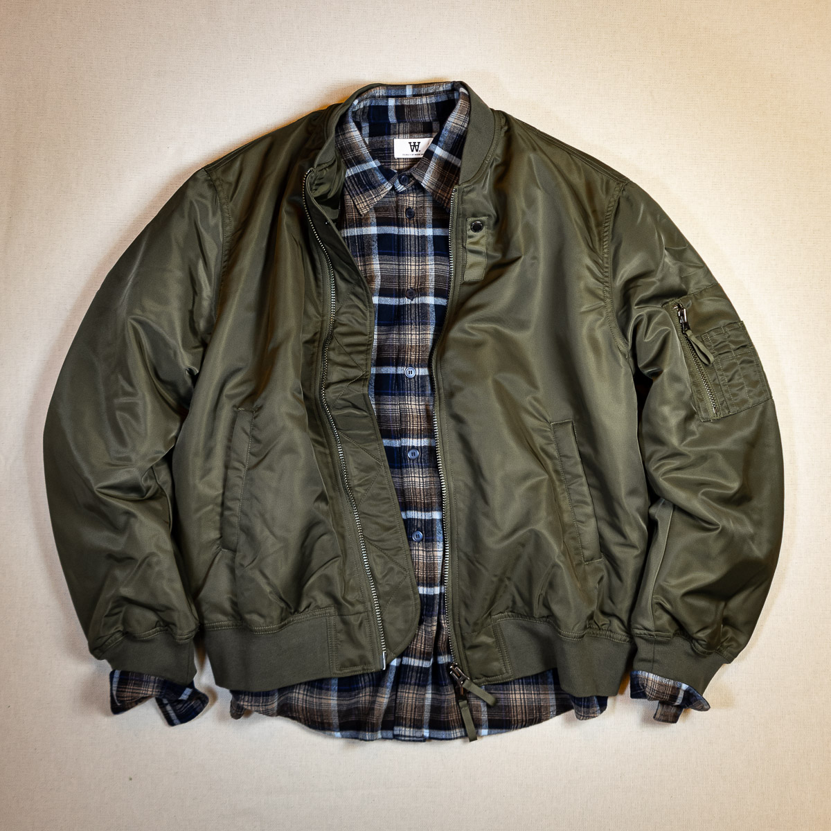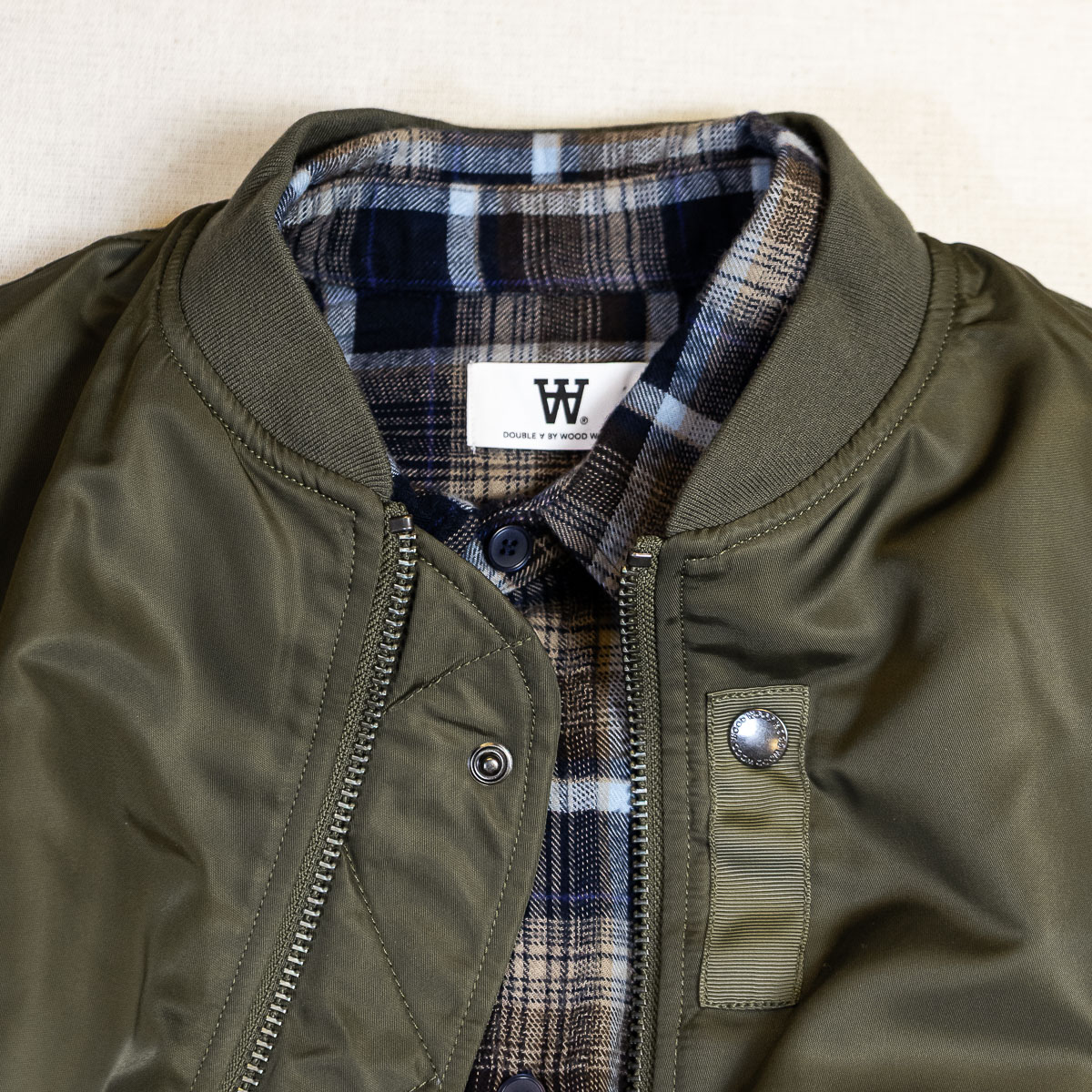 Klassische Bomber Jacke aus hochwertigem Nylongewebe verfügt über einen Zwei-Wege-Reißverschluss, gerippten Kragen, Saum und Bündchen sowie zwei Seitentaschen und eine Innentasche. Sie ist klassisch geschnitten, gefüttert und mit einem „Wood Wood“ Branding im Nacken versehen.