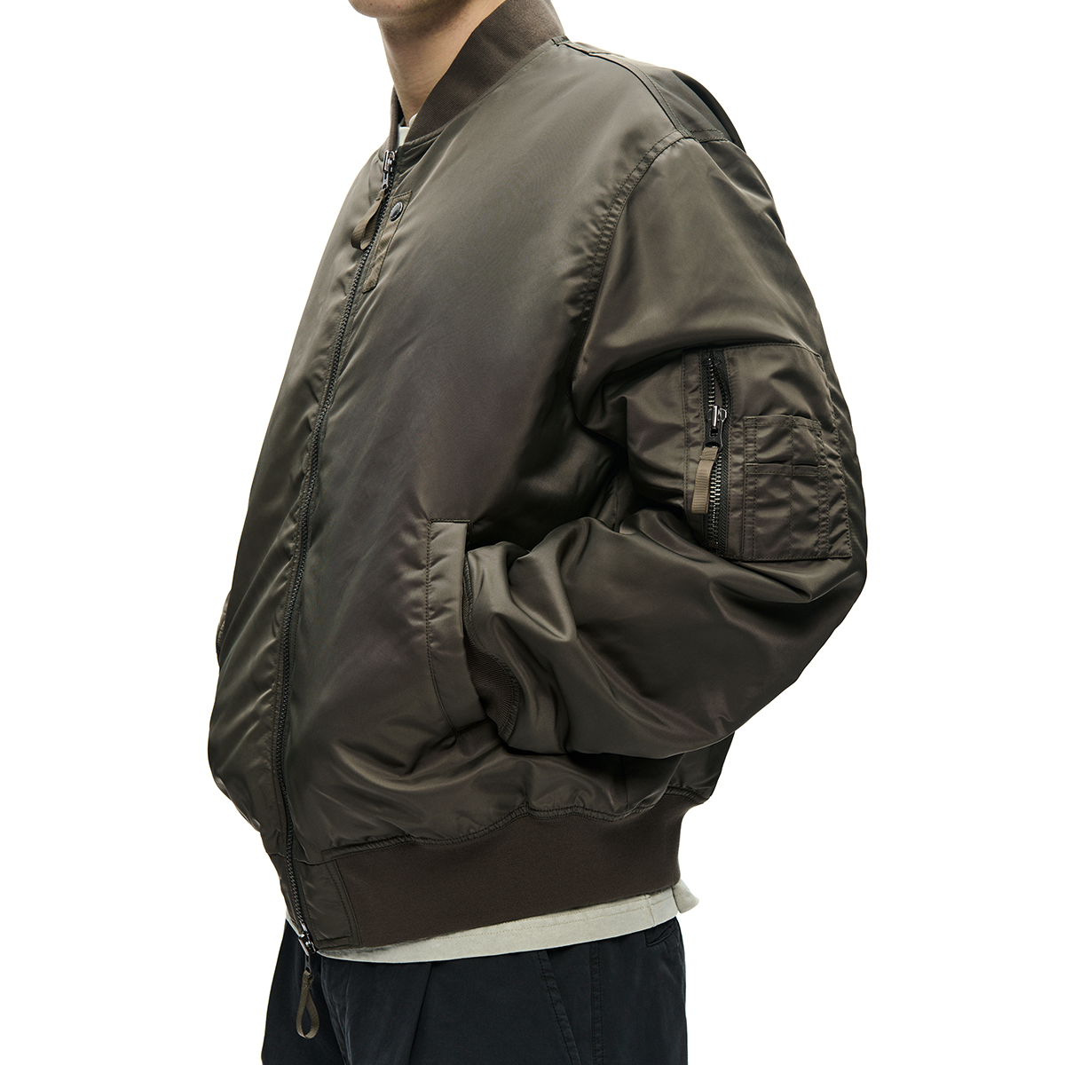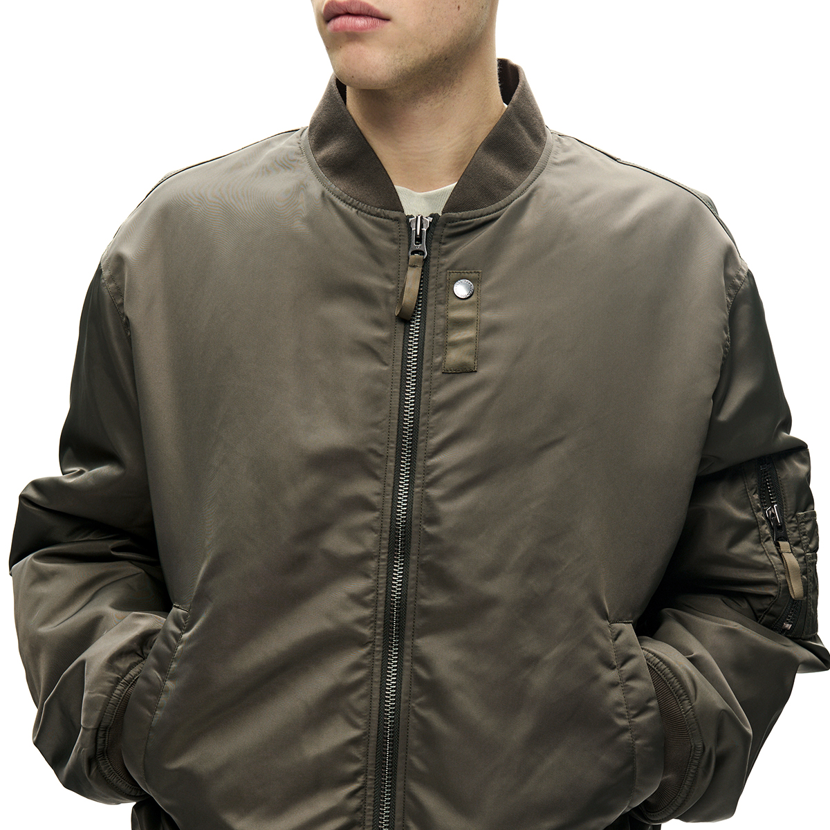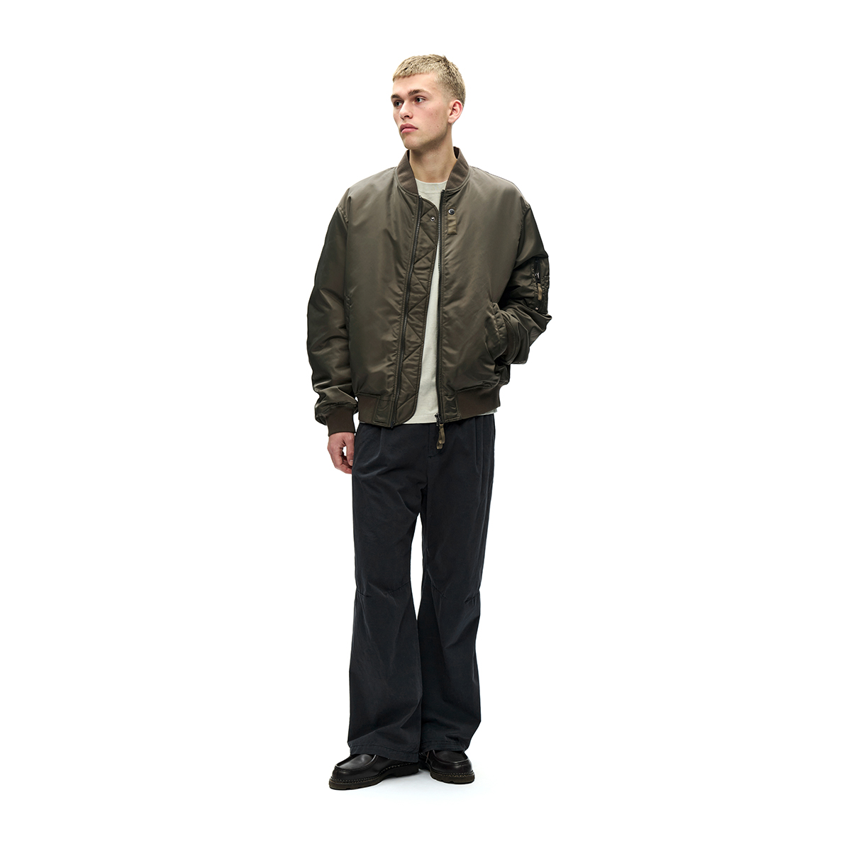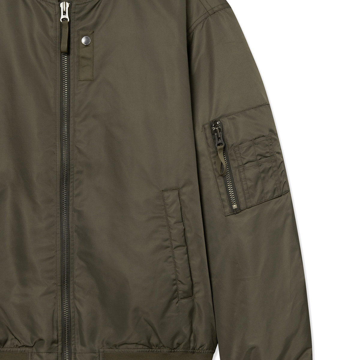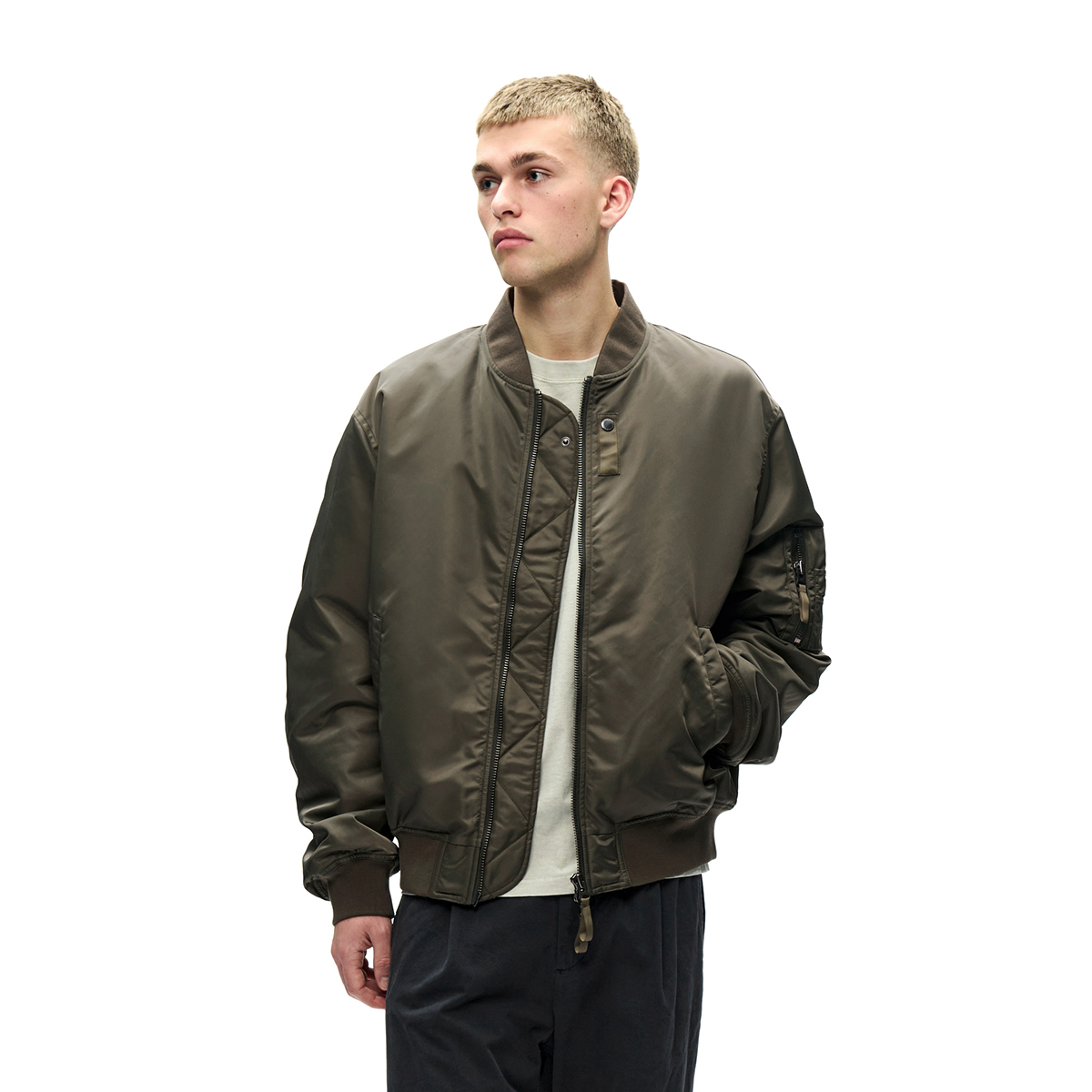 Klassische Bomber Jacke aus hochwertigem Nylongewebe verfügt über einen Zwei-Wege-Reißverschluss, gerippten Kragen, Saum und Bündchen sowie zwei Seitentaschen und eine Innentasche. Sie ist klassisch geschnitten, gefüttert und mit einem „Wood Wood“ Branding im Nacken versehen.