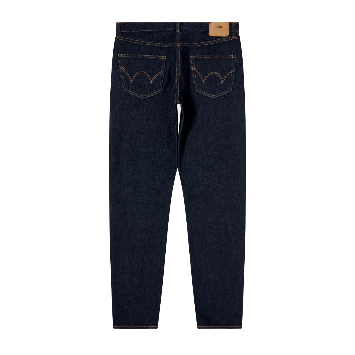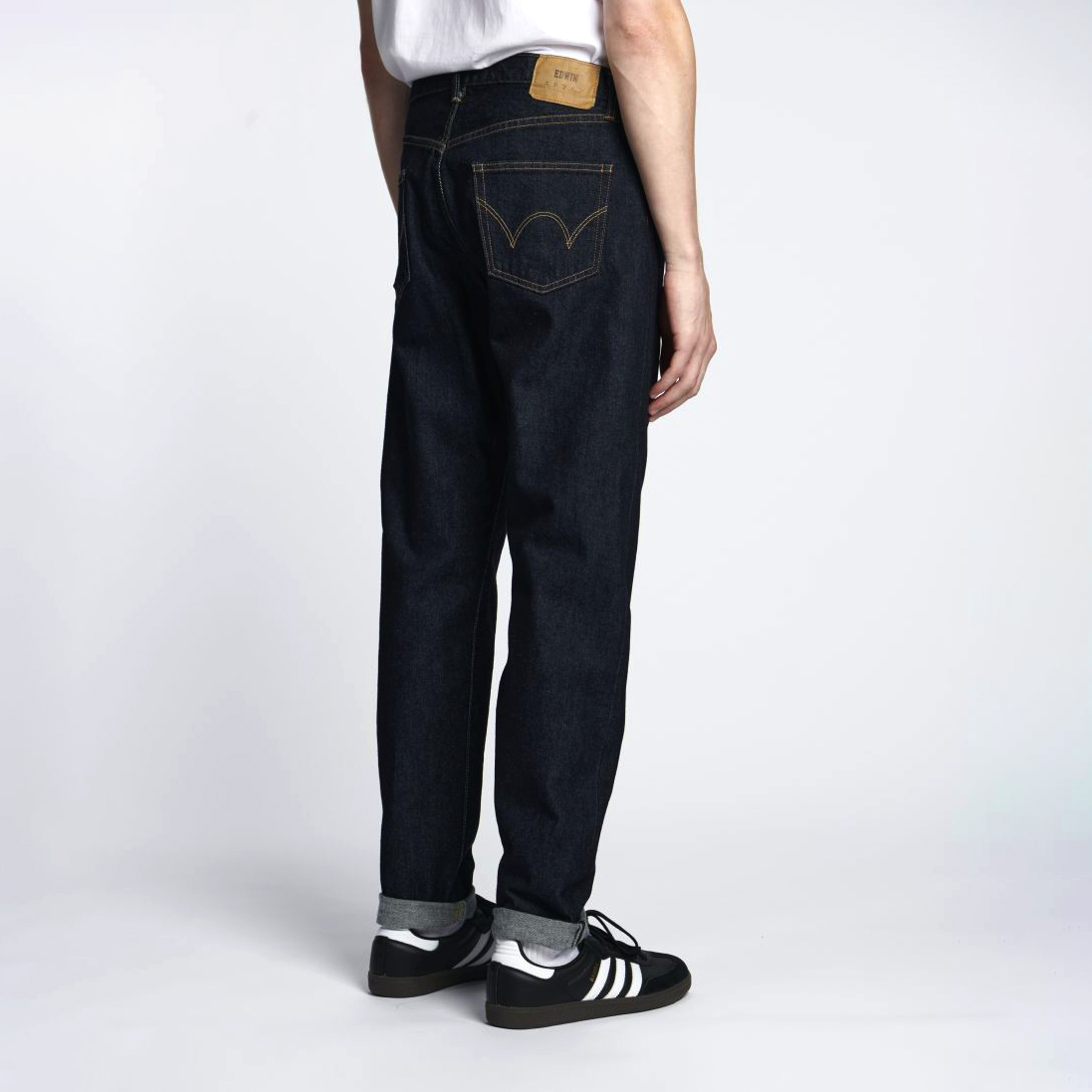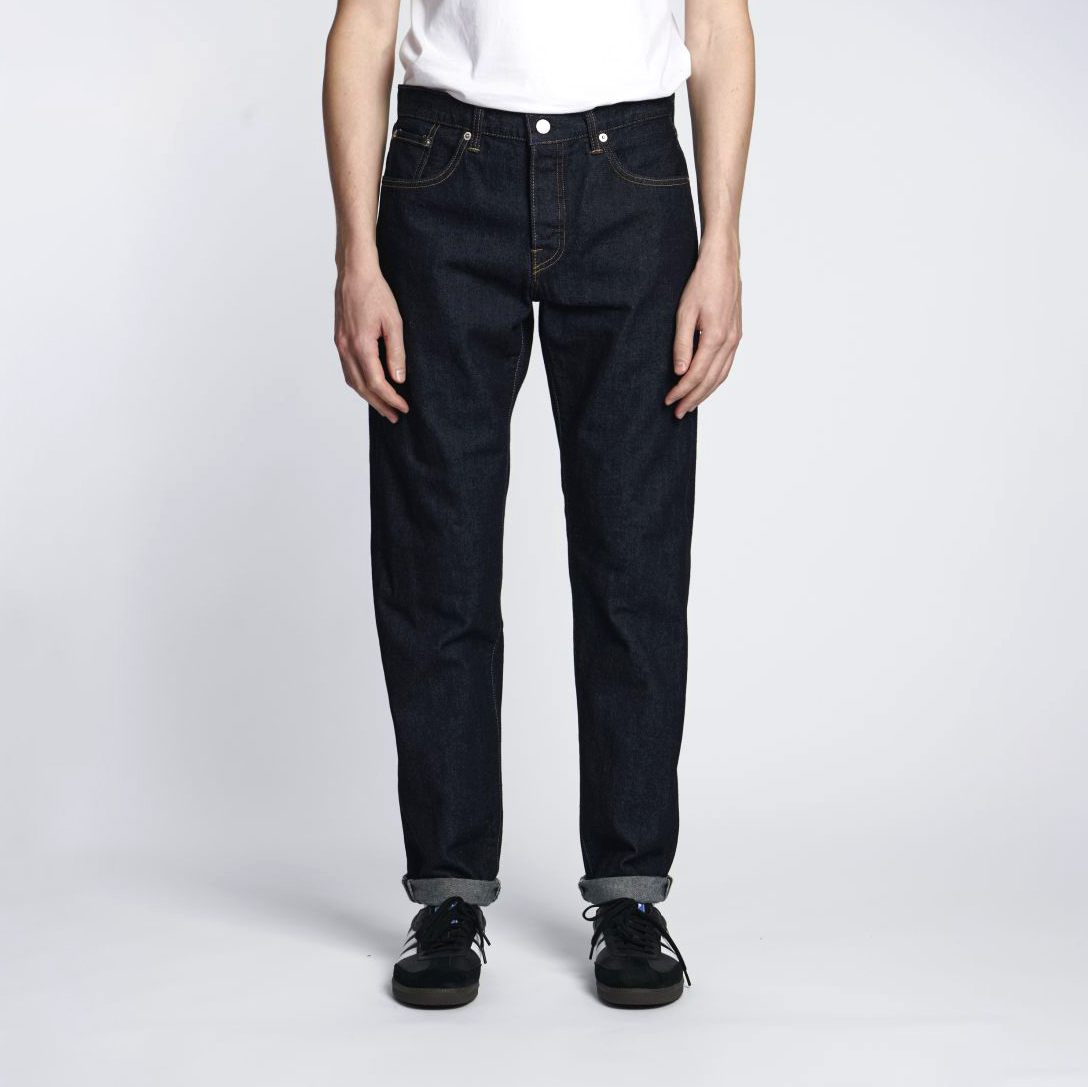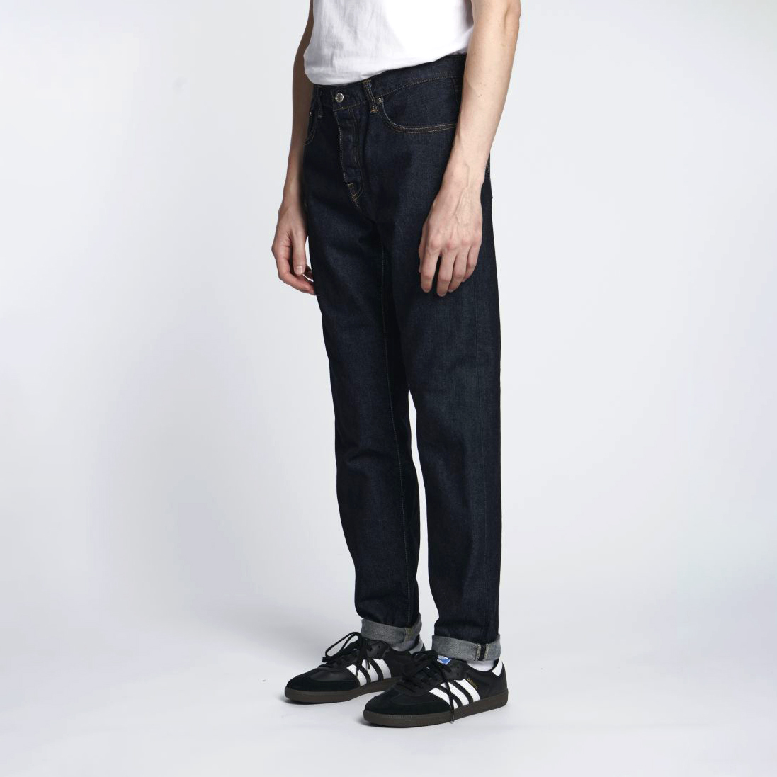 Dunkelblaues Rinsed Denim in einem Tapered Fit - relaxed geschnitten aber leicht schmaler nach unten zulaufend, mit mittellangem Schritt und Knopfleiste (Button Fly).