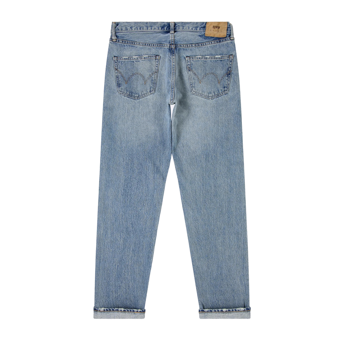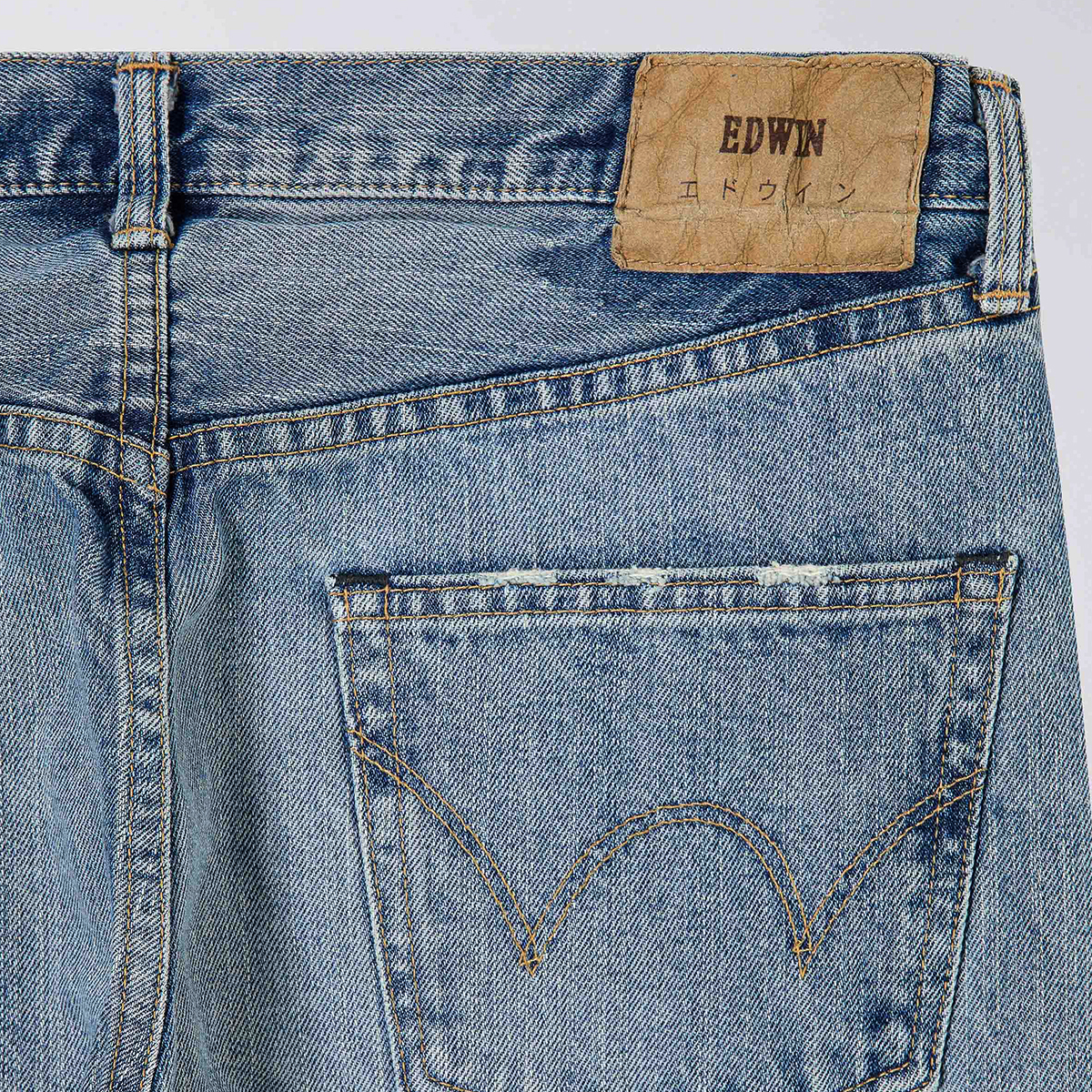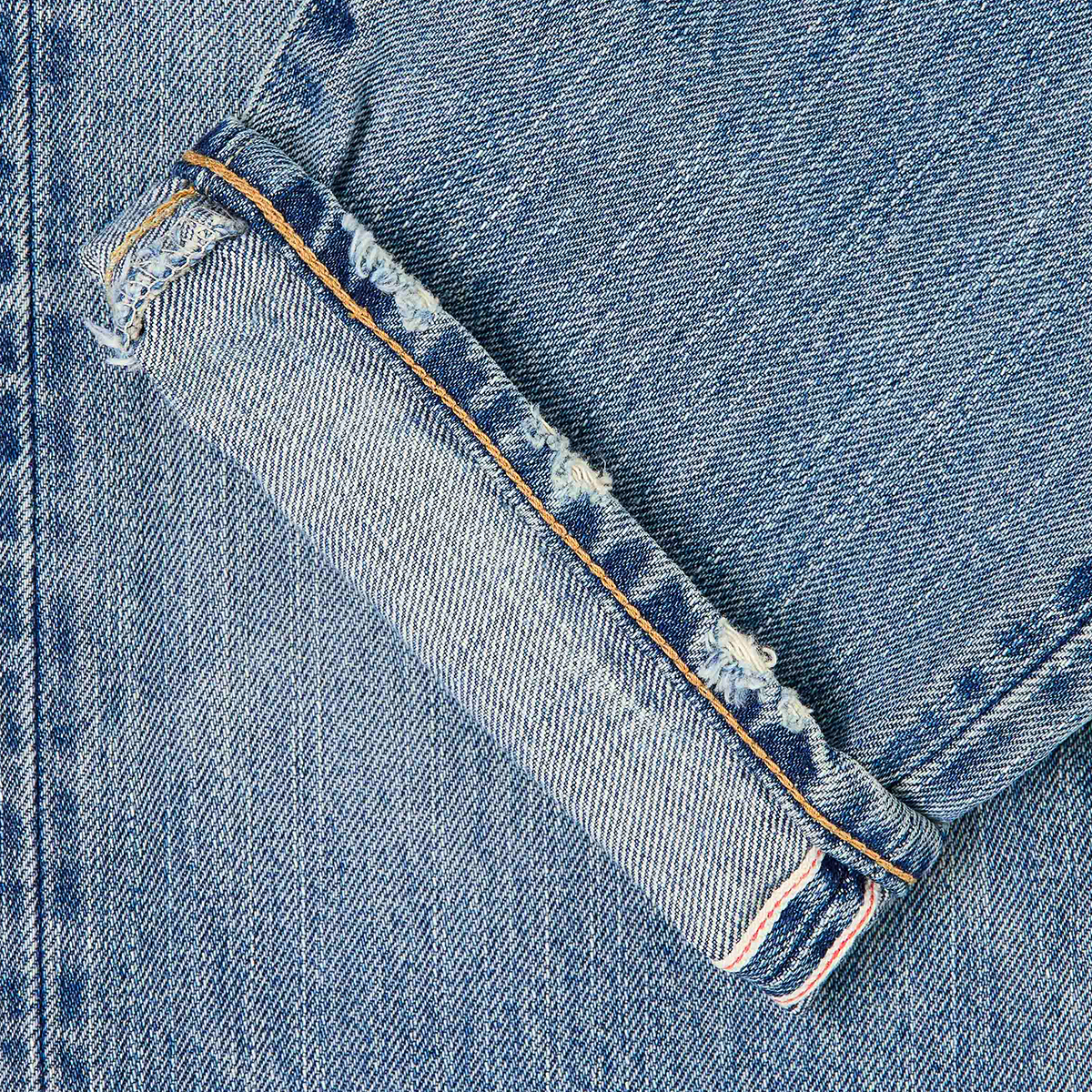 Light used washed Red Selvage Raw Denim in einem Tapered Fit - relaxed geschnitten aber leicht schmaler nach unten zulaufend, mit mittellangem Schritt und Knopfleiste (Button Fly).