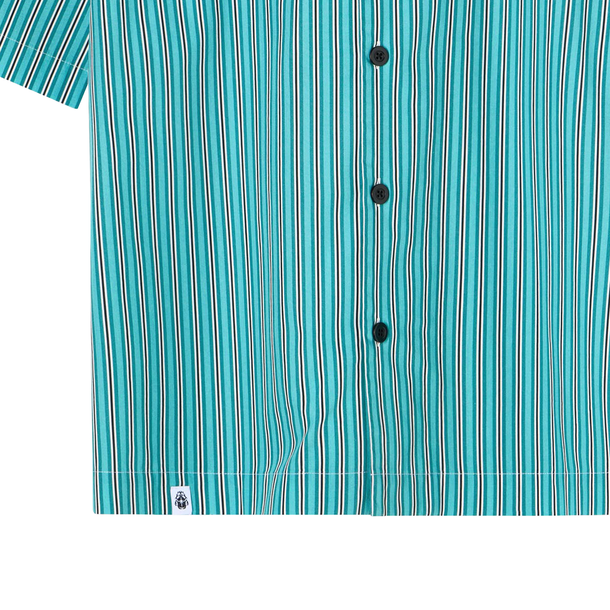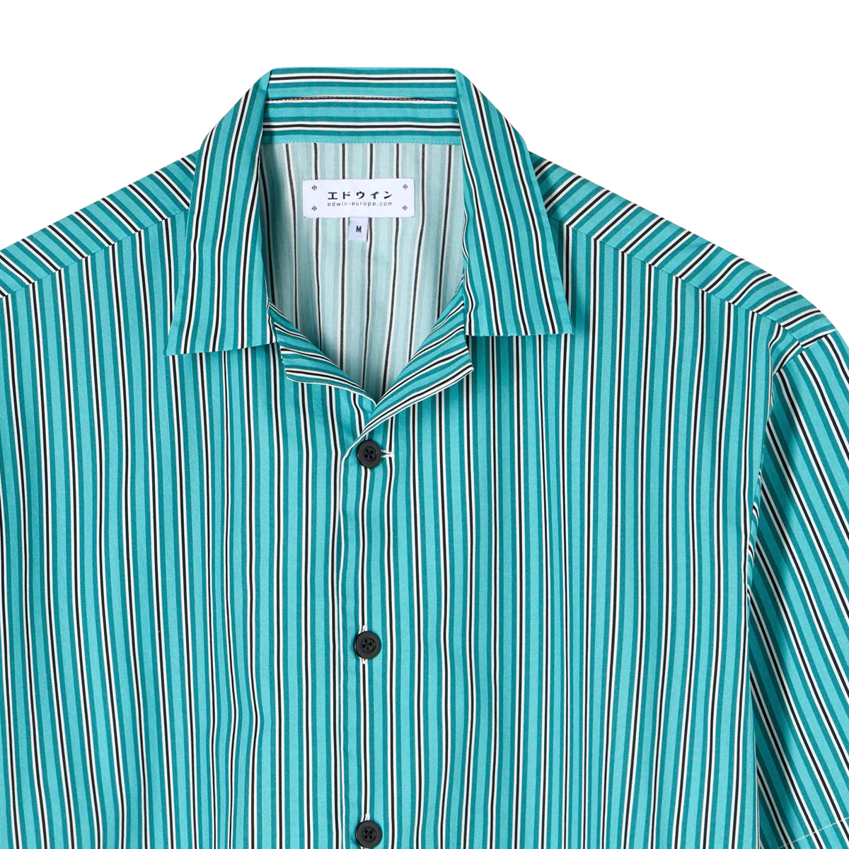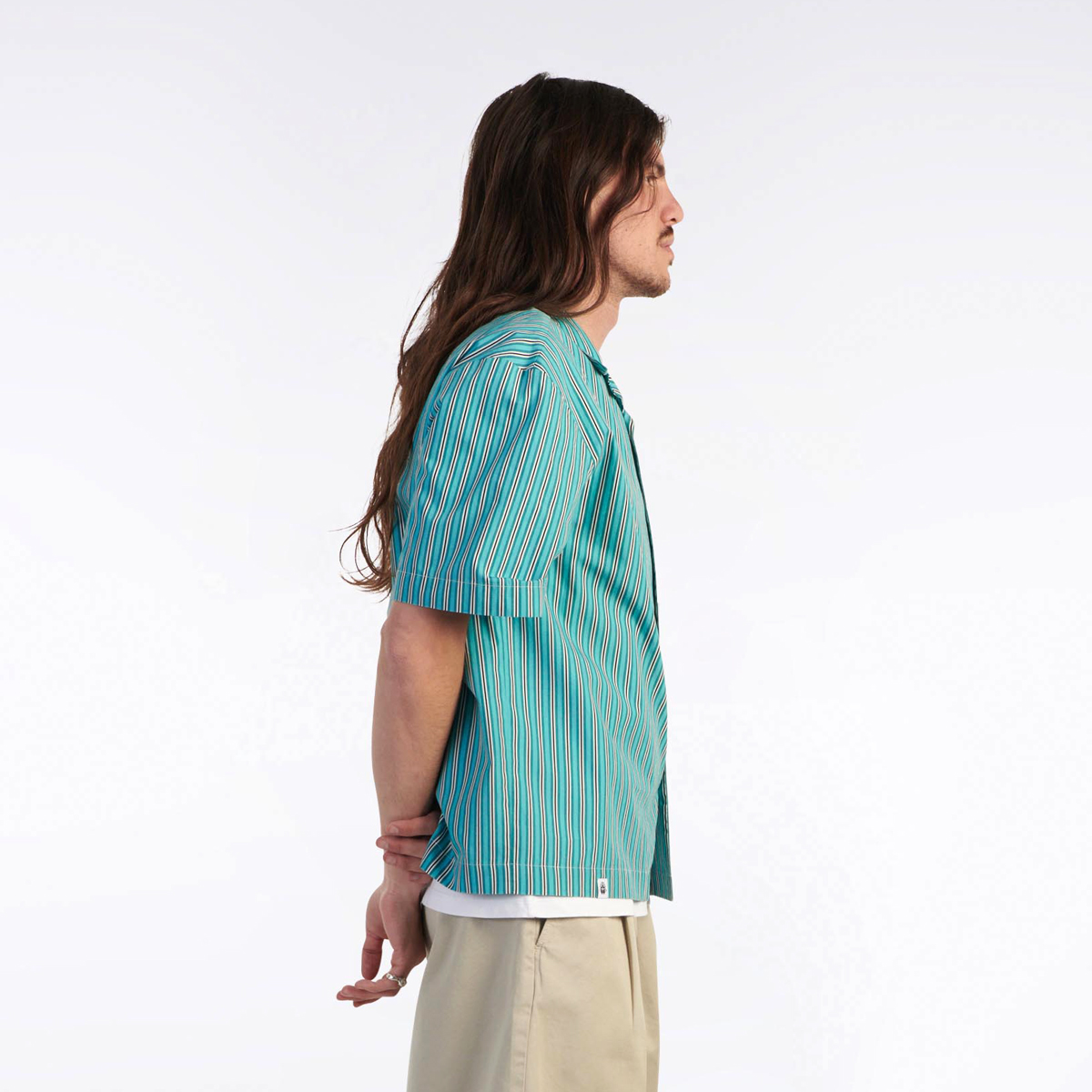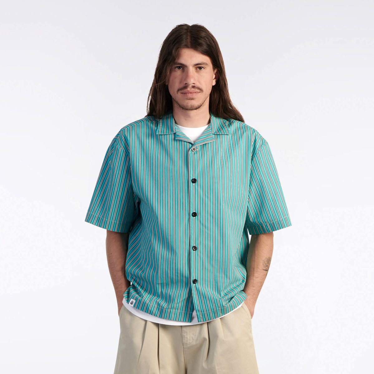 Das EDWIN Saga Shirt ist ein Relaxed-Fit geschnittenes Kurzarmhemd aus 120g/m² Popeline in Streifenoptik.