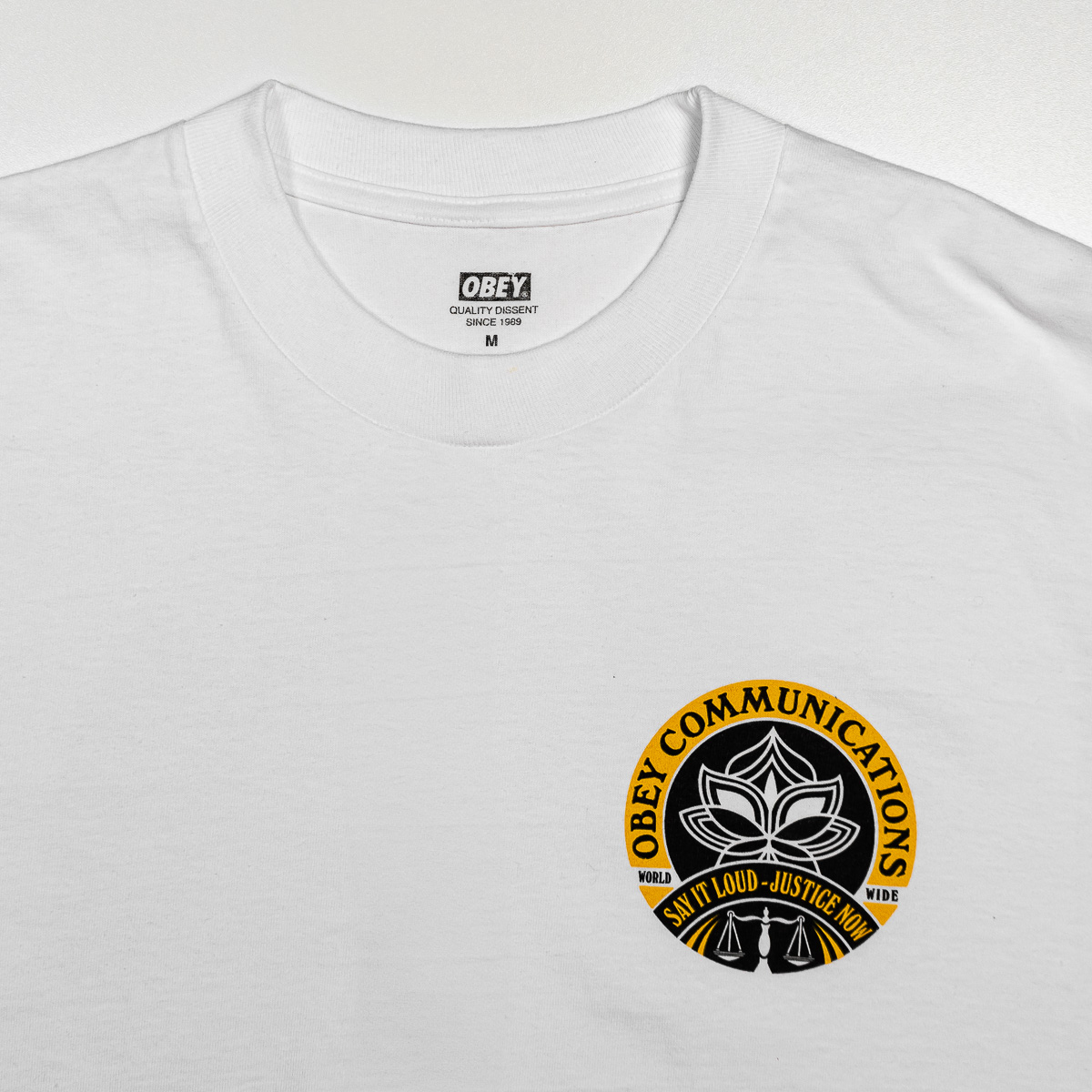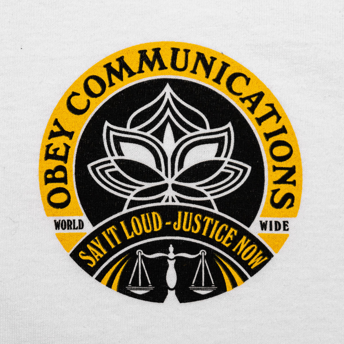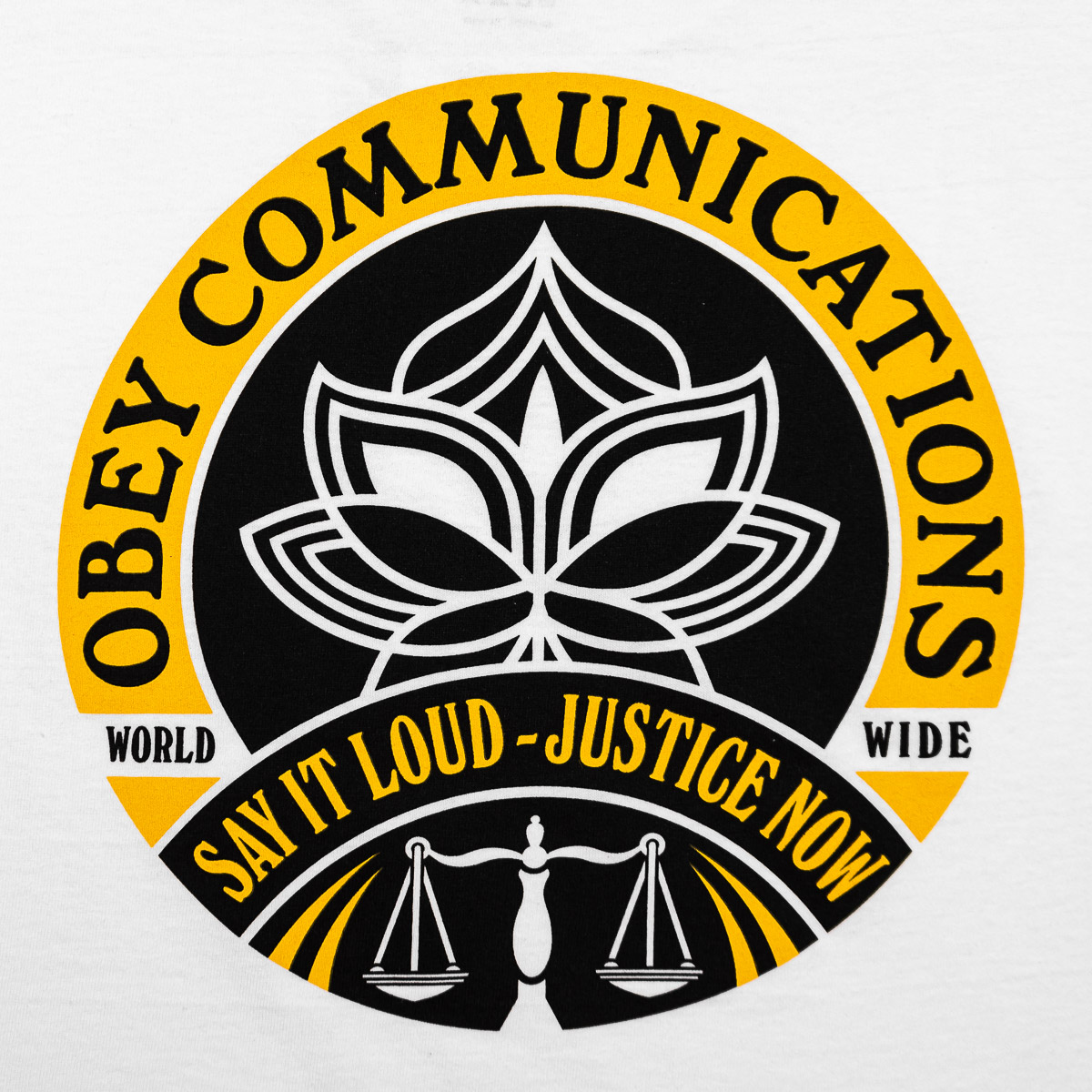 Weißes OBEY Say It Loud Lotus T-Shirt aus 100% Cotton (170g/m Single Jersey) mit gedrucktem Artwork auf der linken Brust und dem Rücken.