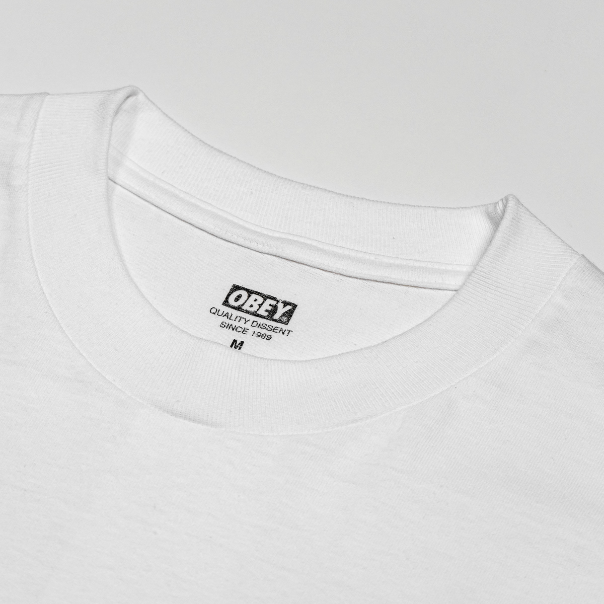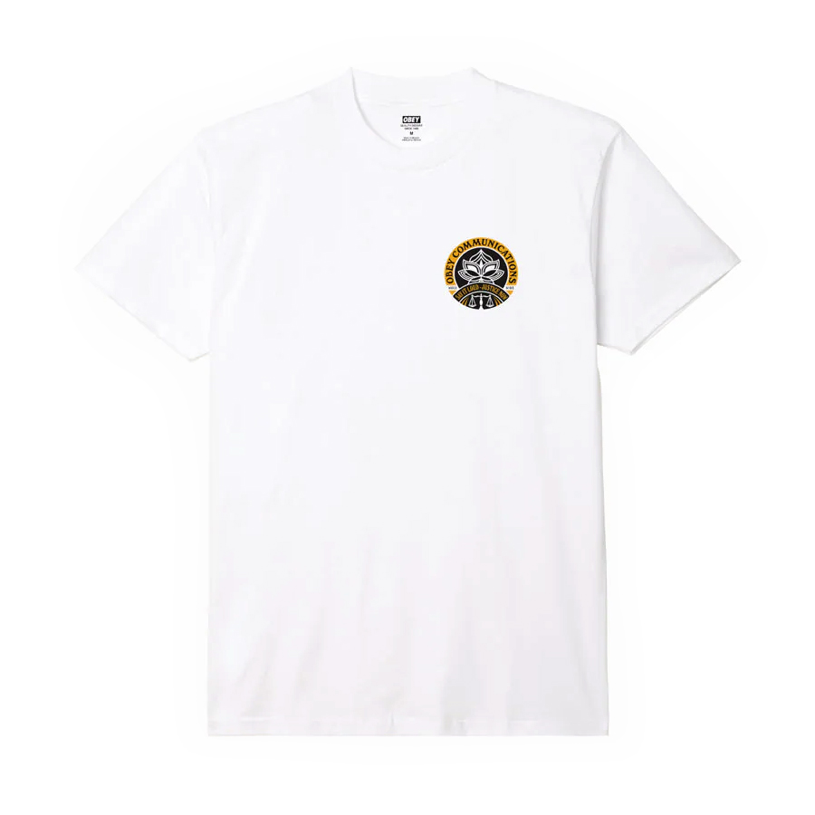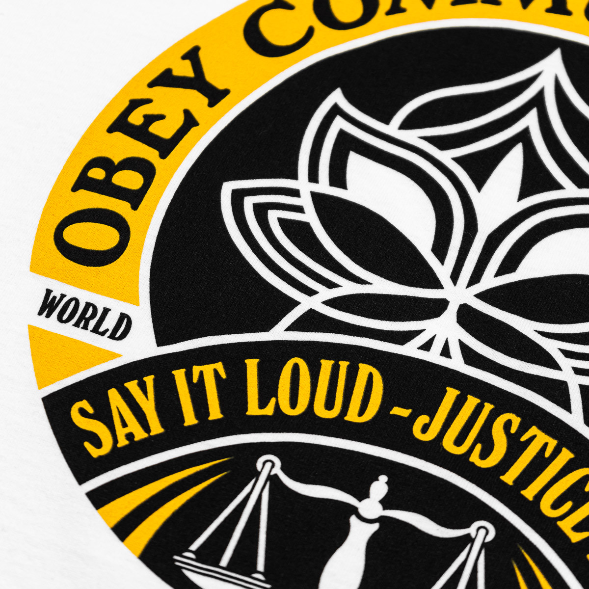 Weißes OBEY Say It Loud Lotus T-Shirt aus 100% Cotton (170g/m Single Jersey) mit gedrucktem Artwork auf der linken Brust und dem Rücken.