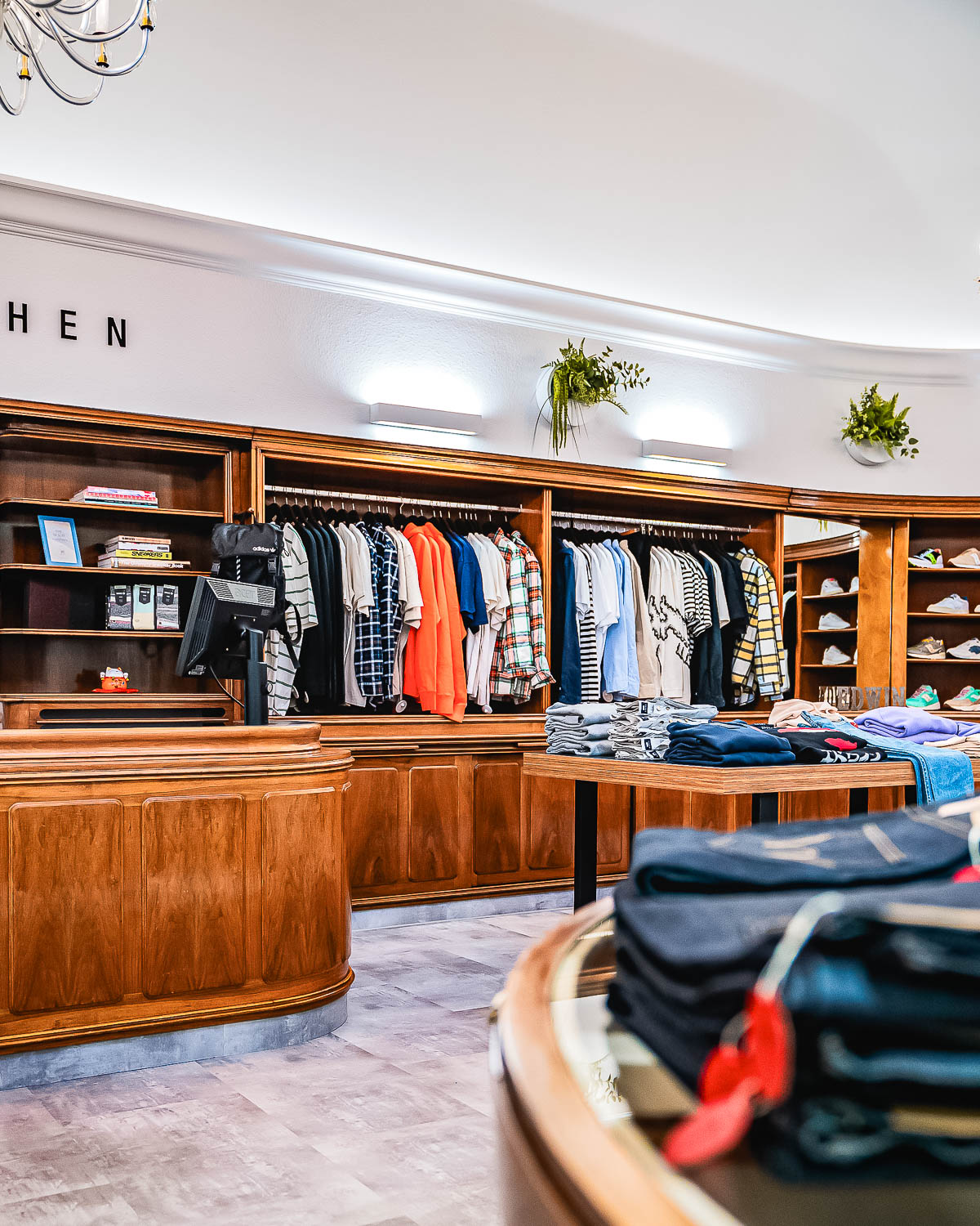 Alle Holz-Einbauten sind denkmalgeschützt und in dieser Form einzigartig in der Stadt. Bei der Neugestaltung der Fläche war uns wichtig, den Charme der Vergangenheit zu erhalten und mit modernem, zeitgemäßem Interieur zu verbinden. Die Optik des industriellen Betonfußbodens und der „schwebenden“ Holzeinbauten wird mit viel Licht ergänzt und erzeugt eine lichtdurchflutete, offene Atmosphäre.