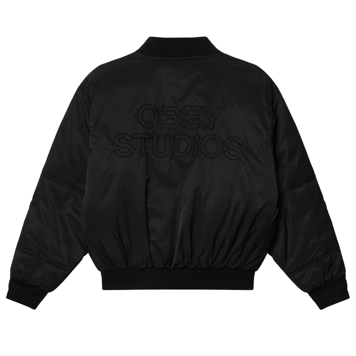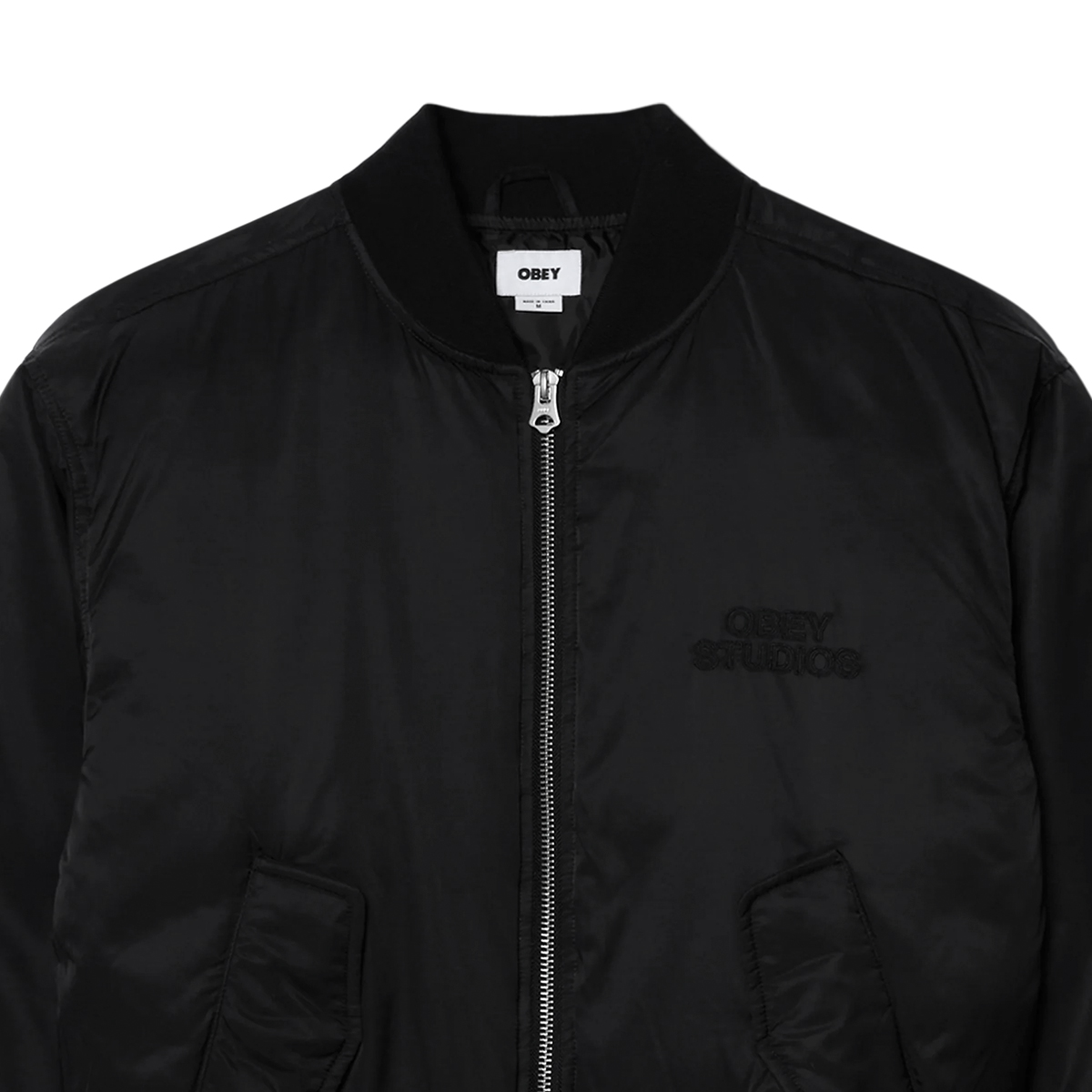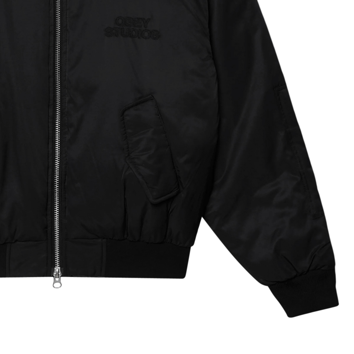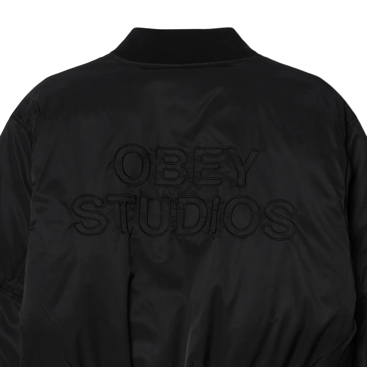 Schwarzes OBEY Studios MA-1 Bomber Jacket aus einem robusten Nylon/Baumwolle Mix mit gesticktem Artwork auf der linken Brust und dem Rücken. Der Rip-Kragen, die 2 Seitlichen Taschen und die elastischen Bündchen sorgen für den perfekten Look.