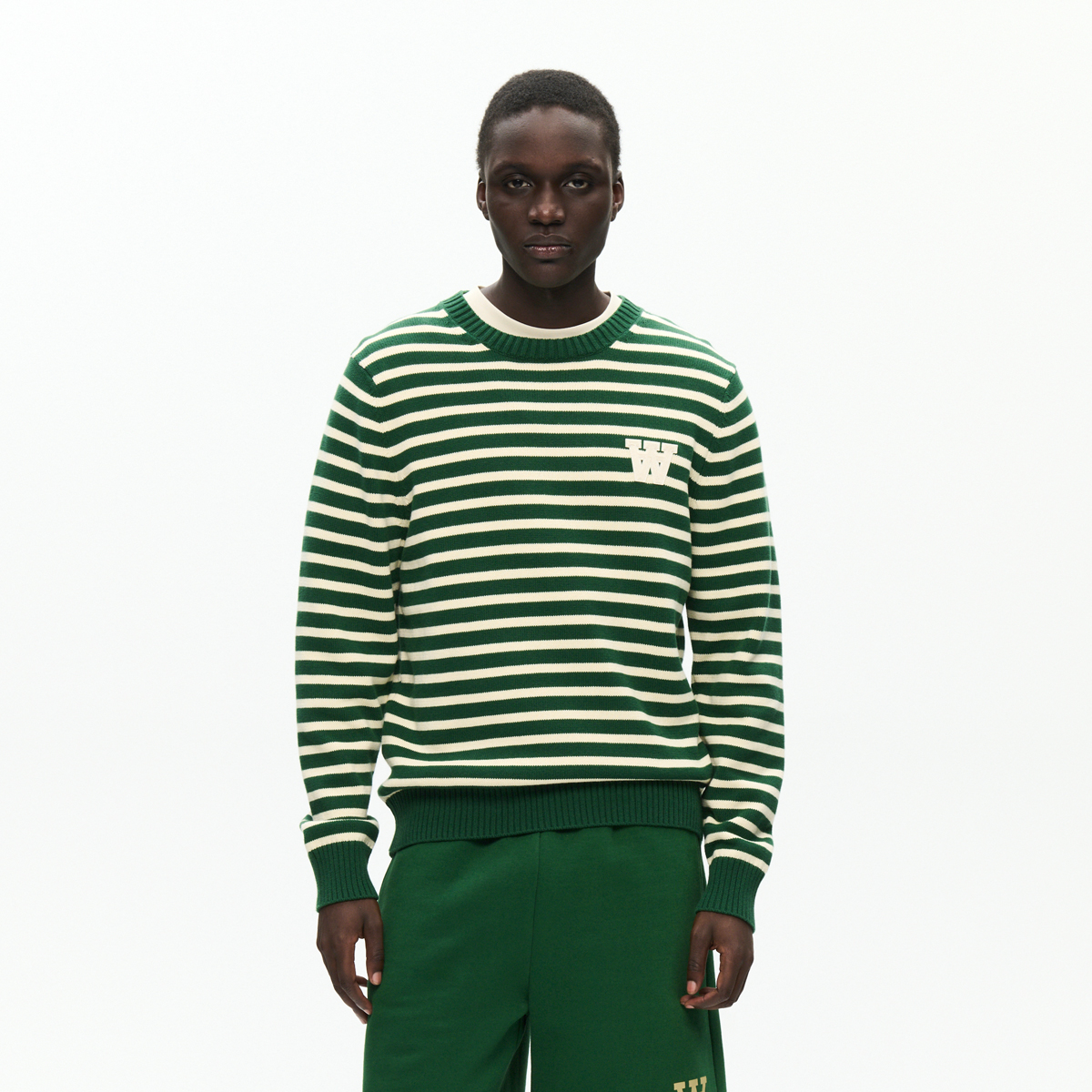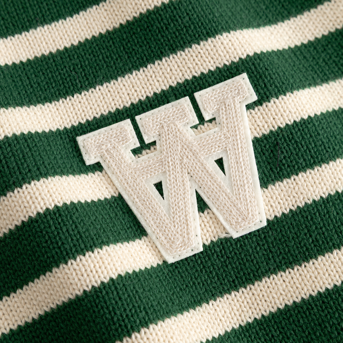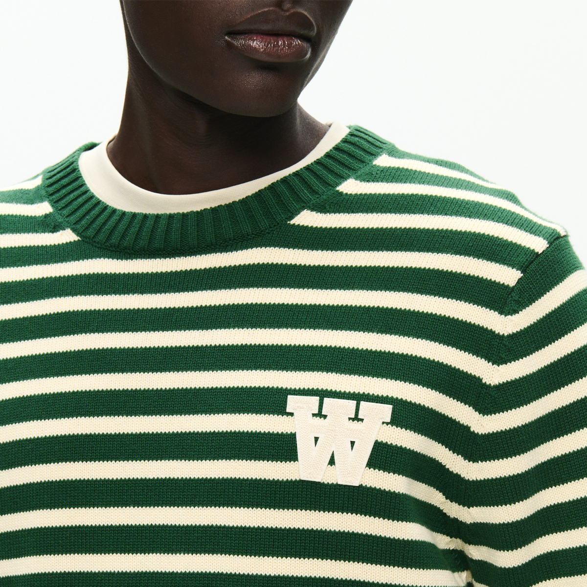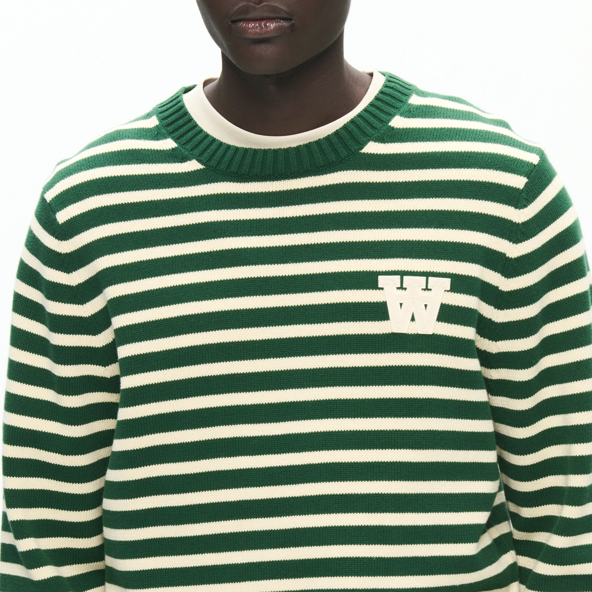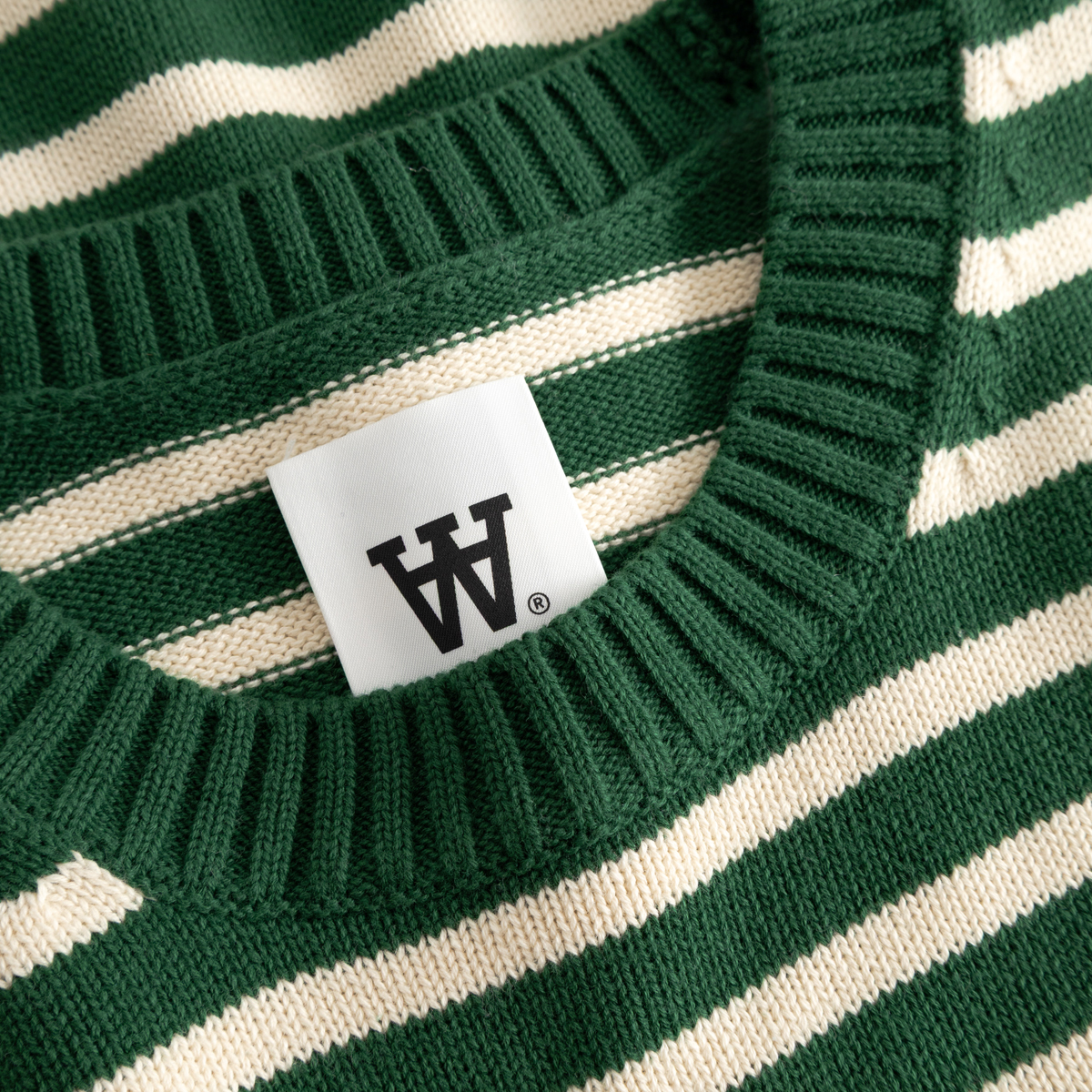 Der WOOD WOOD Tay Stripe Strickpullover kommt in einem Unisex Standard-Fit und aus 100% Baumwolle. Der Sweater hat einen Rundhals-Ausschnitt und elastische Rip-Bündchen. Auf der linken Brust befindet sich ein gesticktes Double-A Patch.