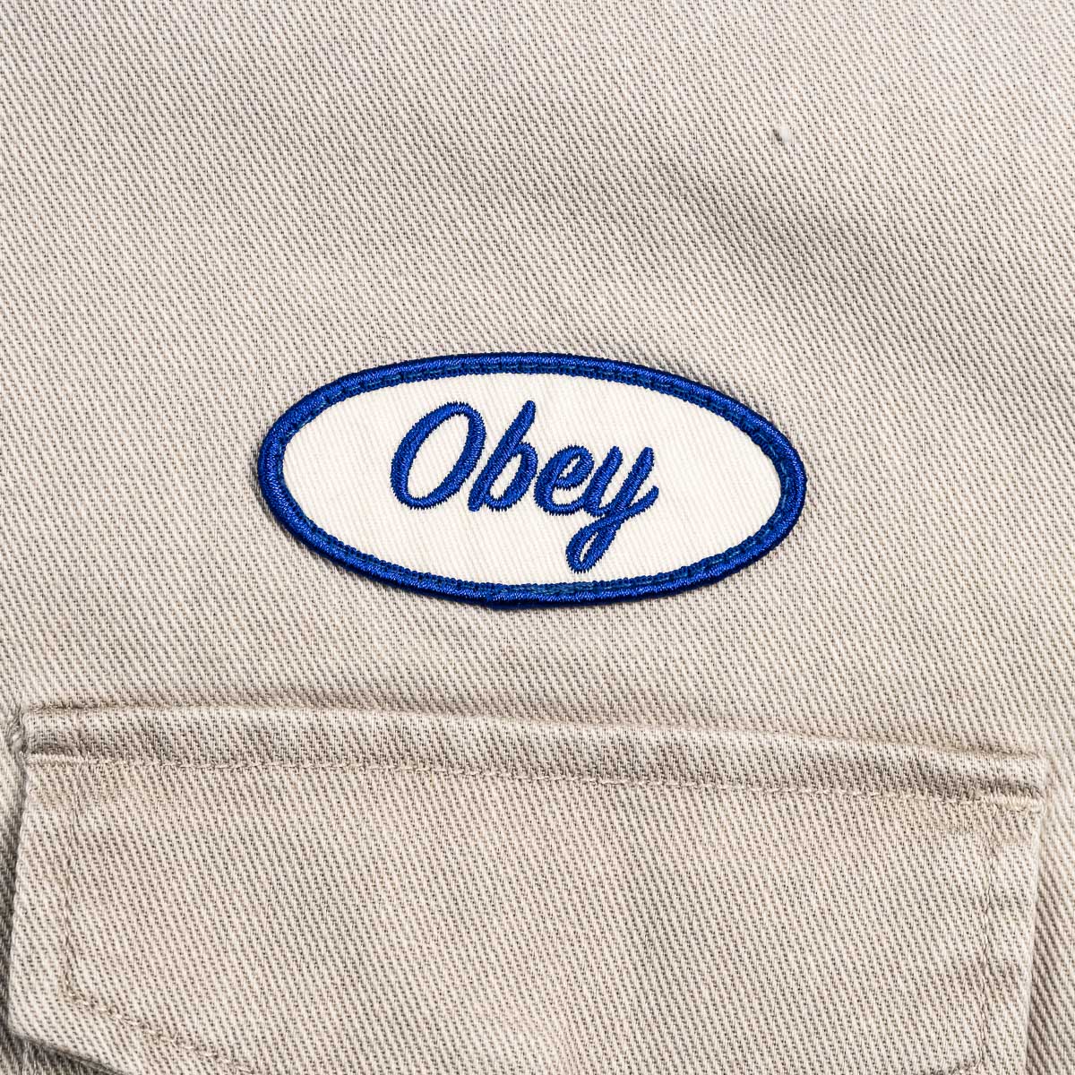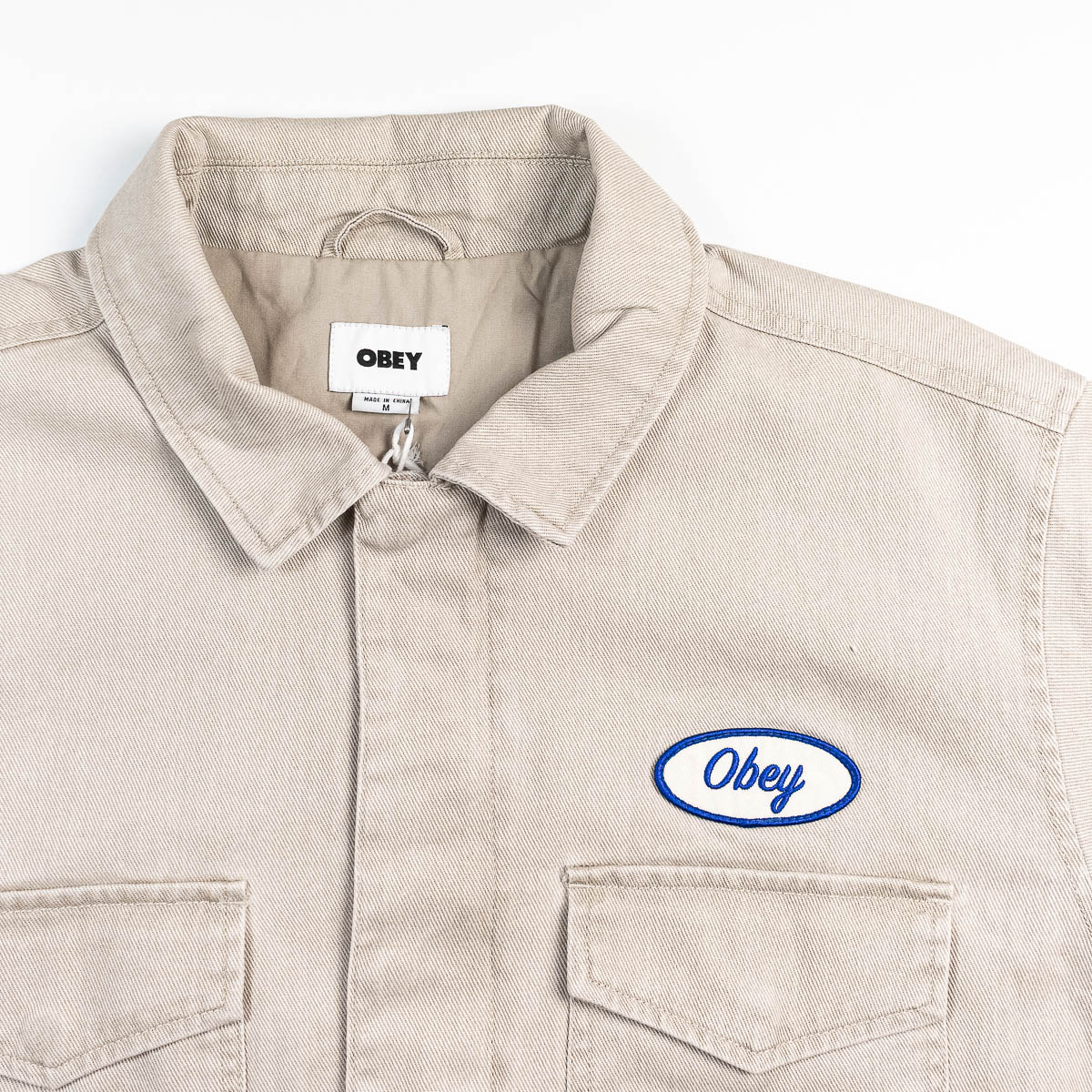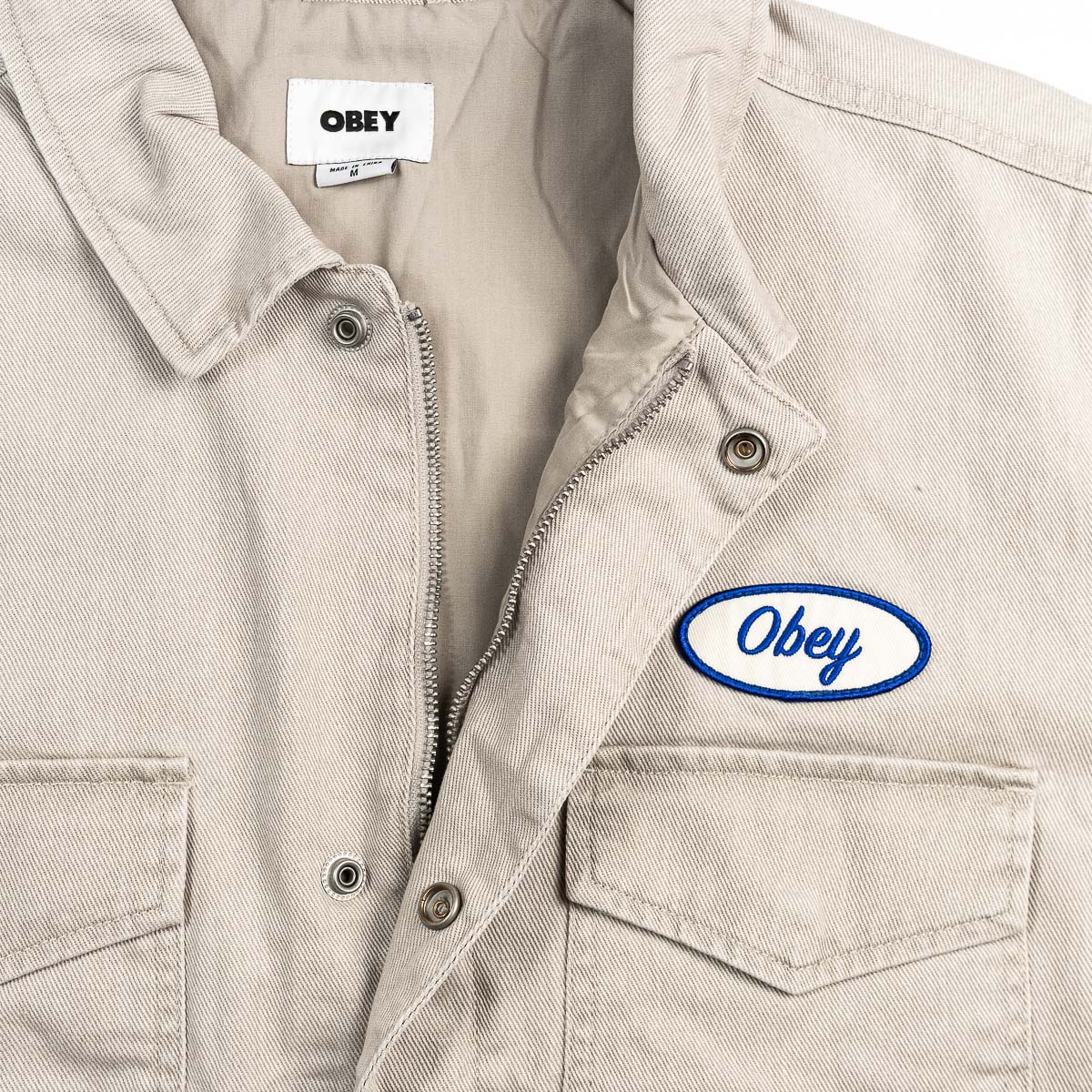 Graues OBEY Tilton Work Jacket in einem gewaschenem 13,5oz Cotton Denim mit seitlichen Taschen, zwei Brusttaschen und gesticktem Logo auf der Brust.