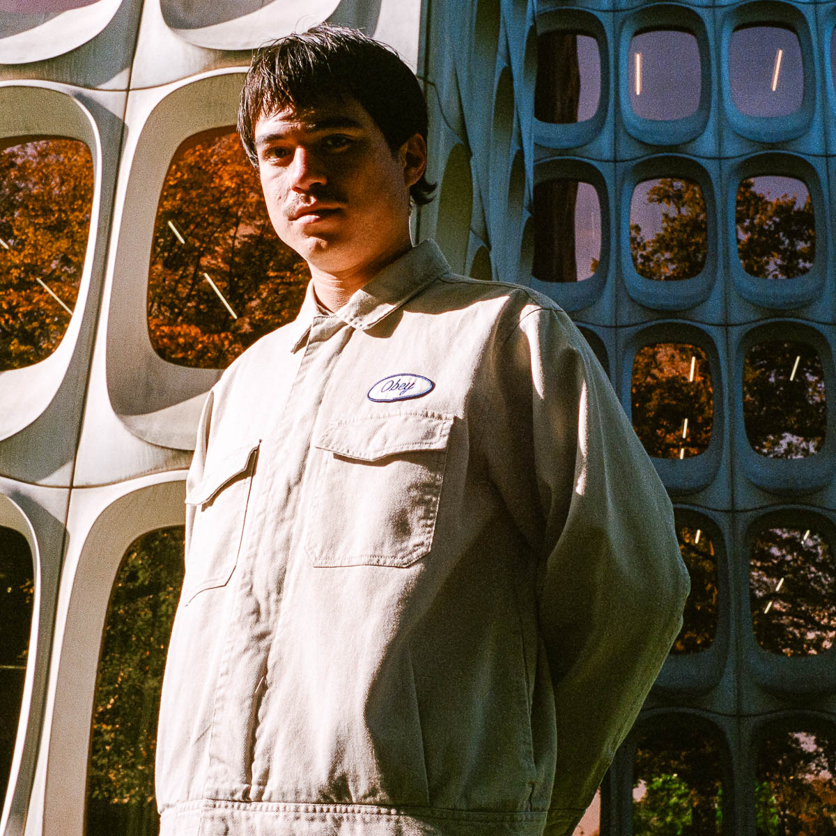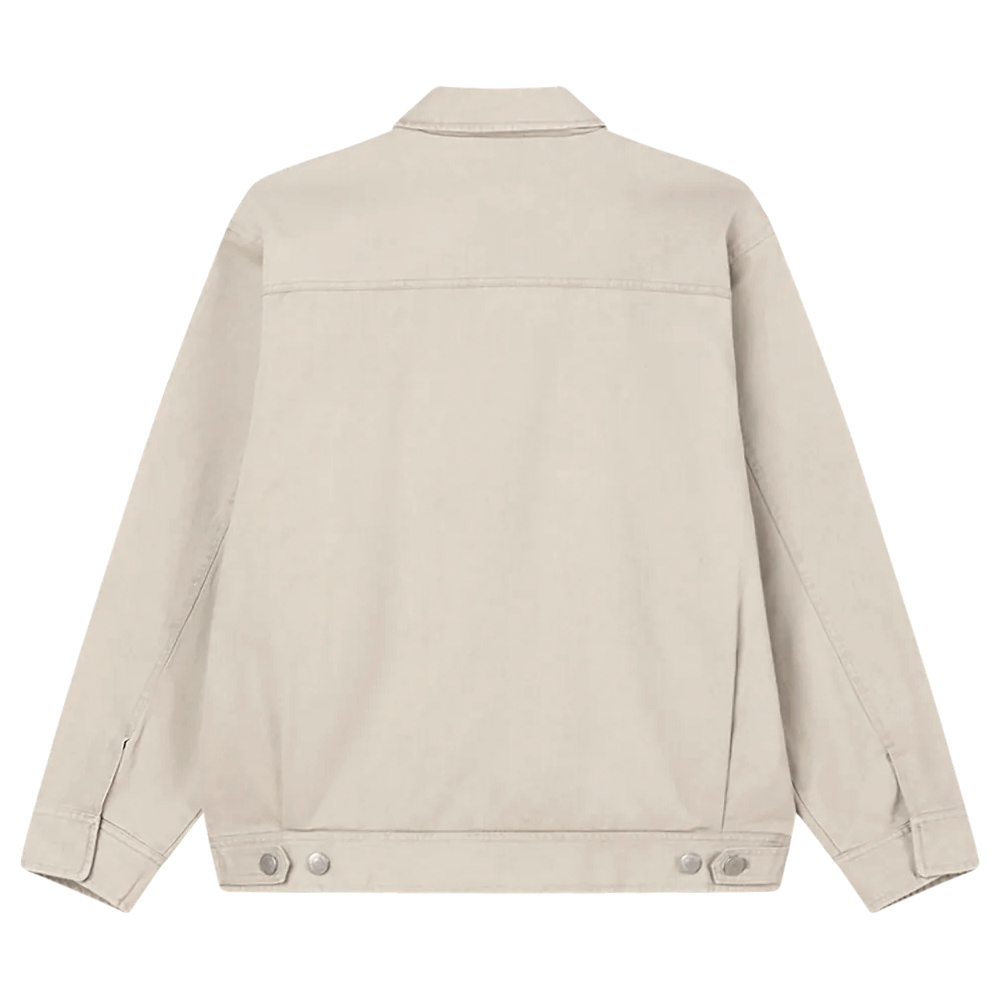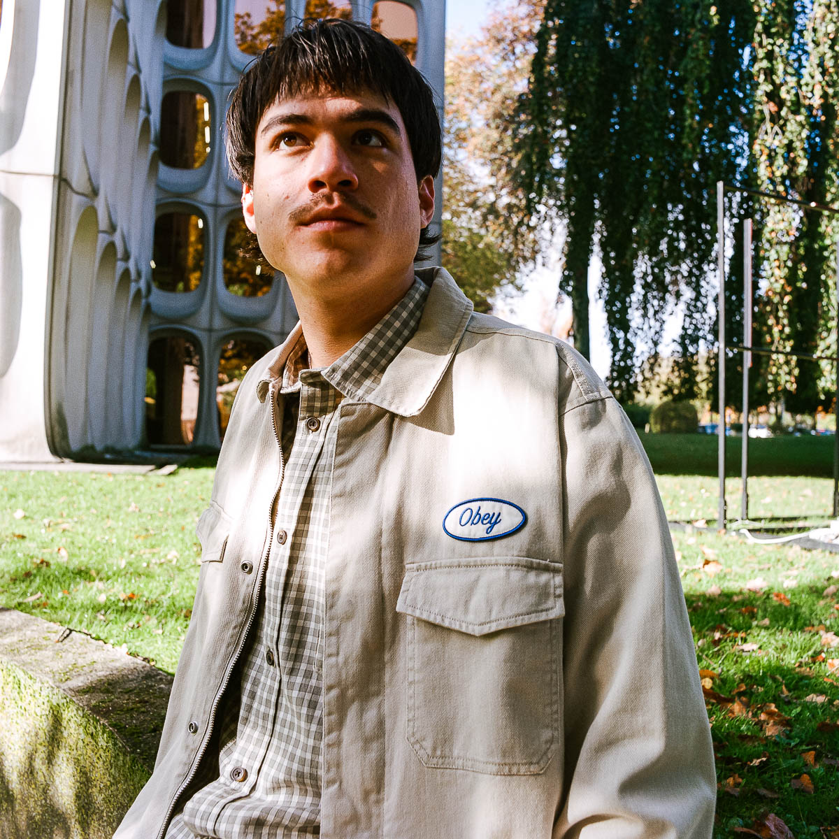 Graues OBEY Tilton Work Jacket in einem gewaschenem 13,5oz Cotton Denim mit seitlichen Taschen, zwei Brusttaschen und gesticktem Logo auf der Brust.