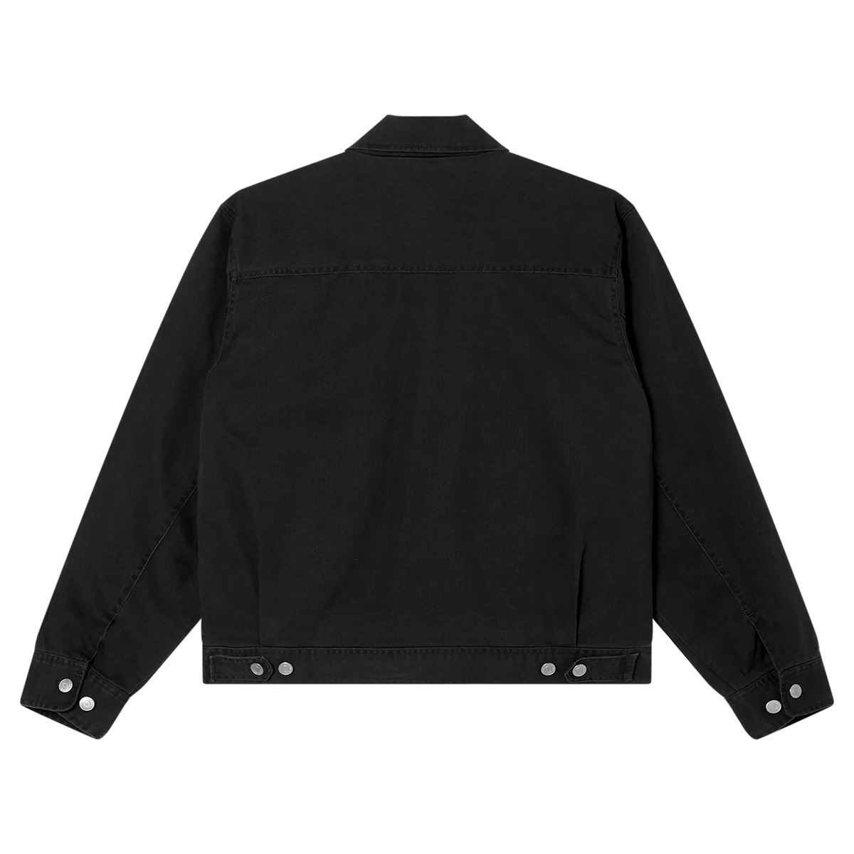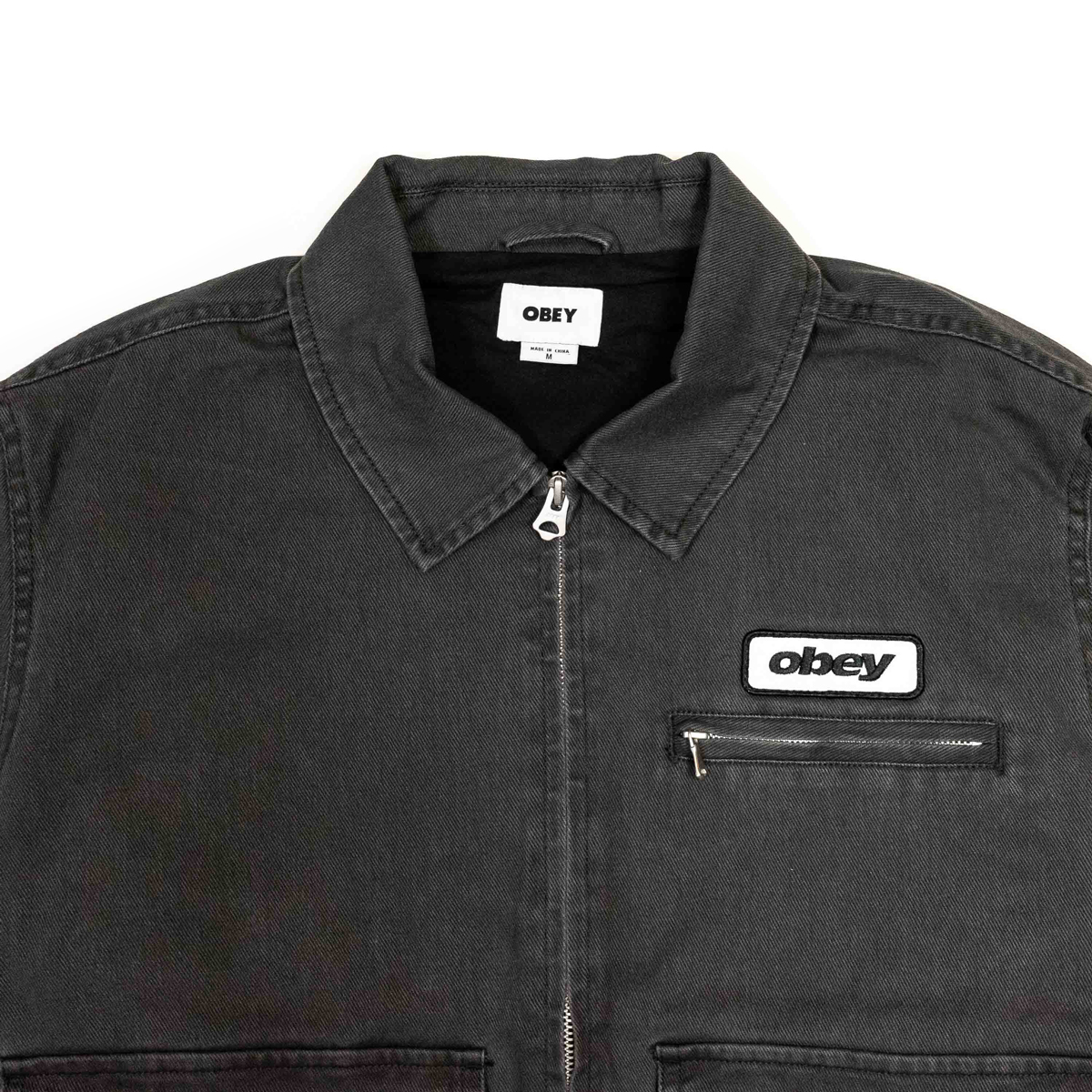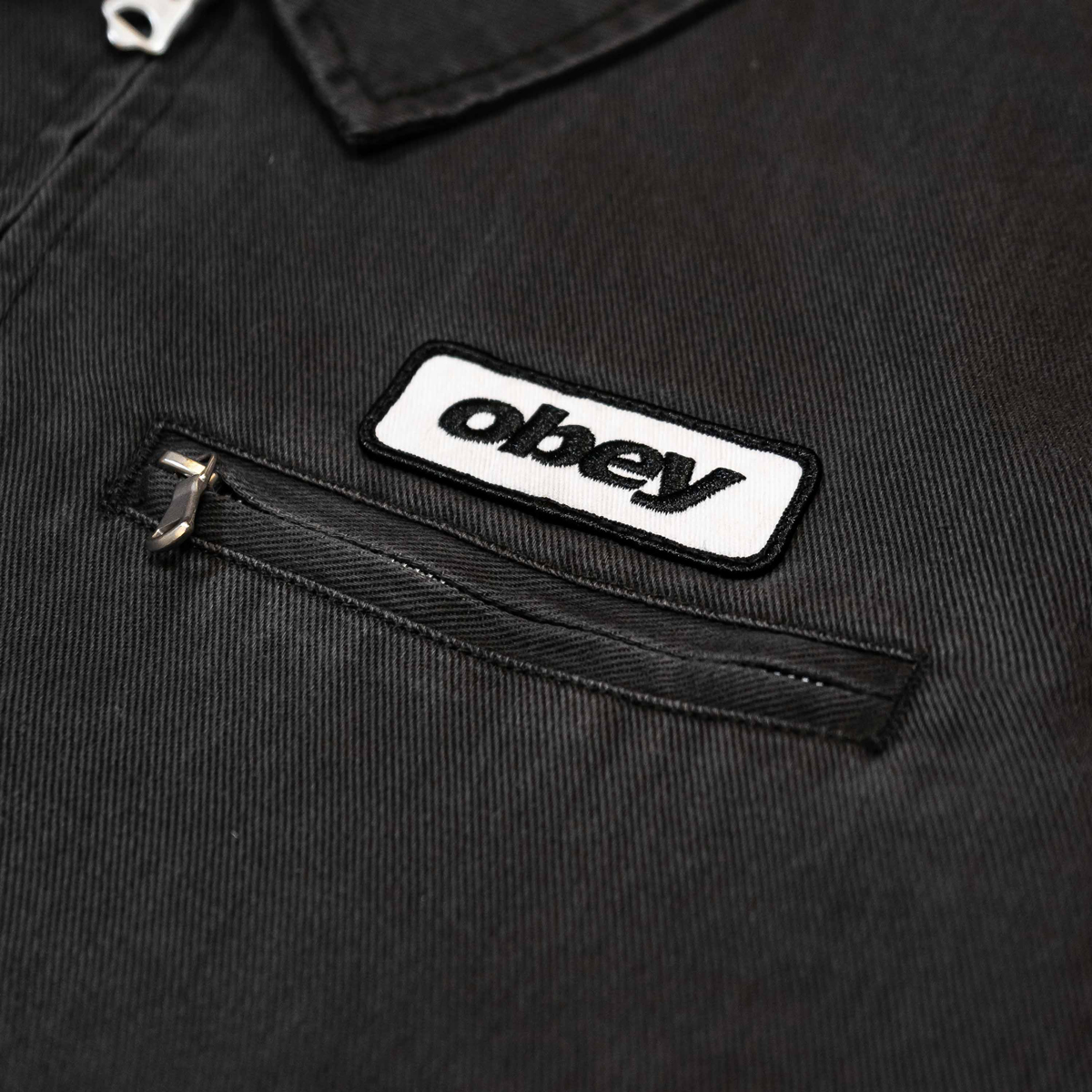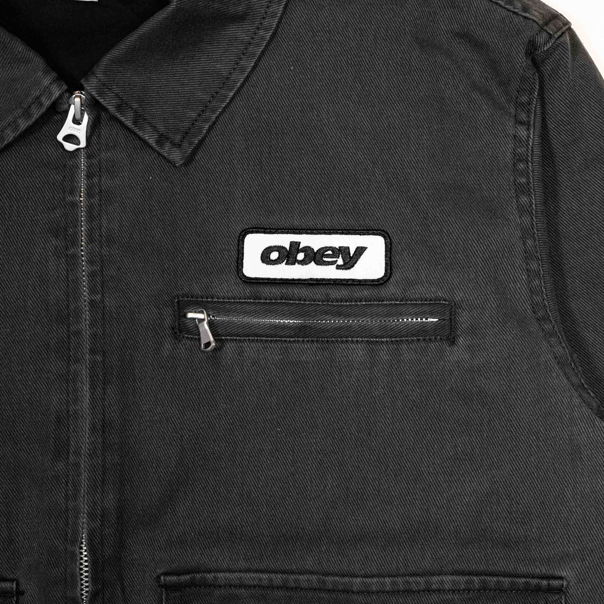 Schwarzes OBEY Walter Work Jacket in einem used gewaschenem 13,5oz Cotton Denim mit Seitennaht-Taschen, zwei aufgesetzten Taschen mit Drucknopf und einem gesticktem Logo-Patch auf der Brust.