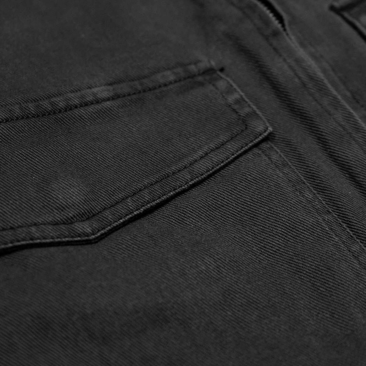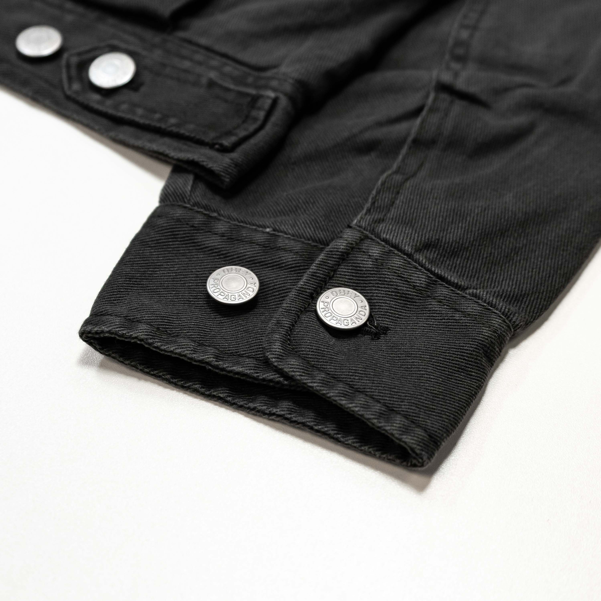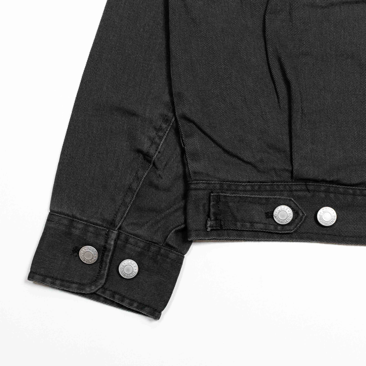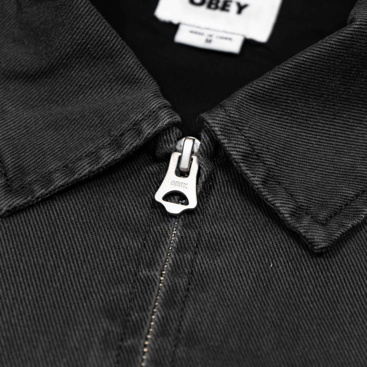 Schwarzes OBEY Walter Work Jacket in einem used gewaschenem 13,5oz Cotton Denim mit Seitennaht-Taschen, zwei aufgesetzten Taschen mit Drucknopf und einem gesticktem Logo-Patch auf der Brust.