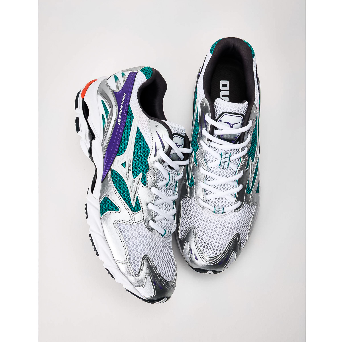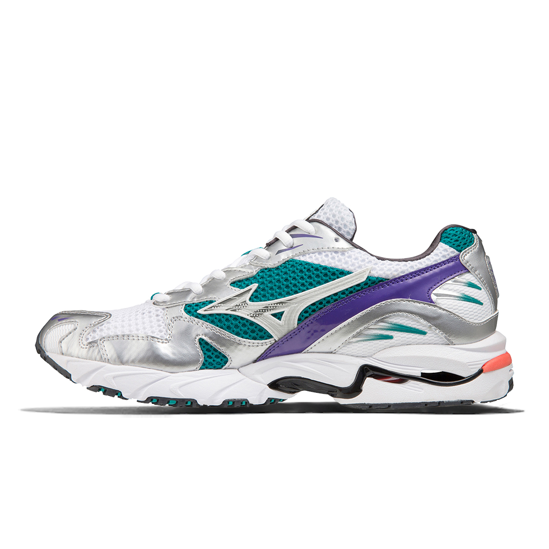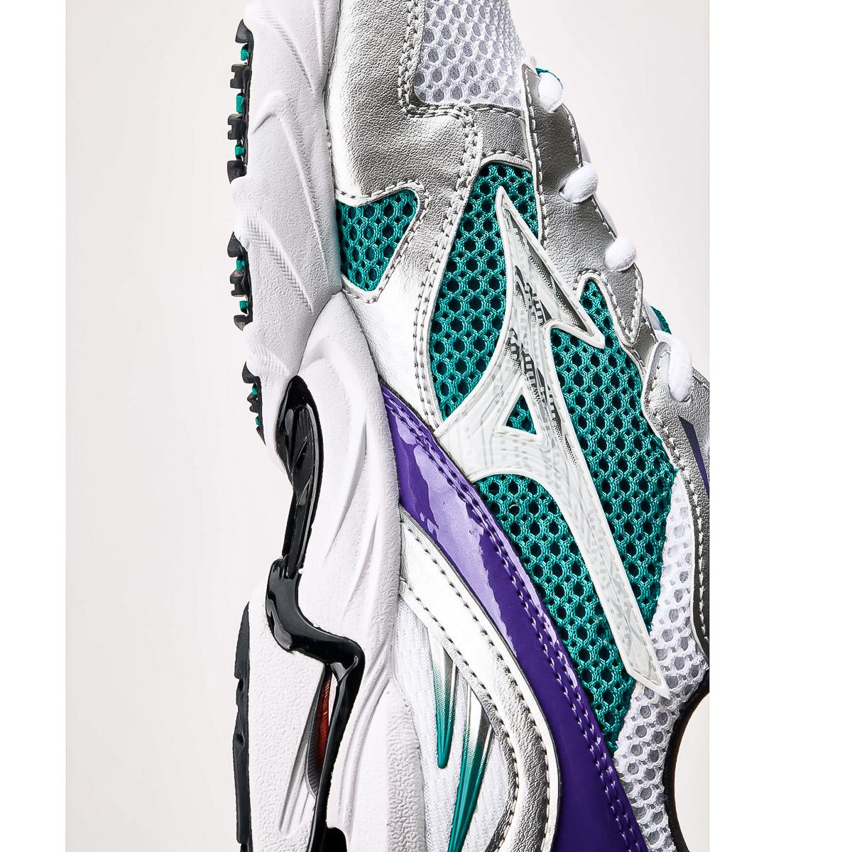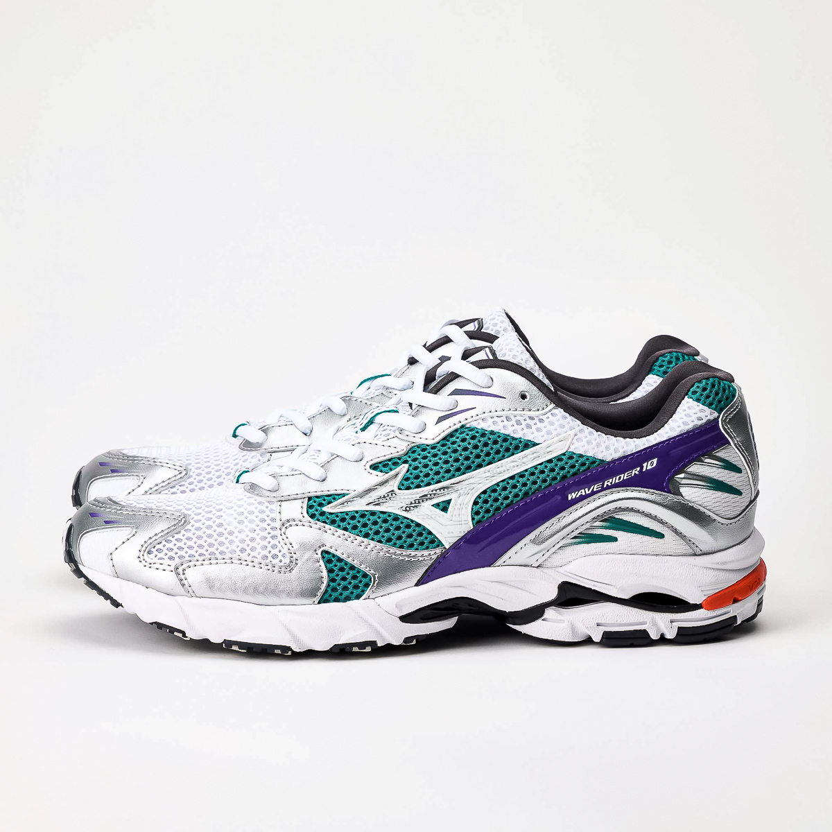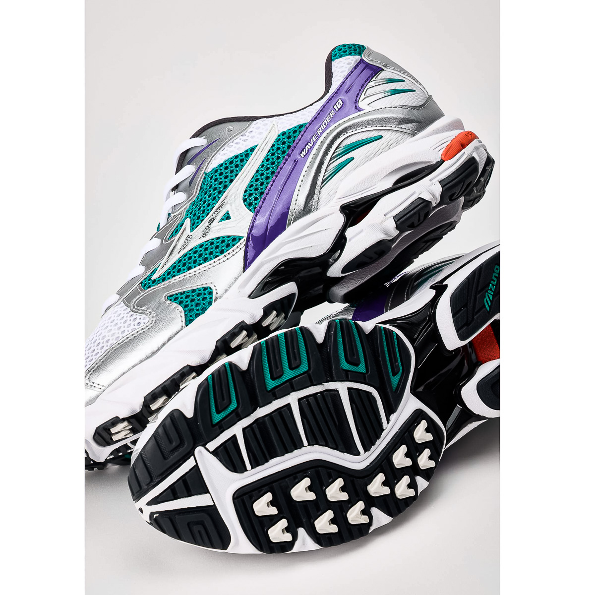 - X10 - Extrem langlebiger Mizuno-Carbongummi, der eine längere Haltbarkeit in stark beanspruchten Bereichen ermöglicht und beim Fersenauftritt für mehr Traktion sorgt